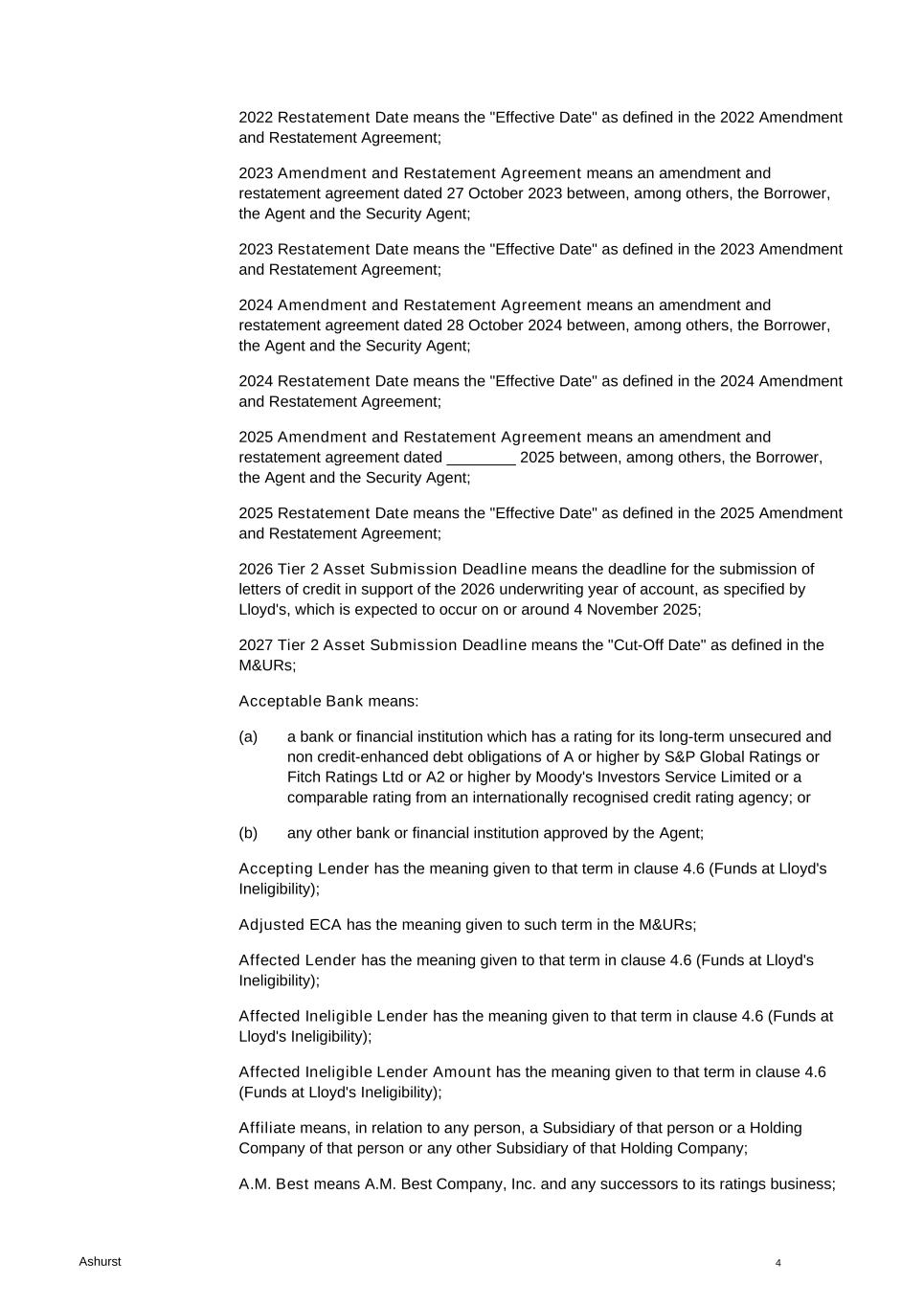 Ashurst 4 2022 Restatement Date means the "Effective Date" as defined in the 2022 Amendment and Restatement Agreement; 2023 Amendment and Restatement Agreement means an amendment and restatement agreement dated 27 October 2023 between, among others, the Borrower, the Agent and the Security Agent; 2023 Restatement Date means the "Effective Date" as defined in the 2023 Amendment and Restatement Agreement; 2024 Amendment and Restatement Agreement means an amendment and restatement agreement dated 28 October 2024 between, among others, the Borrower, the Agent and the Security Agent; 2024 Restatement Date means the "Effective Date" as defined in the 2024 Amendment and Restatement Agreement; 2025 Amendment and Restatement Agreement means an amendment and restatement agreement dated ________ 2025 between, among others, the Borrower, the Agent and the Security Agent; 2025 Restatement Date means the "Effective Date" as defined in the 2025 Amendment and Restatement Agreement; 2026 Tier 2 Asset Submission Deadline means the deadline for the submission of letters of credit in support of the 2026 underwriting year of account, as specified by Lloyd's, which is expected to occur on or around 4 November 2025; 2027 Tier 2 Asset Submission Deadline means the "Cut-Off Date" as defined in the M&URs; Acceptable Bank means: (a) a bank or financial institution which has a rating for its long-term unsecured and non credit-enhanced debt obligations of A or higher by S&P Global Ratings or Fitch Ratings Ltd or A2 or higher by Moody's Investors Service Limited or a comparable rating from an internationally recognised credit rating agency; or (b) any other bank or financial institution approved by the Agent; Accepting Lender has the meaning given to that term in clause 4.6 (Funds at Lloyd's Ineligibility); Adjusted ECA has the meaning given to such term in the M&URs; Affected Lender has the meaning given to that term in clause 4.6 (Funds at Lloyd's Ineligibility); Affected Ineligible Lender has the meaning given to that term in clause 4.6 (Funds at Lloyd's Ineligibility); Affected Ineligible Lender Amount has the meaning given to that term in clause 4.6 (Funds at Lloyd's Ineligibility); Affiliate means, in relation to any person, a Subsidiary of that person or a Holding Company of that person or any other Subsidiary of that Holding Company; A.M. Best means A.M. Best Company, Inc. and any successors to its ratings business;