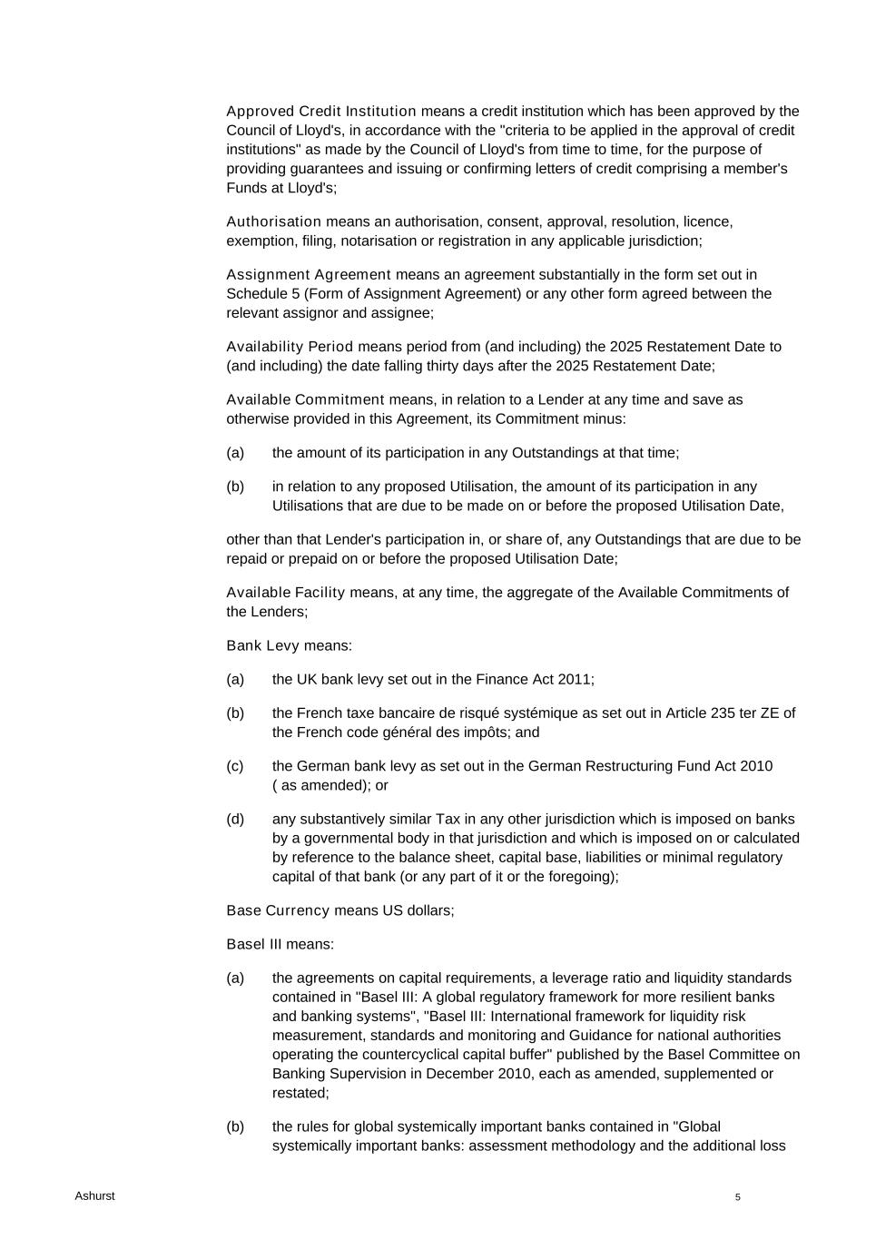 Ashurst 5 Approved Credit Institution means a credit institution which has been approved by the Council of Lloyd's, in accordance with the "criteria to be applied in the approval of credit institutions" as made by the Council of Lloyd's from time to time, for the purpose of providing guarantees and issuing or confirming letters of credit comprising a member's Funds at Lloyd's; Authorisation means an authorisation, consent, approval, resolution, licence, exemption, filing, notarisation or registration in any applicable jurisdiction; Assignment Agreement means an agreement substantially in the form set out in Schedule 5 (Form of Assignment Agreement) or any other form agreed between the relevant assignor and assignee; Availability Period means period from (and including) the 2025 Restatement Date to (and including) the date falling thirty days after the 2025 Restatement Date; Available Commitment means, in relation to a Lender at any time and save as otherwise provided in this Agreement, its Commitment minus: (a) the amount of its participation in any Outstandings at that time; (b) in relation to any proposed Utilisation, the amount of its participation in any Utilisations that are due to be made on or before the proposed Utilisation Date, other than that Lender's participation in, or share of, any Outstandings that are due to be repaid or prepaid on or before the proposed Utilisation Date; Available Facility means, at any time, the aggregate of the Available Commitments of the Lenders; Bank Levy means: (a) the UK bank levy set out in the Finance Act 2011; (b) the French taxe bancaire de risqué systémique as set out in Article 235 ter ZE of the French code général des impôts; and (c) the German bank levy as set out in the German Restructuring Fund Act 2010 ( as amended); or (d) any substantively similar Tax in any other jurisdiction which is imposed on banks by a governmental body in that jurisdiction and which is imposed on or calculated by reference to the balance sheet, capital base, liabilities or minimal regulatory capital of that bank (or any part of it or the foregoing); Base Currency means US dollars; Basel III means: (a) the agreements on capital requirements, a leverage ratio and liquidity standards contained in "Basel III: A global regulatory framework for more resilient banks and banking systems", "Basel III: International framework for liquidity risk measurement, standards and monitoring and Guidance for national authorities operating the countercyclical capital buffer" published by the Basel Committee on Banking Supervision in December 2010, each as amended, supplemented or restated; (b) the rules for global systemically important banks contained in "Global systemically important banks: assessment methodology and the additional loss