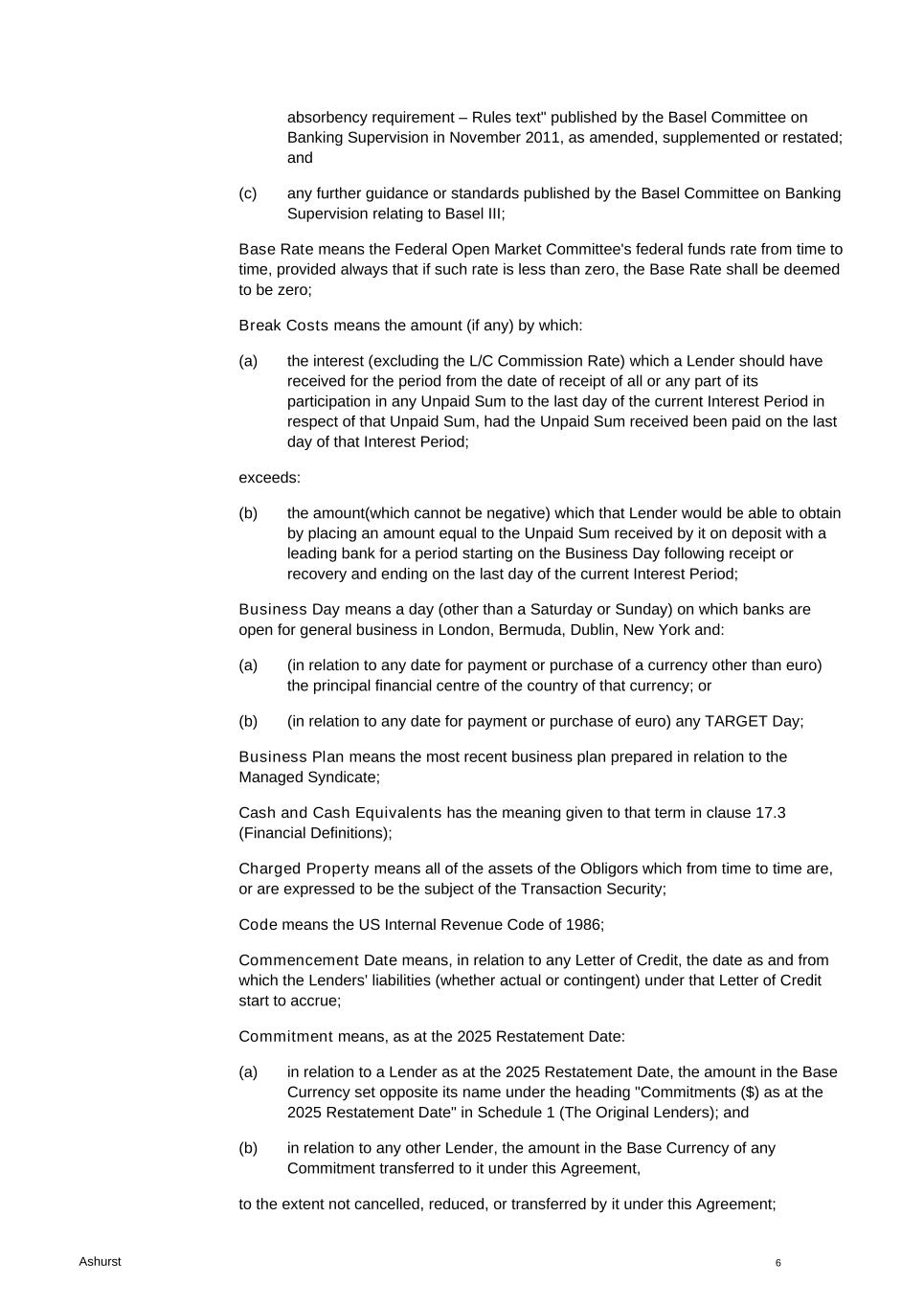 Ashurst 6 absorbency requirement – Rules text" published by the Basel Committee on Banking Supervision in November 2011, as amended, supplemented or restated; and (c) any further guidance or standards published by the Basel Committee on Banking Supervision relating to Basel III; Base Rate means the Federal Open Market Committee's federal funds rate from time to time, provided always that if such rate is less than zero, the Base Rate shall be deemed to be zero; Break Costs means the amount (if any) by which: (a) the interest (excluding the L/C Commission Rate) which a Lender should have received for the period from the date of receipt of all or any part of its participation in any Unpaid Sum to the last day of the current Interest Period in respect of that Unpaid Sum, had the Unpaid Sum received been paid on the last day of that Interest Period; exceeds: (b) the amount(which cannot be negative) which that Lender would be able to obtain by placing an amount equal to the Unpaid Sum received by it on deposit with a leading bank for a period starting on the Business Day following receipt or recovery and ending on the last day of the current Interest Period; Business Day means a day (other than a Saturday or Sunday) on which banks are open for general business in London, Bermuda, Dublin, New York and: (a) (in relation to any date for payment or purchase of a currency other than euro) the principal financial centre of the country of that currency; or (b) (in relation to any date for payment or purchase of euro) any TARGET Day; Business Plan means the most recent business plan prepared in relation to the Managed Syndicate; Cash and Cash Equivalents has the meaning given to that term in clause 17.3 (Financial Definitions); Charged Property means all of the assets of the Obligors which from time to time are, or are expressed to be the subject of the Transaction Security; Code means the US Internal Revenue Code of 1986; Commencement Date means, in relation to any Letter of Credit, the date as and from which the Lenders' liabilities (whether actual or contingent) under that Letter of Credit start to accrue; Commitment means, as at the 2025 Restatement Date: (a) in relation to a Lender as at the 2025 Restatement Date, the amount in the Base Currency set opposite its name under the heading "Commitments ($) as at the 2025 Restatement Date" in Schedule 1 (The Original Lenders); and (b) in relation to any other Lender, the amount in the Base Currency of any Commitment transferred to it under this Agreement, to the extent not cancelled, reduced, or transferred by it under this Agreement;