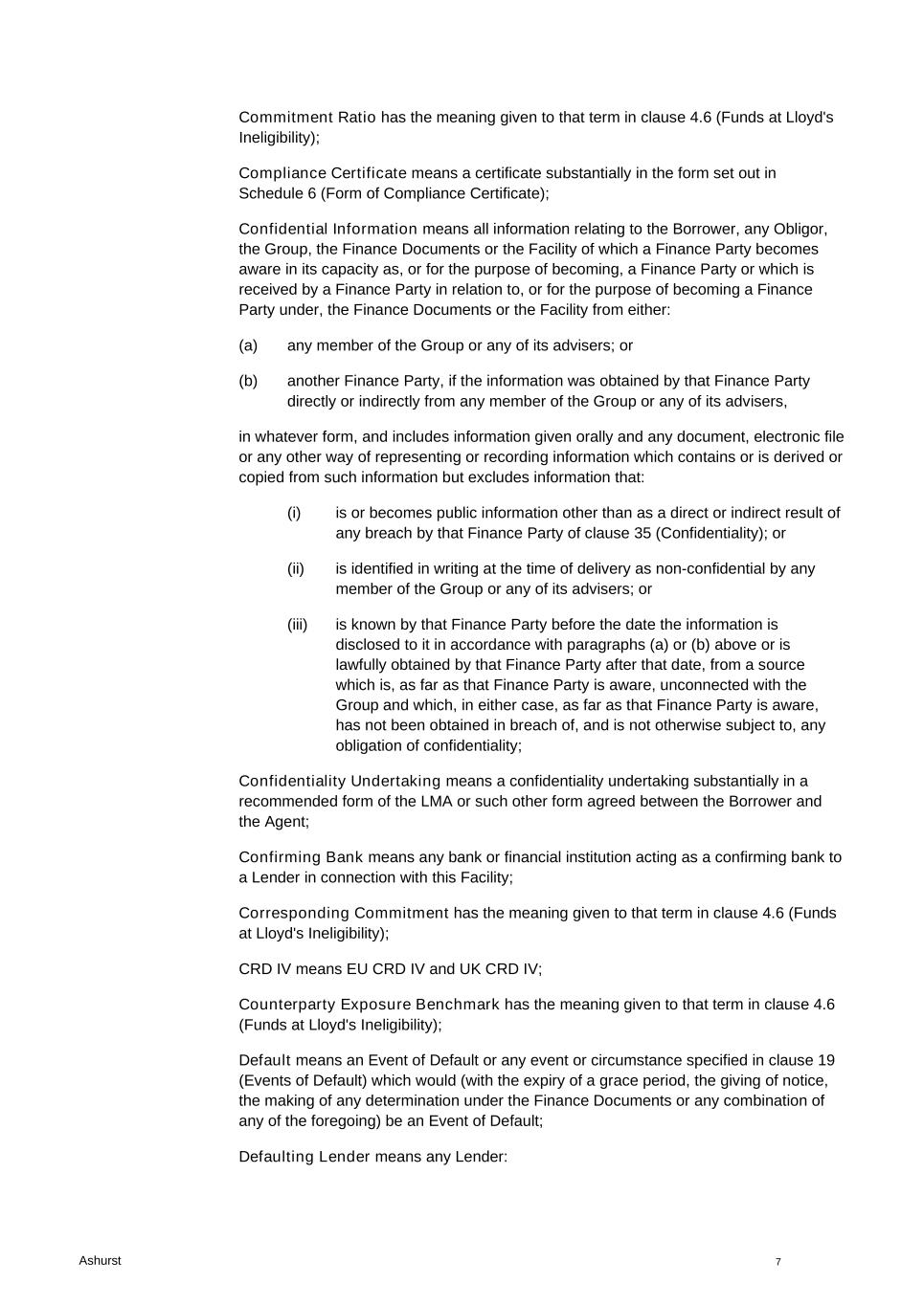 Ashurst 7 Commitment Ratio has the meaning given to that term in clause 4.6 (Funds at Lloyd's Ineligibility); Compliance Certificate means a certificate substantially in the form set out in Schedule 6 (Form of Compliance Certificate); Confidential Information means all information relating to the Borrower, any Obligor, the Group, the Finance Documents or the Facility of which a Finance Party becomes aware in its capacity as, or for the purpose of becoming, a Finance Party or which is received by a Finance Party in relation to, or for the purpose of becoming a Finance Party under, the Finance Documents or the Facility from either: (a) any member of the Group or any of its advisers; or (b) another Finance Party, if the information was obtained by that Finance Party directly or indirectly from any member of the Group or any of its advisers, in whatever form, and includes information given orally and any document, electronic file or any other way of representing or recording information which contains or is derived or copied from such information but excludes information that: (i) is or becomes public information other than as a direct or indirect result of any breach by that Finance Party of clause 35 (Confidentiality); or (ii) is identified in writing at the time of delivery as non-confidential by any member of the Group or any of its advisers; or (iii) is known by that Finance Party before the date the information is disclosed to it in accordance with paragraphs (a) or (b) above or is lawfully obtained by that Finance Party after that date, from a source which is, as far as that Finance Party is aware, unconnected with the Group and which, in either case, as far as that Finance Party is aware, has not been obtained in breach of, and is not otherwise subject to, any obligation of confidentiality; Confidentiality Undertaking means a confidentiality undertaking substantially in a recommended form of the LMA or such other form agreed between the Borrower and the Agent; Confirming Bank means any bank or financial institution acting as a confirming bank to a Lender in connection with this Facility; Corresponding Commitment has the meaning given to that term in clause 4.6 (Funds at Lloyd's Ineligibility); CRD IV means EU CRD IV and UK CRD IV; Counterparty Exposure Benchmark has the meaning given to that term in clause 4.6 (Funds at Lloyd's Ineligibility); Default means an Event of Default or any event or circumstance specified in clause 19 (Events of Default) which would (with the expiry of a grace period, the giving of notice, the making of any determination under the Finance Documents or any combination of any of the foregoing) be an Event of Default; Defaulting Lender means any Lender:
