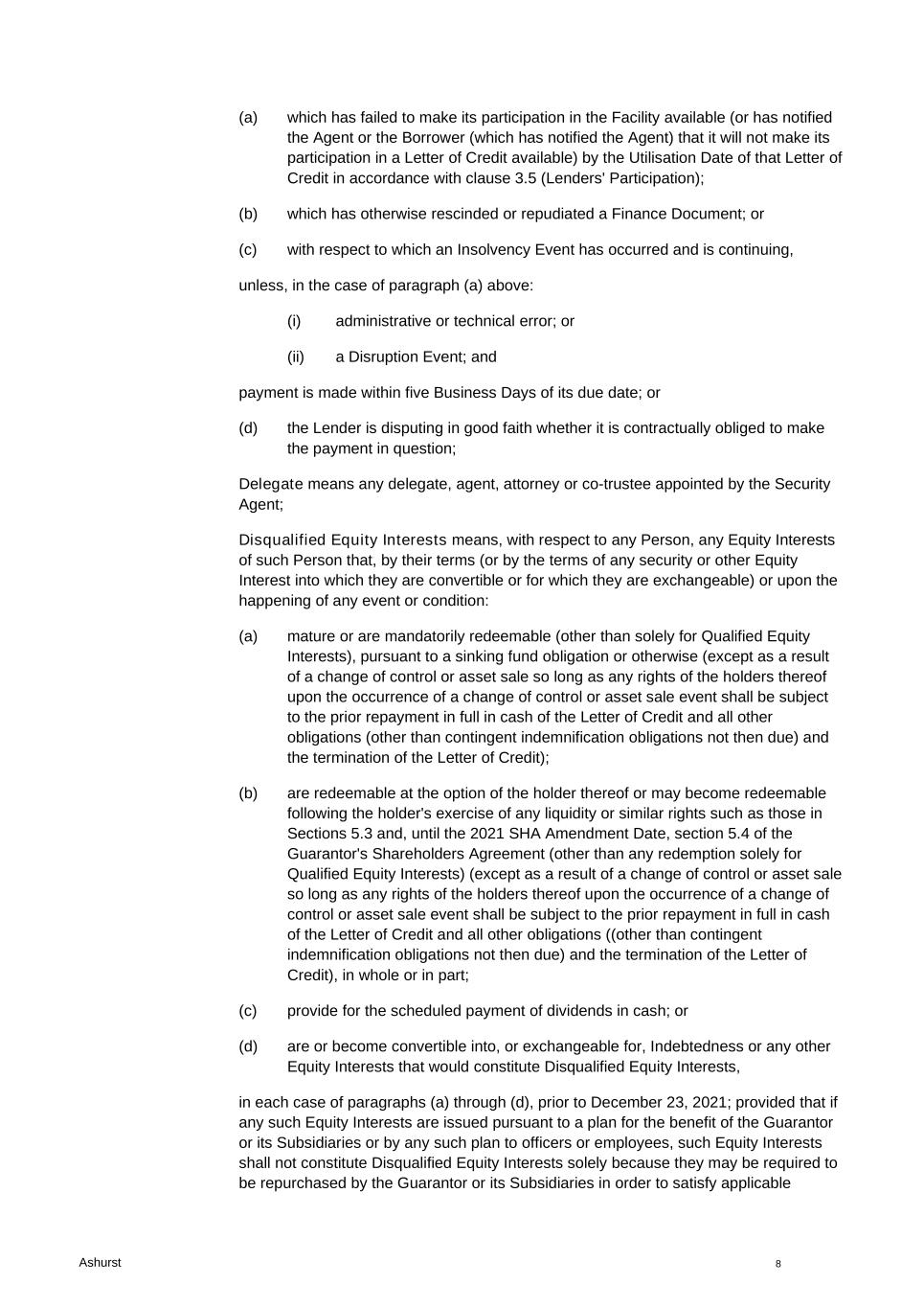 Ashurst 8 (a) which has failed to make its participation in the Facility available (or has notified the Agent or the Borrower (which has notified the Agent) that it will not make its participation in a Letter of Credit available) by the Utilisation Date of that Letter of Credit in accordance with clause 3.5 (Lenders' Participation); (b) which has otherwise rescinded or repudiated a Finance Document; or (c) with respect to which an Insolvency Event has occurred and is continuing, unless, in the case of paragraph (a) above: (i) administrative or technical error; or (ii) a Disruption Event; and payment is made within five Business Days of its due date; or (d) the Lender is disputing in good faith whether it is contractually obliged to make the payment in question; Delegate means any delegate, agent, attorney or co-trustee appointed by the Security Agent; Disqualified Equity Interests means, with respect to any Person, any Equity Interests of such Person that, by their terms (or by the terms of any security or other Equity Interest into which they are convertible or for which they are exchangeable) or upon the happening of any event or condition: (a) mature or are mandatorily redeemable (other than solely for Qualified Equity Interests), pursuant to a sinking fund obligation or otherwise (except as a result of a change of control or asset sale so long as any rights of the holders thereof upon the occurrence of a change of control or asset sale event shall be subject to the prior repayment in full in cash of the Letter of Credit and all other obligations (other than contingent indemnification obligations not then due) and the termination of the Letter of Credit); (b) are redeemable at the option of the holder thereof or may become redeemable following the holder's exercise of any liquidity or similar rights such as those in Sections 5.3 and, until the 2021 SHA Amendment Date, section 5.4 of the Guarantor's Shareholders Agreement (other than any redemption solely for Qualified Equity Interests) (except as a result of a change of control or asset sale so long as any rights of the holders thereof upon the occurrence of a change of control or asset sale event shall be subject to the prior repayment in full in cash of the Letter of Credit and all other obligations ((other than contingent indemnification obligations not then due) and the termination of the Letter of Credit), in whole or in part; (c) provide for the scheduled payment of dividends in cash; or (d) are or become convertible into, or exchangeable for, Indebtedness or any other Equity Interests that would constitute Disqualified Equity Interests, in each case of paragraphs (a) through (d), prior to December 23, 2021; provided that if any such Equity Interests are issued pursuant to a plan for the benefit of the Guarantor or its Subsidiaries or by any such plan to officers or employees, such Equity Interests shall not constitute Disqualified Equity Interests solely because they may be required to be repurchased by the Guarantor or its Subsidiaries in order to satisfy applicable