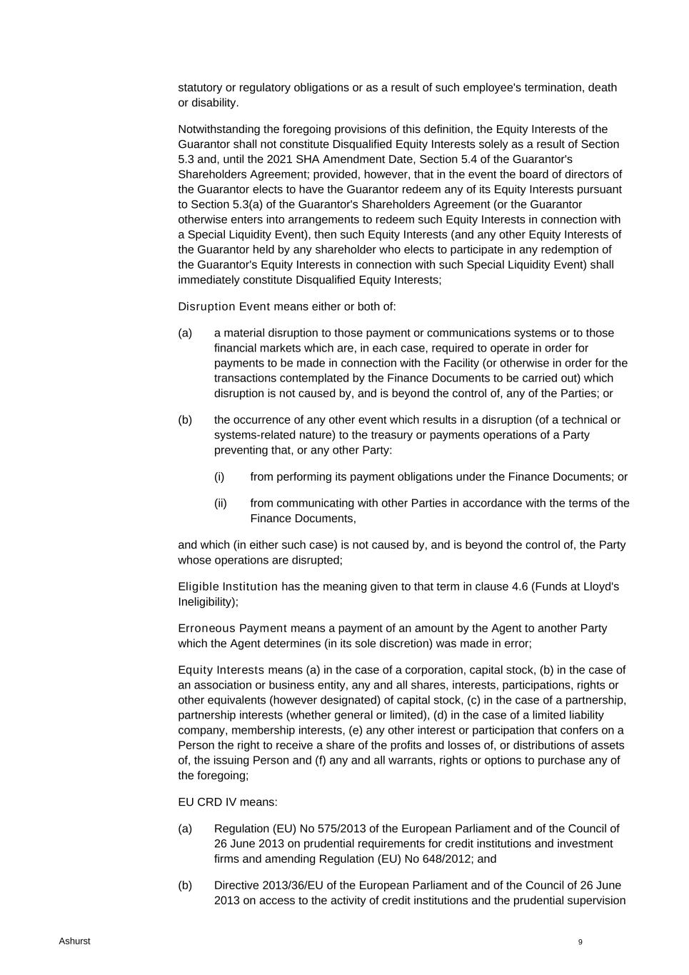 Ashurst 9 statutory or regulatory obligations or as a result of such employee's termination, death or disability. Notwithstanding the foregoing provisions of this definition, the Equity Interests of the Guarantor shall not constitute Disqualified Equity Interests solely as a result of Section 5.3 and, until the 2021 SHA Amendment Date, Section 5.4 of the Guarantor's Shareholders Agreement; provided, however, that in the event the board of directors of the Guarantor elects to have the Guarantor redeem any of its Equity Interests pursuant to Section 5.3(a) of the Guarantor's Shareholders Agreement (or the Guarantor otherwise enters into arrangements to redeem such Equity Interests in connection with a Special Liquidity Event), then such Equity Interests (and any other Equity Interests of the Guarantor held by any shareholder who elects to participate in any redemption of the Guarantor's Equity Interests in connection with such Special Liquidity Event) shall immediately constitute Disqualified Equity Interests; Disruption Event means either or both of: (a) a material disruption to those payment or communications systems or to those financial markets which are, in each case, required to operate in order for payments to be made in connection with the Facility (or otherwise in order for the transactions contemplated by the Finance Documents to be carried out) which disruption is not caused by, and is beyond the control of, any of the Parties; or (b) the occurrence of any other event which results in a disruption (of a technical or systems-related nature) to the treasury or payments operations of a Party preventing that, or any other Party: (i) from performing its payment obligations under the Finance Documents; or (ii) from communicating with other Parties in accordance with the terms of the Finance Documents, and which (in either such case) is not caused by, and is beyond the control of, the Party whose operations are disrupted; Eligible Institution has the meaning given to that term in clause 4.6 (Funds at Lloyd's Ineligibility); Erroneous Payment means a payment of an amount by the Agent to another Party which the Agent determines (in its sole discretion) was made in error; Equity Interests means (a) in the case of a corporation, capital stock, (b) in the case of an association or business entity, any and all shares, interests, participations, rights or other equivalents (however designated) of capital stock, (c) in the case of a partnership, partnership interests (whether general or limited), (d) in the case of a limited liability company, membership interests, (e) any other interest or participation that confers on a Person the right to receive a share of the profits and losses of, or distributions of assets of, the issuing Person and (f) any and all warrants, rights or options to purchase any of the foregoing; EU CRD IV means: (a) Regulation (EU) No 575/2013 of the European Parliament and of the Council of 26 June 2013 on prudential requirements for credit institutions and investment firms and amending Regulation (EU) No 648/2012; and (b) Directive 2013/36/EU of the European Parliament and of the Council of 26 June 2013 on access to the activity of credit institutions and the prudential supervision