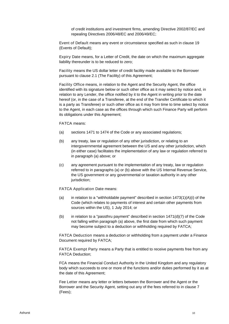 Ashurst 10 of credit institutions and investment firms, amending Directive 2002/87/EC and repealing Directives 2006/48/EC and 2006/49/EC; Event of Default means any event or circumstance specified as such in clause 19 (Events of Default); Expiry Date means, for a Letter of Credit, the date on which the maximum aggregate liability thereunder is to be reduced to zero; Facility means the US dollar letter of credit facility made available to the Borrower pursuant to clause 2.1 (The Facility) of this Agreement; Facility Office means, in relation to the Agent and the Security Agent, the office identified with its signature below or such other office as it may select by notice and, in relation to any Lender, the office notified by it to the Agent in writing prior to the date hereof (or, in the case of a Transferee, at the end of the Transfer Certificate to which it is a party as Transferee) or such other office as it may from time to time select by notice to the Agent, in each case as the offices through which such Finance Party will perform its obligations under this Agreement; FATCA means: (a) sections 1471 to 1474 of the Code or any associated regulations; (b) any treaty, law or regulation of any other jurisdiction, or relating to an intergovernmental agreement between the US and any other jurisdiction, which (in either case) facilitates the implementation of any law or regulation referred to in paragraph (a) above; or (c) any agreement pursuant to the implementation of any treaty, law or regulation referred to in paragraphs (a) or (b) above with the US Internal Revenue Service, the US government or any governmental or taxation authority in any other jurisdiction; FATCA Application Date means: (a) in relation to a "withholdable payment" described in section 1473(1)(A)(i) of the Code (which relates to payments of interest and certain other payments from sources within the US), 1 July 2014; or (b) in relation to a "passthru payment" described in section 1471(d)(7) of the Code not falling within paragraph (a) above, the first date from which such payment may become subject to a deduction or withholding required by FATCA; FATCA Deduction means a deduction or withholding from a payment under a Finance Document required by FATCA; FATCA Exempt Party means a Party that is entitled to receive payments free from any FATCA Deduction; FCA means the Financial Conduct Authority in the United Kingdom and any regulatory body which succeeds to one or more of the functions and/or duties performed by it as at the date of this Agreement; Fee Letter means any letter or letters between the Borrower and the Agent or the Borrower and the Security Agent, setting out any of the fees referred to in clause 7 (Fees);