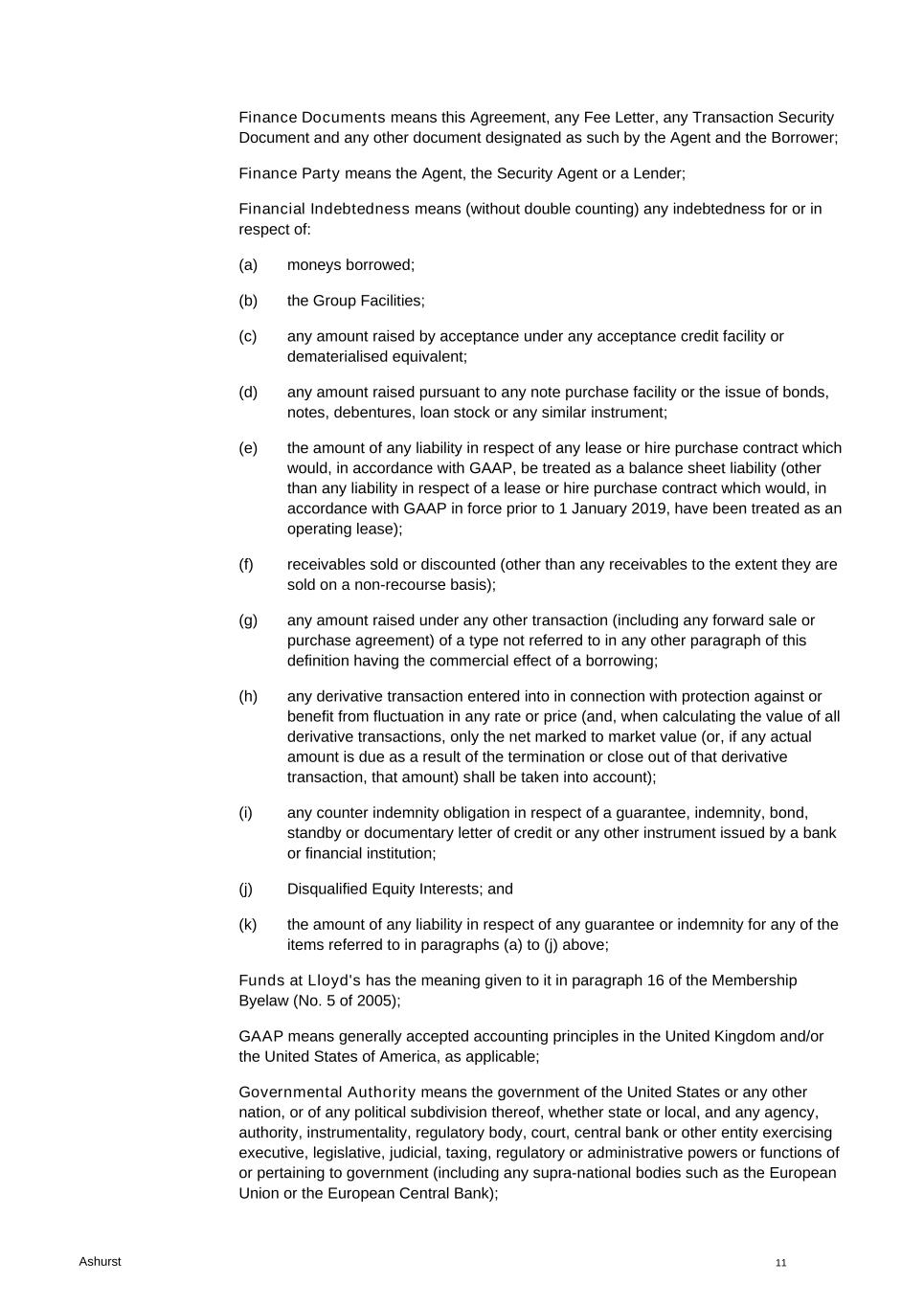 Ashurst 11 Finance Documents means this Agreement, any Fee Letter, any Transaction Security Document and any other document designated as such by the Agent and the Borrower; Finance Party means the Agent, the Security Agent or a Lender; Financial Indebtedness means (without double counting) any indebtedness for or in respect of: (a) moneys borrowed; (b) the Group Facilities; (c) any amount raised by acceptance under any acceptance credit facility or dematerialised equivalent; (d) any amount raised pursuant to any note purchase facility or the issue of bonds, notes, debentures, loan stock or any similar instrument; (e) the amount of any liability in respect of any lease or hire purchase contract which would, in accordance with GAAP, be treated as a balance sheet liability (other than any liability in respect of a lease or hire purchase contract which would, in accordance with GAAP in force prior to 1 January 2019, have been treated as an operating lease); (f) receivables sold or discounted (other than any receivables to the extent they are sold on a non-recourse basis); (g) any amount raised under any other transaction (including any forward sale or purchase agreement) of a type not referred to in any other paragraph of this definition having the commercial effect of a borrowing; (h) any derivative transaction entered into in connection with protection against or benefit from fluctuation in any rate or price (and, when calculating the value of all derivative transactions, only the net marked to market value (or, if any actual amount is due as a result of the termination or close out of that derivative transaction, that amount) shall be taken into account); (i) any counter indemnity obligation in respect of a guarantee, indemnity, bond, standby or documentary letter of credit or any other instrument issued by a bank or financial institution; (j) Disqualified Equity Interests; and (k) the amount of any liability in respect of any guarantee or indemnity for any of the items referred to in paragraphs (a) to (j) above; Funds at Lloyd's has the meaning given to it in paragraph 16 of the Membership Byelaw (No. 5 of 2005); GAAP means generally accepted accounting principles in the United Kingdom and/or the United States of America, as applicable; Governmental Authority means the government of the United States or any other nation, or of any political subdivision thereof, whether state or local, and any agency, authority, instrumentality, regulatory body, court, central bank or other entity exercising executive, legislative, judicial, taxing, regulatory or administrative powers or functions of or pertaining to government (including any supra-national bodies such as the European Union or the European Central Bank);