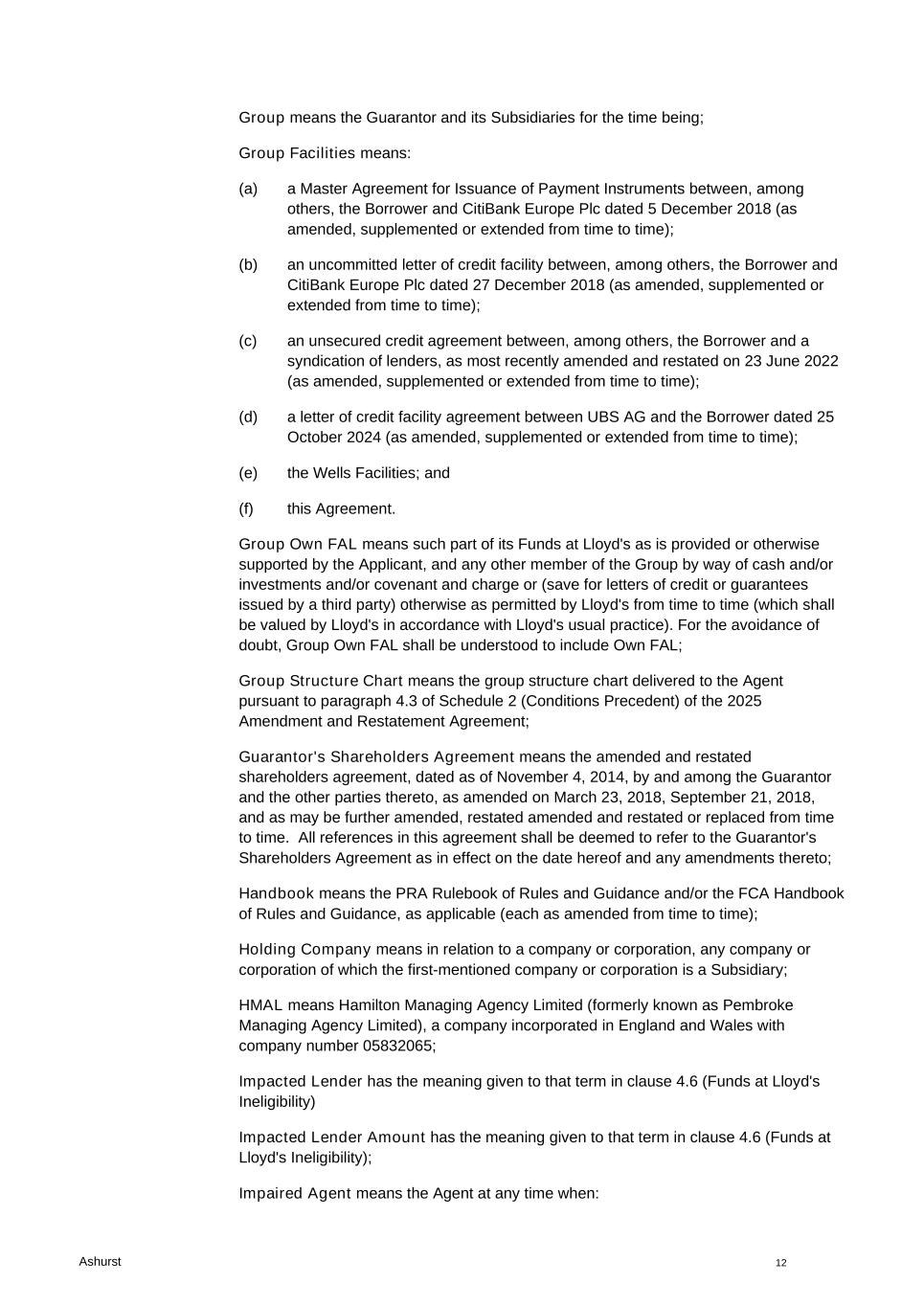 Ashurst 12 Group means the Guarantor and its Subsidiaries for the time being; Group Facilities means: (a) a Master Agreement for Issuance of Payment Instruments between, among others, the Borrower and CitiBank Europe Plc dated 5 December 2018 (as amended, supplemented or extended from time to time); (b) an uncommitted letter of credit facility between, among others, the Borrower and CitiBank Europe Plc dated 27 December 2018 (as amended, supplemented or extended from time to time); (c) an unsecured credit agreement between, among others, the Borrower and a syndication of lenders, as most recently amended and restated on 23 June 2022 (as amended, supplemented or extended from time to time); (d) a letter of credit facility agreement between UBS AG and the Borrower dated 25 October 2024 (as amended, supplemented or extended from time to time); (e) the Wells Facilities; and (f) this Agreement. Group Own FAL means such part of its Funds at Lloyd's as is provided or otherwise supported by the Applicant, and any other member of the Group by way of cash and/or investments and/or covenant and charge or (save for letters of credit or guarantees issued by a third party) otherwise as permitted by Lloyd's from time to time (which shall be valued by Lloyd's in accordance with Lloyd's usual practice). For the avoidance of doubt, Group Own FAL shall be understood to include Own FAL; Group Structure Chart means the group structure chart delivered to the Agent pursuant to paragraph 4.3 of Schedule 2 (Conditions Precedent) of the 2025 Amendment and Restatement Agreement; Guarantor's Shareholders Agreement means the amended and restated shareholders agreement, dated as of November 4, 2014, by and among the Guarantor and the other parties thereto, as amended on March 23, 2018, September 21, 2018, and as may be further amended, restated amended and restated or replaced from time to time. All references in this agreement shall be deemed to refer to the Guarantor's Shareholders Agreement as in effect on the date hereof and any amendments thereto; Handbook means the PRA Rulebook of Rules and Guidance and/or the FCA Handbook of Rules and Guidance, as applicable (each as amended from time to time); Holding Company means in relation to a company or corporation, any company or corporation of which the first-mentioned company or corporation is a Subsidiary; HMAL means Hamilton Managing Agency Limited (formerly known as Pembroke Managing Agency Limited), a company incorporated in England and Wales with company number 05832065; Impacted Lender has the meaning given to that term in clause 4.6 (Funds at Lloyd's Ineligibility) Impacted Lender Amount has the meaning given to that term in clause 4.6 (Funds at Lloyd's Ineligibility); Impaired Agent means the Agent at any time when: