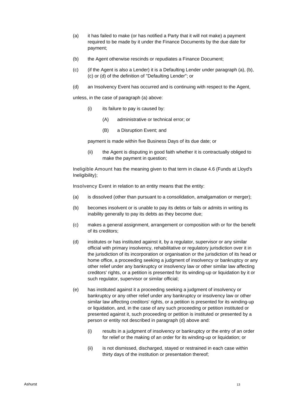 Ashurst 13 (a) it has failed to make (or has notified a Party that it will not make) a payment required to be made by it under the Finance Documents by the due date for payment; (b) the Agent otherwise rescinds or repudiates a Finance Document; (c) (if the Agent is also a Lender) it is a Defaulting Lender under paragraph (a), (b), (c) or (d) of the definition of "Defaulting Lender"; or (d) an Insolvency Event has occurred and is continuing with respect to the Agent, unless, in the case of paragraph (a) above: (i) its failure to pay is caused by: (A) administrative or technical error; or (B) a Disruption Event; and payment is made within five Business Days of its due date; or (ii) the Agent is disputing in good faith whether it is contractually obliged to make the payment in question; Ineligible Amount has the meaning given to that term in clause 4.6 (Funds at Lloyd's Ineligibility); Insolvency Event in relation to an entity means that the entity: (a) is dissolved (other than pursuant to a consolidation, amalgamation or merger); (b) becomes insolvent or is unable to pay its debts or fails or admits in writing its inability generally to pay its debts as they become due; (c) makes a general assignment, arrangement or composition with or for the benefit of its creditors; (d) institutes or has instituted against it, by a regulator, supervisor or any similar official with primary insolvency, rehabilitative or regulatory jurisdiction over it in the jurisdiction of its incorporation or organisation or the jurisdiction of its head or home office, a proceeding seeking a judgment of insolvency or bankruptcy or any other relief under any bankruptcy or insolvency law or other similar law affecting creditors' rights, or a petition is presented for its winding-up or liquidation by it or such regulator, supervisor or similar official; (e) has instituted against it a proceeding seeking a judgment of insolvency or bankruptcy or any other relief under any bankruptcy or insolvency law or other similar law affecting creditors' rights, or a petition is presented for its winding-up or liquidation, and, in the case of any such proceeding or petition instituted or presented against it, such proceeding or petition is instituted or presented by a person or entity not described in paragraph (d) above and: (i) results in a judgment of insolvency or bankruptcy or the entry of an order for relief or the making of an order for its winding-up or liquidation; or (ii) is not dismissed, discharged, stayed or restrained in each case within thirty days of the institution or presentation thereof;
