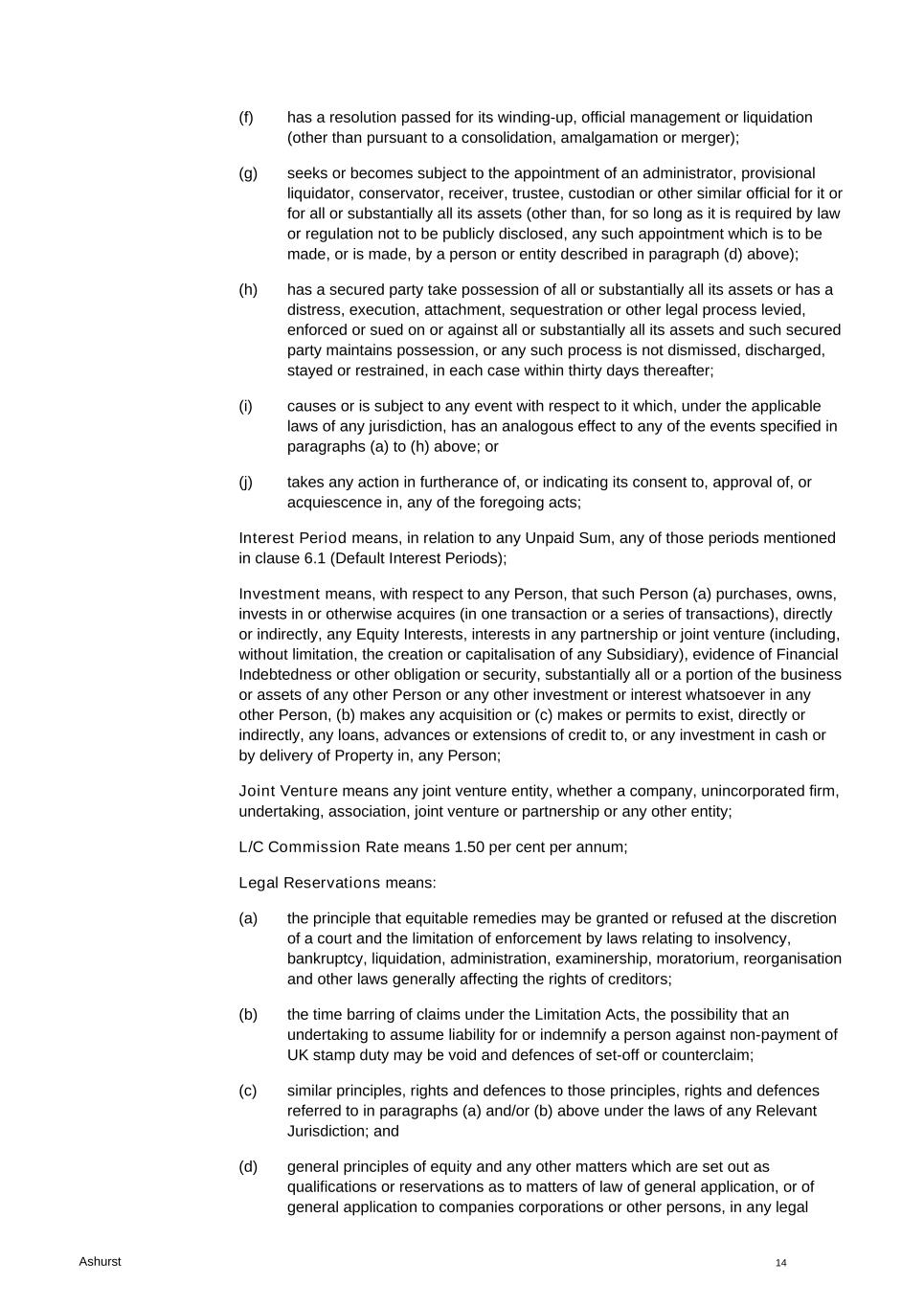 Ashurst 14 (f) has a resolution passed for its winding-up, official management or liquidation (other than pursuant to a consolidation, amalgamation or merger); (g) seeks or becomes subject to the appointment of an administrator, provisional liquidator, conservator, receiver, trustee, custodian or other similar official for it or for all or substantially all its assets (other than, for so long as it is required by law or regulation not to be publicly disclosed, any such appointment which is to be made, or is made, by a person or entity described in paragraph (d) above); (h) has a secured party take possession of all or substantially all its assets or has a distress, execution, attachment, sequestration or other legal process levied, enforced or sued on or against all or substantially all its assets and such secured party maintains possession, or any such process is not dismissed, discharged, stayed or restrained, in each case within thirty days thereafter; (i) causes or is subject to any event with respect to it which, under the applicable laws of any jurisdiction, has an analogous effect to any of the events specified in paragraphs (a) to (h) above; or (j) takes any action in furtherance of, or indicating its consent to, approval of, or acquiescence in, any of the foregoing acts; Interest Period means, in relation to any Unpaid Sum, any of those periods mentioned in clause 6.1 (Default Interest Periods); Investment means, with respect to any Person, that such Person (a) purchases, owns, invests in or otherwise acquires (in one transaction or a series of transactions), directly or indirectly, any Equity Interests, interests in any partnership or joint venture (including, without limitation, the creation or capitalisation of any Subsidiary), evidence of Financial Indebtedness or other obligation or security, substantially all or a portion of the business or assets of any other Person or any other investment or interest whatsoever in any other Person, (b) makes any acquisition or (c) makes or permits to exist, directly or indirectly, any loans, advances or extensions of credit to, or any investment in cash or by delivery of Property in, any Person; Joint Venture means any joint venture entity, whether a company, unincorporated firm, undertaking, association, joint venture or partnership or any other entity; L/C Commission Rate means 1.50 per cent per annum; Legal Reservations means: (a) the principle that equitable remedies may be granted or refused at the discretion of a court and the limitation of enforcement by laws relating to insolvency, bankruptcy, liquidation, administration, examinership, moratorium, reorganisation and other laws generally affecting the rights of creditors; (b) the time barring of claims under the Limitation Acts, the possibility that an undertaking to assume liability for or indemnify a person against non-payment of UK stamp duty may be void and defences of set-off or counterclaim; (c) similar principles, rights and defences to those principles, rights and defences referred to in paragraphs (a) and/or (b) above under the laws of any Relevant Jurisdiction; and (d) general principles of equity and any other matters which are set out as qualifications or reservations as to matters of law of general application, or of general application to companies corporations or other persons, in any legal