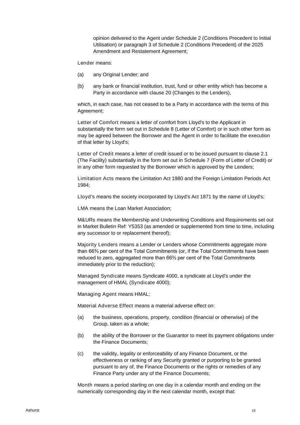Ashurst 15 opinion delivered to the Agent under Schedule 2 (Conditions Precedent to Initial Utilisation) or paragraph 3 of Schedule 2 (Conditions Precedent) of the 2025 Amendment and Restatement Agreement; Lender means: (a) any Original Lender; and (b) any bank or financial institution, trust, fund or other entity which has become a Party in accordance with clause 20 (Changes to the Lenders), which, in each case, has not ceased to be a Party in accordance with the terms of this Agreement; Letter of Comfort means a letter of comfort from Lloyd's to the Applicant in substantially the form set out in Schedule 8 (Letter of Comfort) or in such other form as may be agreed between the Borrower and the Agent in order to facilitate the execution of that letter by Lloyd's; Letter of Credit means a letter of credit issued or to be issued pursuant to clause 2.1 (The Facility) substantially in the form set out in Schedule 7 (Form of Letter of Credit) or in any other form requested by the Borrower which is approved by the Lenders; Limitation Acts means the Limitation Act 1980 and the Foreign Limitation Periods Act 1984; Lloyd's means the society incorporated by Lloyd's Act 1871 by the name of Lloyd's; LMA means the Loan Market Association; M&URs means the Membership and Underwriting Conditions and Requirements set out in Market Bulletin Ref: Y5353 (as amended or supplemented from time to time, including any successor to or replacement thereof); Majority Lenders means a Lender or Lenders whose Commitments aggregate more than 66⅔ per cent of the Total Commitments (or, if the Total Commitments have been reduced to zero, aggregated more than 66⅔ per cent of the Total Commitments immediately prior to the reduction); Managed Syndicate means Syndicate 4000, a syndicate at Lloyd's under the management of HMAL (Syndicate 4000); Managing Agent means HMAL; Material Adverse Effect means a material adverse effect on: (a) the business, operations, property, condition (financial or otherwise) of the Group, taken as a whole; (b) the ability of the Borrower or the Guarantor to meet its payment obligations under the Finance Documents; (c) the validity, legality or enforceability of any Finance Document, or the effectiveness or ranking of any Security granted or purporting to be granted pursuant to any of, the Finance Documents or the rights or remedies of any Finance Party under any of the Finance Documents; Month means a period starting on one day in a calendar month and ending on the numerically corresponding day in the next calendar month, except that: