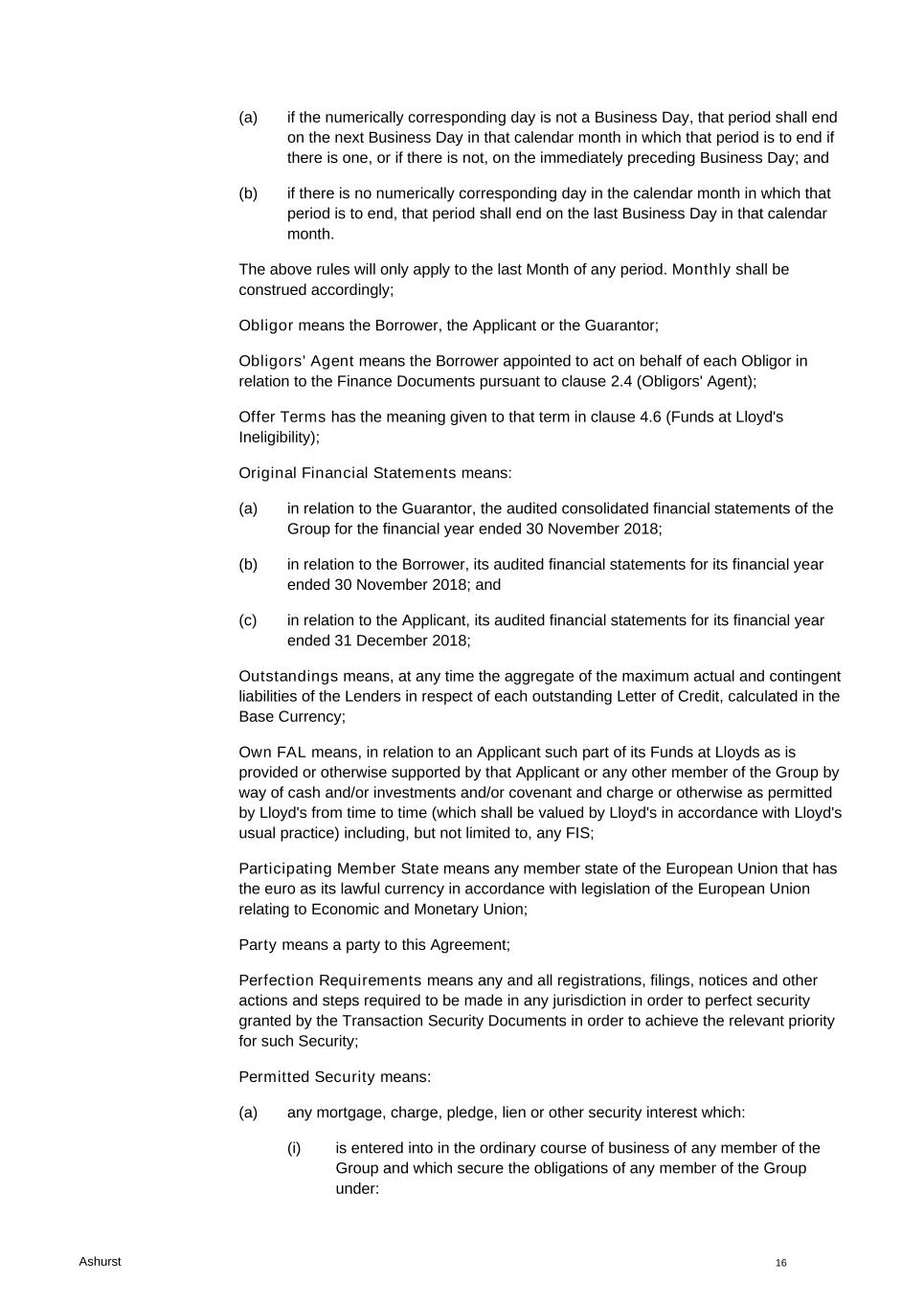 Ashurst 16 (a) if the numerically corresponding day is not a Business Day, that period shall end on the next Business Day in that calendar month in which that period is to end if there is one, or if there is not, on the immediately preceding Business Day; and (b) if there is no numerically corresponding day in the calendar month in which that period is to end, that period shall end on the last Business Day in that calendar month. The above rules will only apply to the last Month of any period. Monthly shall be construed accordingly; Obligor means the Borrower, the Applicant or the Guarantor; Obligors' Agent means the Borrower appointed to act on behalf of each Obligor in relation to the Finance Documents pursuant to clause 2.4 (Obligors' Agent); Offer Terms has the meaning given to that term in clause 4.6 (Funds at Lloyd's Ineligibility); Original Financial Statements means: (a) in relation to the Guarantor, the audited consolidated financial statements of the Group for the financial year ended 30 November 2018; (b) in relation to the Borrower, its audited financial statements for its financial year ended 30 November 2018; and (c) in relation to the Applicant, its audited financial statements for its financial year ended 31 December 2018; Outstandings means, at any time the aggregate of the maximum actual and contingent liabilities of the Lenders in respect of each outstanding Letter of Credit, calculated in the Base Currency; Own FAL means, in relation to an Applicant such part of its Funds at Lloyds as is provided or otherwise supported by that Applicant or any other member of the Group by way of cash and/or investments and/or covenant and charge or otherwise as permitted by Lloyd's from time to time (which shall be valued by Lloyd's in accordance with Lloyd's usual practice) including, but not limited to, any FIS; Participating Member State means any member state of the European Union that has the euro as its lawful currency in accordance with legislation of the European Union relating to Economic and Monetary Union; Party means a party to this Agreement; Perfection Requirements means any and all registrations, filings, notices and other actions and steps required to be made in any jurisdiction in order to perfect security granted by the Transaction Security Documents in order to achieve the relevant priority for such Security; Permitted Security means: (a) any mortgage, charge, pledge, lien or other security interest which: (i) is entered into in the ordinary course of business of any member of the Group and which secure the obligations of any member of the Group under: