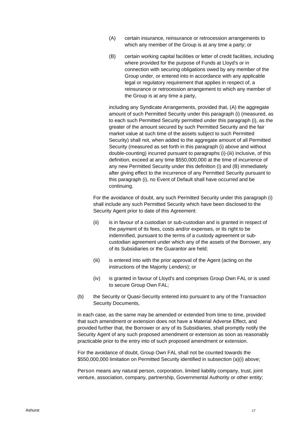 Ashurst 17 (A) certain insurance, reinsurance or retrocession arrangements to which any member of the Group is at any time a party; or (B) certain working capital facilities or letter of credit facilities, including where provided for the purpose of Funds at Lloyd's or in connection with securing obligations owed by any member of the Group under, or entered into in accordance with any applicable legal or regulatory requirement that applies in respect of, a reinsurance or retrocession arrangement to which any member of the Group is at any time a party, including any Syndicate Arrangements, provided that, (A) the aggregate amount of such Permitted Security under this paragraph (i) (measured, as to each such Permitted Security permitted under this paragraph (i), as the greater of the amount secured by such Permitted Security and the fair market value at such time of the assets subject to such Permitted Security) shall not, when added to the aggregate amount of all Permitted Security (measured as set forth in this paragraph (i) above and without double-counting) incurred pursuant to paragraphs (i)-(iii) inclusive, of this definition, exceed at any time $550,000,000 at the time of incurrence of any new Permitted Security under this definition (i) and (B) immediately after giving effect to the incurrence of any Permitted Security pursuant to this paragraph (i), no Event of Default shall have occurred and be continuing. For the avoidance of doubt, any such Permitted Security under this paragraph (i) shall include any such Permitted Security which have been disclosed to the Security Agent prior to date of this Agreement: (ii) is in favour of a custodian or sub-custodian and is granted in respect of the payment of its fees, costs and/or expenses, or its right to be indemnified, pursuant to the terms of a custody agreement or sub- custodian agreement under which any of the assets of the Borrower, any of its Subsidiaries or the Guarantor are held; (iii) is entered into with the prior approval of the Agent (acting on the instructions of the Majority Lenders); or (iv) is granted in favour of Lloyd's and comprises Group Own FAL or is used to secure Group Own FAL; (b) the Security or Quasi-Security entered into pursuant to any of the Transaction Security Documents, in each case, as the same may be amended or extended from time to time, provided that such amendment or extension does not have a Material Adverse Effect, and provided further that, the Borrower or any of its Subsidiaries, shall promptly notify the Security Agent of any such proposed amendment or extension as soon as reasonably practicable prior to the entry into of such proposed amendment or extension. For the avoidance of doubt, Group Own FAL shall not be counted towards the $550,000,000 limitation on Permitted Security identified in subsection (a)(i) above; Person means any natural person, corporation, limited liability company, trust, joint venture, association, company, partnership, Governmental Authority or other entity;