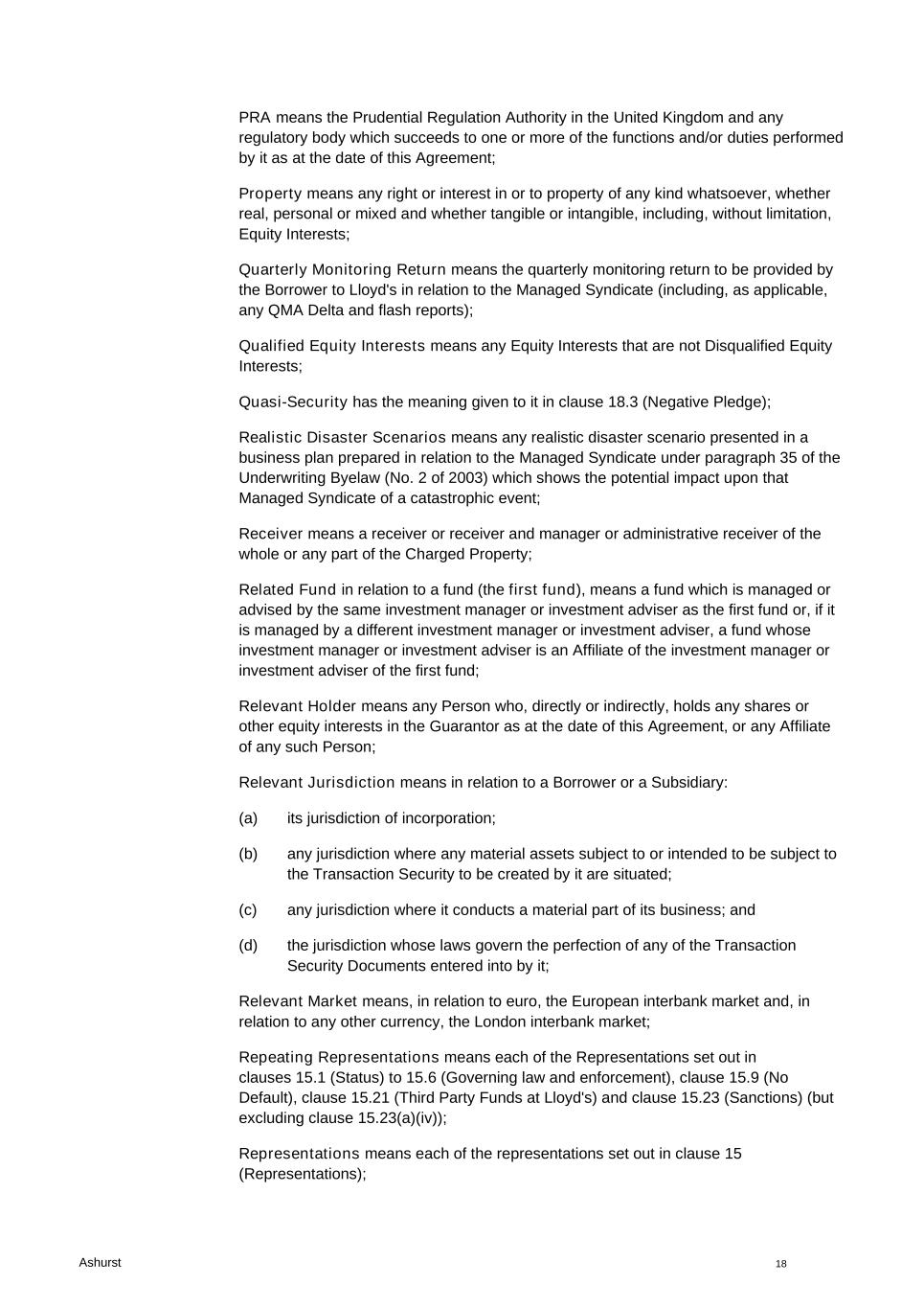 Ashurst 18 PRA means the Prudential Regulation Authority in the United Kingdom and any regulatory body which succeeds to one or more of the functions and/or duties performed by it as at the date of this Agreement; Property means any right or interest in or to property of any kind whatsoever, whether real, personal or mixed and whether tangible or intangible, including, without limitation, Equity Interests; Quarterly Monitoring Return means the quarterly monitoring return to be provided by the Borrower to Lloyd's in relation to the Managed Syndicate (including, as applicable, any QMA Delta and flash reports); Qualified Equity Interests means any Equity Interests that are not Disqualified Equity Interests; Quasi-Security has the meaning given to it in clause 18.3 (Negative Pledge); Realistic Disaster Scenarios means any realistic disaster scenario presented in a business plan prepared in relation to the Managed Syndicate under paragraph 35 of the Underwriting Byelaw (No. 2 of 2003) which shows the potential impact upon that Managed Syndicate of a catastrophic event; Receiver means a receiver or receiver and manager or administrative receiver of the whole or any part of the Charged Property; Related Fund in relation to a fund (the first fund), means a fund which is managed or advised by the same investment manager or investment adviser as the first fund or, if it is managed by a different investment manager or investment adviser, a fund whose investment manager or investment adviser is an Affiliate of the investment manager or investment adviser of the first fund; Relevant Holder means any Person who, directly or indirectly, holds any shares or other equity interests in the Guarantor as at the date of this Agreement, or any Affiliate of any such Person; Relevant Jurisdiction means in relation to a Borrower or a Subsidiary: (a) its jurisdiction of incorporation; (b) any jurisdiction where any material assets subject to or intended to be subject to the Transaction Security to be created by it are situated; (c) any jurisdiction where it conducts a material part of its business; and (d) the jurisdiction whose laws govern the perfection of any of the Transaction Security Documents entered into by it; Relevant Market means, in relation to euro, the European interbank market and, in relation to any other currency, the London interbank market; Repeating Representations means each of the Representations set out in clauses 15.1 (Status) to 15.6 (Governing law and enforcement), clause 15.9 (No Default), clause 15.21 (Third Party Funds at Lloyd's) and clause 15.23 (Sanctions) (but excluding clause 15.23(a)(iv)); Representations means each of the representations set out in clause 15 (Representations);