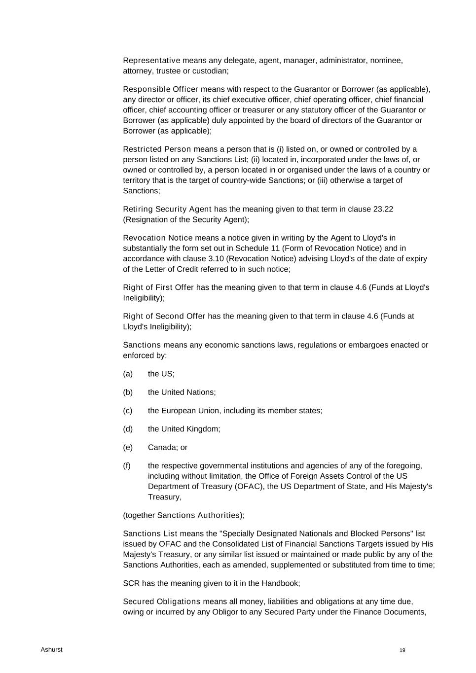 Ashurst 19 Representative means any delegate, agent, manager, administrator, nominee, attorney, trustee or custodian; Responsible Officer means with respect to the Guarantor or Borrower (as applicable), any director or officer, its chief executive officer, chief operating officer, chief financial officer, chief accounting officer or treasurer or any statutory officer of the Guarantor or Borrower (as applicable) duly appointed by the board of directors of the Guarantor or Borrower (as applicable); Restricted Person means a person that is (i) listed on, or owned or controlled by a person listed on any Sanctions List; (ii) located in, incorporated under the laws of, or owned or controlled by, a person located in or organised under the laws of a country or territory that is the target of country-wide Sanctions; or (iii) otherwise a target of Sanctions; Retiring Security Agent has the meaning given to that term in clause 23.22 (Resignation of the Security Agent); Revocation Notice means a notice given in writing by the Agent to Lloyd's in substantially the form set out in Schedule 11 (Form of Revocation Notice) and in accordance with clause 3.10 (Revocation Notice) advising Lloyd's of the date of expiry of the Letter of Credit referred to in such notice; Right of First Offer has the meaning given to that term in clause 4.6 (Funds at Lloyd's Ineligibility); Right of Second Offer has the meaning given to that term in clause 4.6 (Funds at Lloyd's Ineligibility); Sanctions means any economic sanctions laws, regulations or embargoes enacted or enforced by: (a) the US; (b) the United Nations; (c) the European Union, including its member states; (d) the United Kingdom; (e) Canada; or (f) the respective governmental institutions and agencies of any of the foregoing, including without limitation, the Office of Foreign Assets Control of the US Department of Treasury (OFAC), the US Department of State, and His Majesty's Treasury, (together Sanctions Authorities); Sanctions List means the "Specially Designated Nationals and Blocked Persons" list issued by OFAC and the Consolidated List of Financial Sanctions Targets issued by His Majesty's Treasury, or any similar list issued or maintained or made public by any of the Sanctions Authorities, each as amended, supplemented or substituted from time to time; SCR has the meaning given to it in the Handbook; Secured Obligations means all money, liabilities and obligations at any time due, owing or incurred by any Obligor to any Secured Party under the Finance Documents,