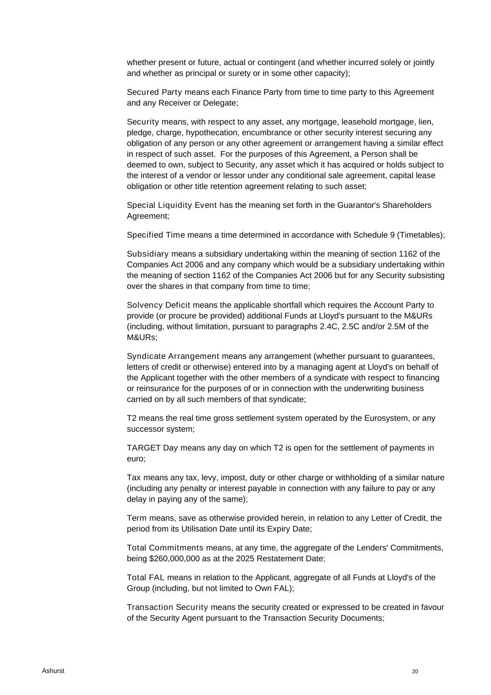 Ashurst 20 whether present or future, actual or contingent (and whether incurred solely or jointly and whether as principal or surety or in some other capacity); Secured Party means each Finance Party from time to time party to this Agreement and any Receiver or Delegate; Security means, with respect to any asset, any mortgage, leasehold mortgage, lien, pledge, charge, hypothecation, encumbrance or other security interest securing any obligation of any person or any other agreement or arrangement having a similar effect in respect of such asset. For the purposes of this Agreement, a Person shall be deemed to own, subject to Security, any asset which it has acquired or holds subject to the interest of a vendor or lessor under any conditional sale agreement, capital lease obligation or other title retention agreement relating to such asset; Special Liquidity Event has the meaning set forth in the Guarantor's Shareholders Agreement; Specified Time means a time determined in accordance with Schedule 9 (Timetables); Subsidiary means a subsidiary undertaking within the meaning of section 1162 of the Companies Act 2006 and any company which would be a subsidiary undertaking within the meaning of section 1162 of the Companies Act 2006 but for any Security subsisting over the shares in that company from time to time; Solvency Deficit means the applicable shortfall which requires the Account Party to provide (or procure be provided) additional Funds at Lloyd's pursuant to the M&URs (including, without limitation, pursuant to paragraphs 2.4C, 2.5C and/or 2.5M of the M&URs; Syndicate Arrangement means any arrangement (whether pursuant to guarantees, letters of credit or otherwise) entered into by a managing agent at Lloyd's on behalf of the Applicant together with the other members of a syndicate with respect to financing or reinsurance for the purposes of or in connection with the underwriting business carried on by all such members of that syndicate; T2 means the real time gross settlement system operated by the Eurosystem, or any successor system; TARGET Day means any day on which T2 is open for the settlement of payments in euro; Tax means any tax, levy, impost, duty or other charge or withholding of a similar nature (including any penalty or interest payable in connection with any failure to pay or any delay in paying any of the same); Term means, save as otherwise provided herein, in relation to any Letter of Credit, the period from its Utilisation Date until its Expiry Date; Total Commitments means, at any time, the aggregate of the Lenders' Commitments, being $260,000,000 as at the 2025 Restatement Date; Total FAL means in relation to the Applicant, aggregate of all Funds at Lloyd's of the Group (including, but not limited to Own FAL); Transaction Security means the security created or expressed to be created in favour of the Security Agent pursuant to the Transaction Security Documents;