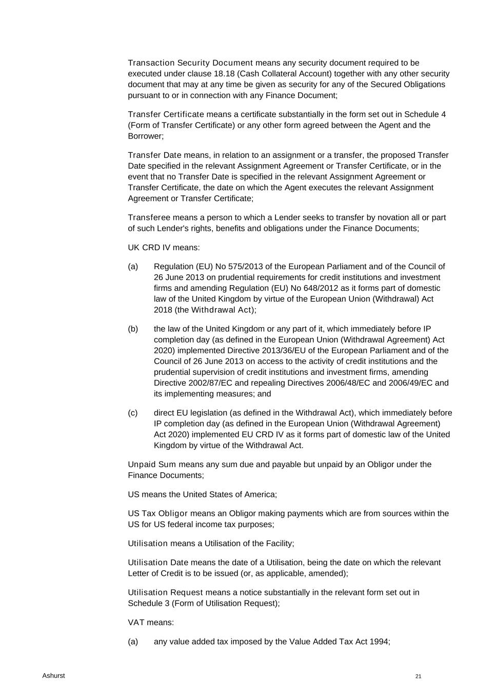 Ashurst 21 Transaction Security Document means any security document required to be executed under clause 18.18 (Cash Collateral Account) together with any other security document that may at any time be given as security for any of the Secured Obligations pursuant to or in connection with any Finance Document; Transfer Certificate means a certificate substantially in the form set out in Schedule 4 (Form of Transfer Certificate) or any other form agreed between the Agent and the Borrower; Transfer Date means, in relation to an assignment or a transfer, the proposed Transfer Date specified in the relevant Assignment Agreement or Transfer Certificate, or in the event that no Transfer Date is specified in the relevant Assignment Agreement or Transfer Certificate, the date on which the Agent executes the relevant Assignment Agreement or Transfer Certificate; Transferee means a person to which a Lender seeks to transfer by novation all or part of such Lender's rights, benefits and obligations under the Finance Documents; UK CRD IV means: (a) Regulation (EU) No 575/2013 of the European Parliament and of the Council of 26 June 2013 on prudential requirements for credit institutions and investment firms and amending Regulation (EU) No 648/2012 as it forms part of domestic law of the United Kingdom by virtue of the European Union (Withdrawal) Act 2018 (the Withdrawal Act); (b) the law of the United Kingdom or any part of it, which immediately before IP completion day (as defined in the European Union (Withdrawal Agreement) Act 2020) implemented Directive 2013/36/EU of the European Parliament and of the Council of 26 June 2013 on access to the activity of credit institutions and the prudential supervision of credit institutions and investment firms, amending Directive 2002/87/EC and repealing Directives 2006/48/EC and 2006/49/EC and its implementing measures; and (c) direct EU legislation (as defined in the Withdrawal Act), which immediately before IP completion day (as defined in the European Union (Withdrawal Agreement) Act 2020) implemented EU CRD IV as it forms part of domestic law of the United Kingdom by virtue of the Withdrawal Act. Unpaid Sum means any sum due and payable but unpaid by an Obligor under the Finance Documents; US means the United States of America; US Tax Obligor means an Obligor making payments which are from sources within the US for US federal income tax purposes; Utilisation means a Utilisation of the Facility; Utilisation Date means the date of a Utilisation, being the date on which the relevant Letter of Credit is to be issued (or, as applicable, amended); Utilisation Request means a notice substantially in the relevant form set out in Schedule 3 (Form of Utilisation Request); VAT means: (a) any value added tax imposed by the Value Added Tax Act 1994;