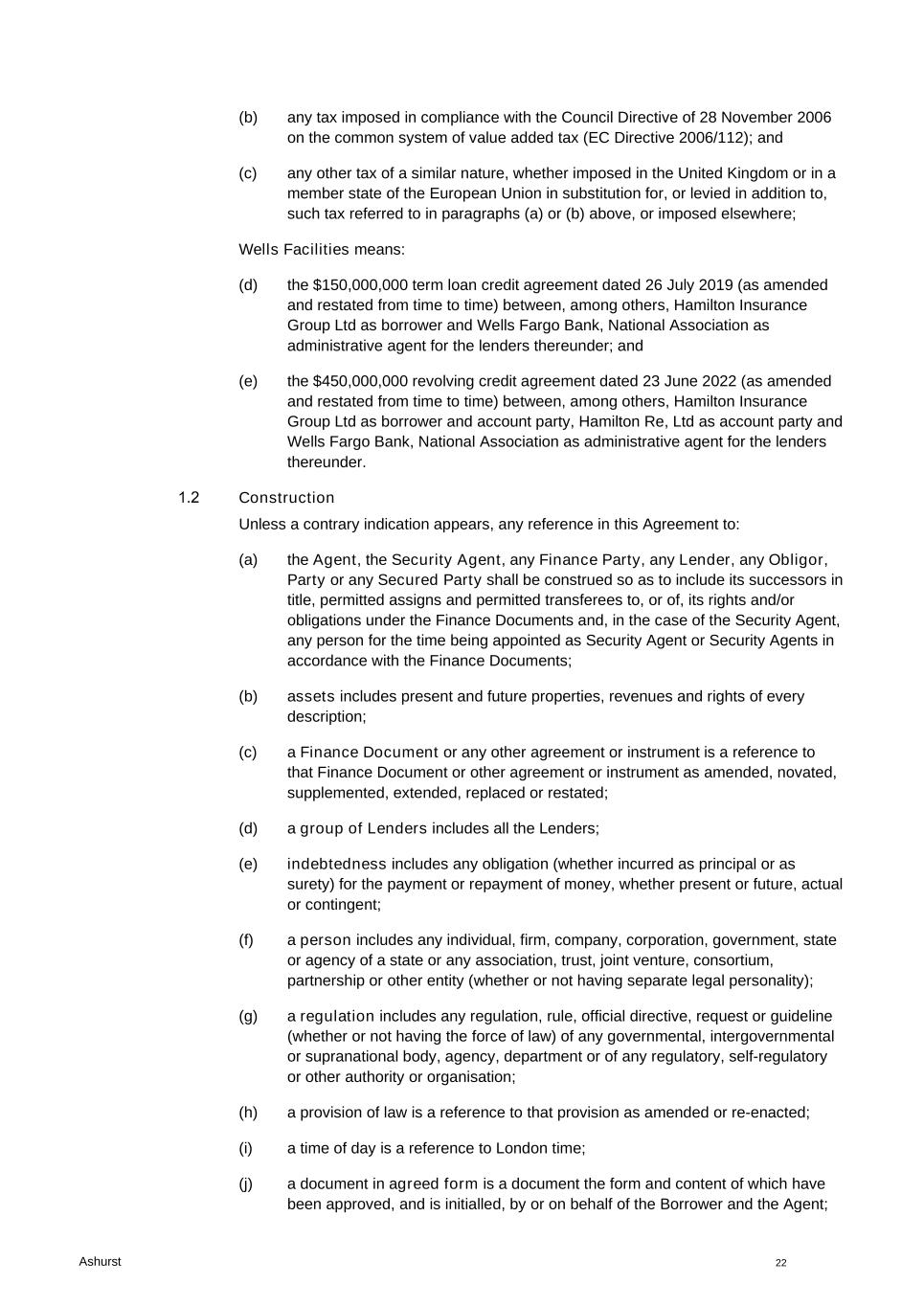 Ashurst 22 (b) any tax imposed in compliance with the Council Directive of 28 November 2006 on the common system of value added tax (EC Directive 2006/112); and (c) any other tax of a similar nature, whether imposed in the United Kingdom or in a member state of the European Union in substitution for, or levied in addition to, such tax referred to in paragraphs (a) or (b) above, or imposed elsewhere; Wells Facilities means: (d) the $150,000,000 term loan credit agreement dated 26 July 2019 (as amended and restated from time to time) between, among others, Hamilton Insurance Group Ltd as borrower and Wells Fargo Bank, National Association as administrative agent for the lenders thereunder; and (e) the $450,000,000 revolving credit agreement dated 23 June 2022 (as amended and restated from time to time) between, among others, Hamilton Insurance Group Ltd as borrower and account party, Hamilton Re, Ltd as account party and Wells Fargo Bank, National Association as administrative agent for the lenders thereunder. Construction Unless a contrary indication appears, any reference in this Agreement to: (a) the Agent, the Security Agent, any Finance Party, any Lender, any Obligor, Party or any Secured Party shall be construed so as to include its successors in title, permitted assigns and permitted transferees to, or of, its rights and/or obligations under the Finance Documents and, in the case of the Security Agent, any person for the time being appointed as Security Agent or Security Agents in accordance with the Finance Documents; (b) assets includes present and future properties, revenues and rights of every description; (c) a Finance Document or any other agreement or instrument is a reference to that Finance Document or other agreement or instrument as amended, novated, supplemented, extended, replaced or restated; (d) a group of Lenders includes all the Lenders; (e) indebtedness includes any obligation (whether incurred as principal or as surety) for the payment or repayment of money, whether present or future, actual or contingent; (f) a person includes any individual, firm, company, corporation, government, state or agency of a state or any association, trust, joint venture, consortium, partnership or other entity (whether or not having separate legal personality); (g) a regulation includes any regulation, rule, official directive, request or guideline (whether or not having the force of law) of any governmental, intergovernmental or supranational body, agency, department or of any regulatory, self-regulatory or other authority or organisation; (h) a provision of law is a reference to that provision as amended or re-enacted; (i) a time of day is a reference to London time; (j) a document in agreed form is a document the form and content of which have been approved, and is initialled, by or on behalf of the Borrower and the Agent;