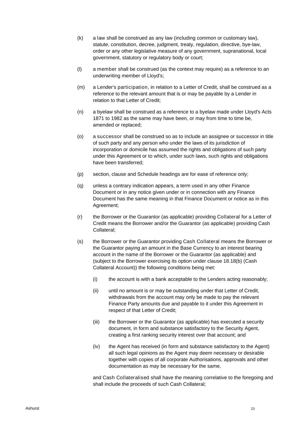 Ashurst 23 (k) a law shall be construed as any law (including common or customary law), statute, constitution, decree, judgment, treaty, regulation, directive, bye-law, order or any other legislative measure of any government, supranational, local government, statutory or regulatory body or court; (l) a member shall be construed (as the context may require) as a reference to an underwriting member of Lloyd's; (m) a Lender's participation, in relation to a Letter of Credit, shall be construed as a reference to the relevant amount that is or may be payable by a Lender in relation to that Letter of Credit; (n) a byelaw shall be construed as a reference to a byelaw made under Lloyd's Acts 1871 to 1982 as the same may have been, or may from time to time be, amended or replaced; (o) a successor shall be construed so as to include an assignee or successor in title of such party and any person who under the laws of its jurisdiction of incorporation or domicile has assumed the rights and obligations of such party under this Agreement or to which, under such laws, such rights and obligations have been transferred; (p) section, clause and Schedule headings are for ease of reference only; (q) unless a contrary indication appears, a term used in any other Finance Document or in any notice given under or in connection with any Finance Document has the same meaning in that Finance Document or notice as in this Agreement; (r) the Borrower or the Guarantor (as applicable) providing Collateral for a Letter of Credit means the Borrower and/or the Guarantor (as applicable) providing Cash Collateral; (s) the Borrower or the Guarantor providing Cash Collateral means the Borrower or the Guarantor paying an amount in the Base Currency to an interest bearing account in the name of the Borrower or the Guarantor (as applicable) and (subject to the Borrower exercising its option under clause 18.18(b) (Cash Collateral Account)) the following conditions being met: (i) the account is with a bank acceptable to the Lenders acting reasonably; (ii) until no amount is or may be outstanding under that Letter of Credit, withdrawals from the account may only be made to pay the relevant Finance Party amounts due and payable to it under this Agreement in respect of that Letter of Credit; (iii) the Borrower or the Guarantor (as applicable) has executed a security document, in form and substance satisfactory to the Security Agent, creating a first ranking security interest over that account; and (iv) the Agent has received (in form and substance satisfactory to the Agent) all such legal opinions as the Agent may deem necessary or desirable together with copies of all corporate Authorisations, approvals and other documentation as may be necessary for the same, and Cash Collateralised shall have the meaning correlative to the foregoing and shall include the proceeds of such Cash Collateral;
