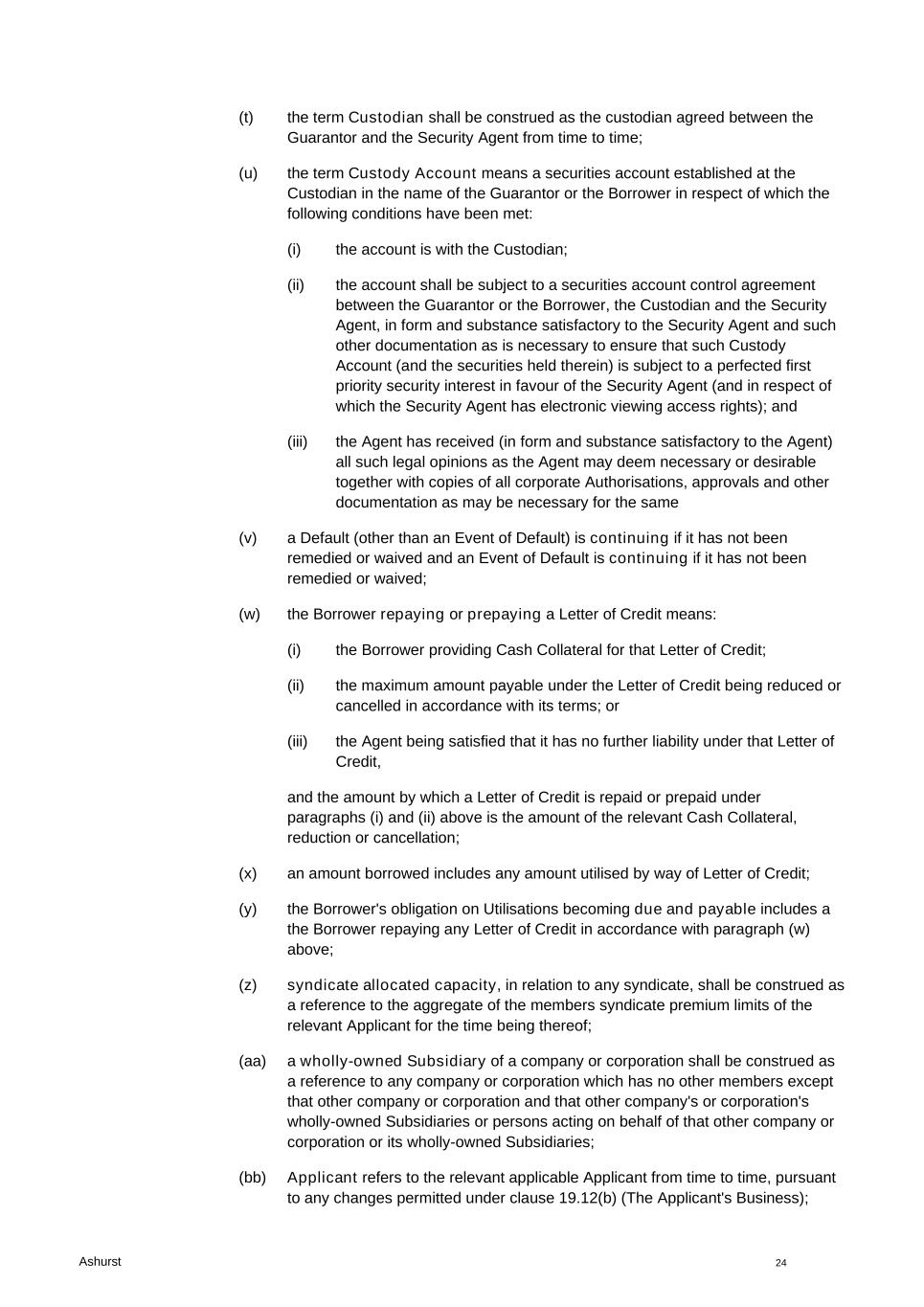 Ashurst 24 (t) the term Custodian shall be construed as the custodian agreed between the Guarantor and the Security Agent from time to time; (u) the term Custody Account means a securities account established at the Custodian in the name of the Guarantor or the Borrower in respect of which the following conditions have been met: (i) the account is with the Custodian; (ii) the account shall be subject to a securities account control agreement between the Guarantor or the Borrower, the Custodian and the Security Agent, in form and substance satisfactory to the Security Agent and such other documentation as is necessary to ensure that such Custody Account (and the securities held therein) is subject to a perfected first priority security interest in favour of the Security Agent (and in respect of which the Security Agent has electronic viewing access rights); and (iii) the Agent has received (in form and substance satisfactory to the Agent) all such legal opinions as the Agent may deem necessary or desirable together with copies of all corporate Authorisations, approvals and other documentation as may be necessary for the same (v) a Default (other than an Event of Default) is continuing if it has not been remedied or waived and an Event of Default is continuing if it has not been remedied or waived; (w) the Borrower repaying or prepaying a Letter of Credit means: (i) the Borrower providing Cash Collateral for that Letter of Credit; (ii) the maximum amount payable under the Letter of Credit being reduced or cancelled in accordance with its terms; or (iii) the Agent being satisfied that it has no further liability under that Letter of Credit, and the amount by which a Letter of Credit is repaid or prepaid under paragraphs (i) and (ii) above is the amount of the relevant Cash Collateral, reduction or cancellation; (x) an amount borrowed includes any amount utilised by way of Letter of Credit; (y) the Borrower's obligation on Utilisations becoming due and payable includes a the Borrower repaying any Letter of Credit in accordance with paragraph (w) above; (z) syndicate allocated capacity, in relation to any syndicate, shall be construed as a reference to the aggregate of the members syndicate premium limits of the relevant Applicant for the time being thereof; (aa) a wholly-owned Subsidiary of a company or corporation shall be construed as a reference to any company or corporation which has no other members except that other company or corporation and that other company's or corporation's wholly-owned Subsidiaries or persons acting on behalf of that other company or corporation or its wholly-owned Subsidiaries; (bb) Applicant refers to the relevant applicable Applicant from time to time, pursuant to any changes permitted under clause 19.12(b) (The Applicant's Business);