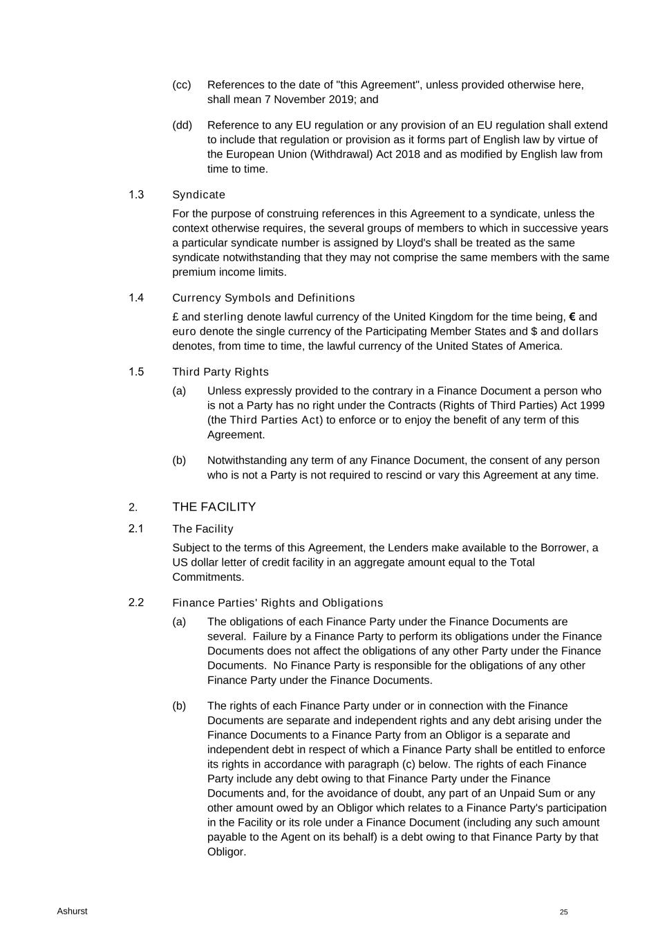 Ashurst 25 (cc) References to the date of "this Agreement", unless provided otherwise here, shall mean 7 November 2019; and (dd) Reference to any EU regulation or any provision of an EU regulation shall extend to include that regulation or provision as it forms part of English law by virtue of the European Union (Withdrawal) Act 2018 and as modified by English law from time to time. Syndicate For the purpose of construing references in this Agreement to a syndicate, unless the context otherwise requires, the several groups of members to which in successive years a particular syndicate number is assigned by Lloyd's shall be treated as the same syndicate notwithstanding that they may not comprise the same members with the same premium income limits. Currency Symbols and Definitions £ and sterling denote lawful currency of the United Kingdom for the time being, € and euro denote the single currency of the Participating Member States and $ and dollars denotes, from time to time, the lawful currency of the United States of America. Third Party Rights (a) Unless expressly provided to the contrary in a Finance Document a person who is not a Party has no right under the Contracts (Rights of Third Parties) Act 1999 (the Third Parties Act) to enforce or to enjoy the benefit of any term of this Agreement. (b) Notwithstanding any term of any Finance Document, the consent of any person who is not a Party is not required to rescind or vary this Agreement at any time. 2. THE FACILITY The Facility Subject to the terms of this Agreement, the Lenders make available to the Borrower, a US dollar letter of credit facility in an aggregate amount equal to the Total Commitments. Finance Parties' Rights and Obligations (a) The obligations of each Finance Party under the Finance Documents are several. Failure by a Finance Party to perform its obligations under the Finance Documents does not affect the obligations of any other Party under the Finance Documents. No Finance Party is responsible for the obligations of any other Finance Party under the Finance Documents. (b) The rights of each Finance Party under or in connection with the Finance Documents are separate and independent rights and any debt arising under the Finance Documents to a Finance Party from an Obligor is a separate and independent debt in respect of which a Finance Party shall be entitled to enforce its rights in accordance with paragraph (c) below. The rights of each Finance Party include any debt owing to that Finance Party under the Finance Documents and, for the avoidance of doubt, any part of an Unpaid Sum or any other amount owed by an Obligor which relates to a Finance Party's participation in the Facility or its role under a Finance Document (including any such amount payable to the Agent on its behalf) is a debt owing to that Finance Party by that Obligor.