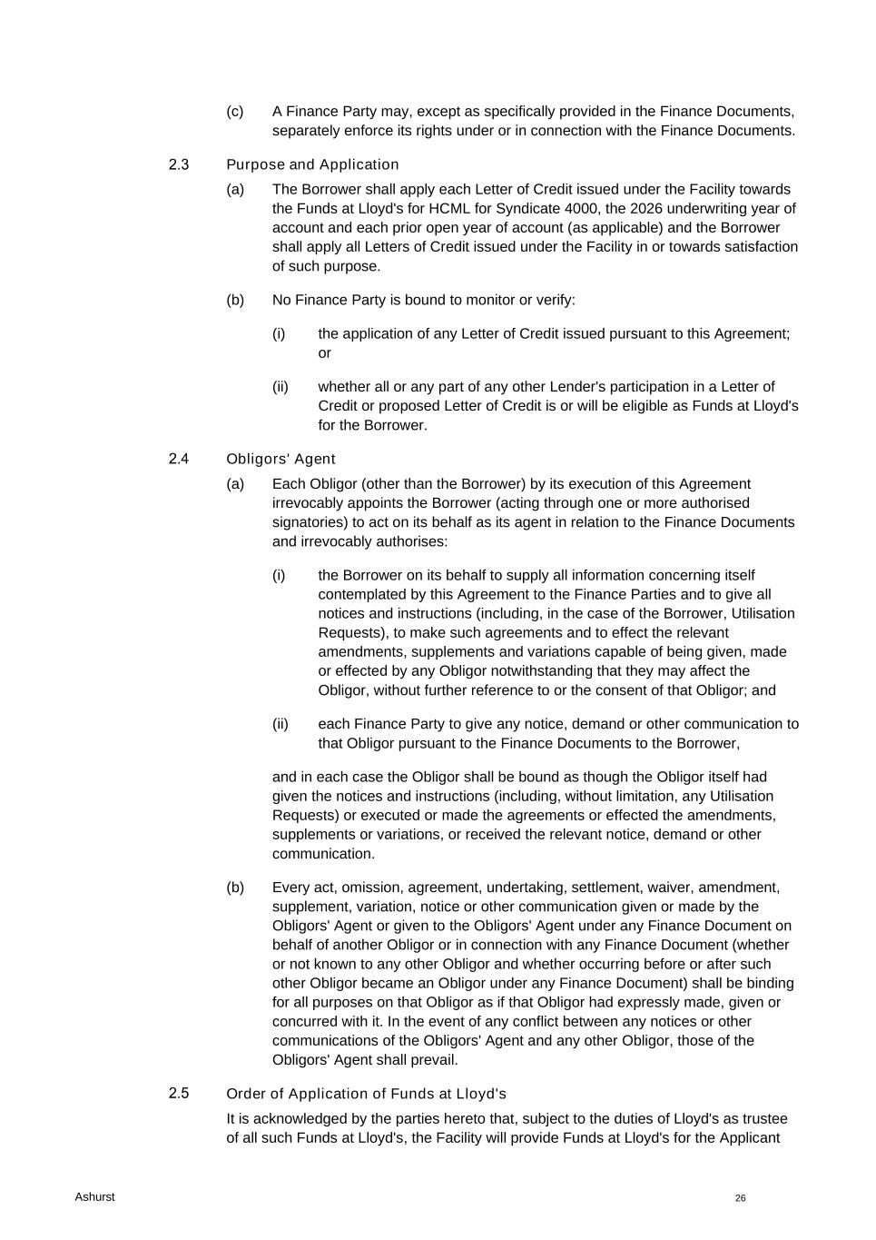 Ashurst 26 (c) A Finance Party may, except as specifically provided in the Finance Documents, separately enforce its rights under or in connection with the Finance Documents. Purpose and Application (a) The Borrower shall apply each Letter of Credit issued under the Facility towards the Funds at Lloyd's for HCML for Syndicate 4000, the 2026 underwriting year of account and each prior open year of account (as applicable) and the Borrower shall apply all Letters of Credit issued under the Facility in or towards satisfaction of such purpose. (b) No Finance Party is bound to monitor or verify: (i) the application of any Letter of Credit issued pursuant to this Agreement; or (ii) whether all or any part of any other Lender's participation in a Letter of Credit or proposed Letter of Credit is or will be eligible as Funds at Lloyd's for the Borrower. Obligors' Agent (a) Each Obligor (other than the Borrower) by its execution of this Agreement irrevocably appoints the Borrower (acting through one or more authorised signatories) to act on its behalf as its agent in relation to the Finance Documents and irrevocably authorises: (i) the Borrower on its behalf to supply all information concerning itself contemplated by this Agreement to the Finance Parties and to give all notices and instructions (including, in the case of the Borrower, Utilisation Requests), to make such agreements and to effect the relevant amendments, supplements and variations capable of being given, made or effected by any Obligor notwithstanding that they may affect the Obligor, without further reference to or the consent of that Obligor; and (ii) each Finance Party to give any notice, demand or other communication to that Obligor pursuant to the Finance Documents to the Borrower, and in each case the Obligor shall be bound as though the Obligor itself had given the notices and instructions (including, without limitation, any Utilisation Requests) or executed or made the agreements or effected the amendments, supplements or variations, or received the relevant notice, demand or other communication. (b) Every act, omission, agreement, undertaking, settlement, waiver, amendment, supplement, variation, notice or other communication given or made by the Obligors' Agent or given to the Obligors' Agent under any Finance Document on behalf of another Obligor or in connection with any Finance Document (whether or not known to any other Obligor and whether occurring before or after such other Obligor became an Obligor under any Finance Document) shall be binding for all purposes on that Obligor as if that Obligor had expressly made, given or concurred with it. In the event of any conflict between any notices or other communications of the Obligors' Agent and any other Obligor, those of the Obligors' Agent shall prevail. Order of Application of Funds at Lloyd's It is acknowledged by the parties hereto that, subject to the duties of Lloyd's as trustee of all such Funds at Lloyd's, the Facility will provide Funds at Lloyd's for the Applicant