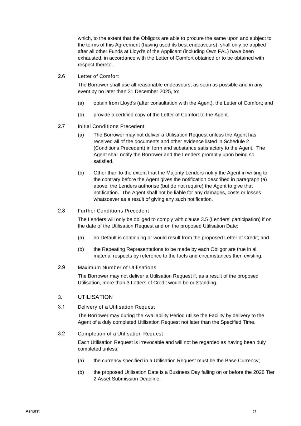 Ashurst 27 which, to the extent that the Obligors are able to procure the same upon and subject to the terms of this Agreement (having used its best endeavours), shall only be applied after all other Funds at Lloyd's of the Applicant (including Own FAL) have been exhausted, in accordance with the Letter of Comfort obtained or to be obtained with respect thereto. Letter of Comfort The Borrower shall use all reasonable endeavours, as soon as possible and in any event by no later than 31 December 2025, to: (a) obtain from Lloyd's (after consultation with the Agent), the Letter of Comfort; and (b) provide a certified copy of the Letter of Comfort to the Agent. Initial Conditions Precedent (a) The Borrower may not deliver a Utilisation Request unless the Agent has received all of the documents and other evidence listed in Schedule 2 (Conditions Precedent) in form and substance satisfactory to the Agent. The Agent shall notify the Borrower and the Lenders promptly upon being so satisfied. (b) Other than to the extent that the Majority Lenders notify the Agent in writing to the contrary before the Agent gives the notification described in paragraph (a) above, the Lenders authorise (but do not require) the Agent to give that notification. The Agent shall not be liable for any damages, costs or losses whatsoever as a result of giving any such notification. Further Conditions Precedent The Lenders will only be obliged to comply with clause 3.5 (Lenders' participation) if on the date of the Utilisation Request and on the proposed Utilisation Date: (a) no Default is continuing or would result from the proposed Letter of Credit; and (b) the Repeating Representations to be made by each Obligor are true in all material respects by reference to the facts and circumstances then existing. Maximum Number of Utilisations The Borrower may not deliver a Utilisation Request if, as a result of the proposed Utilisation, more than 3 Letters of Credit would be outstanding. 3. UTILISATION Delivery of a Utilisation Request The Borrower may during the Availability Period utilise the Facility by delivery to the Agent of a duly completed Utilisation Request not later than the Specified Time. Completion of a Utilisation Request Each Utilisation Request is irrevocable and will not be regarded as having been duly completed unless: (a) the currency specified in a Utilisation Request must be the Base Currency; (b) the proposed Utilisation Date is a Business Day falling on or before the 2026 Tier 2 Asset Submission Deadline;