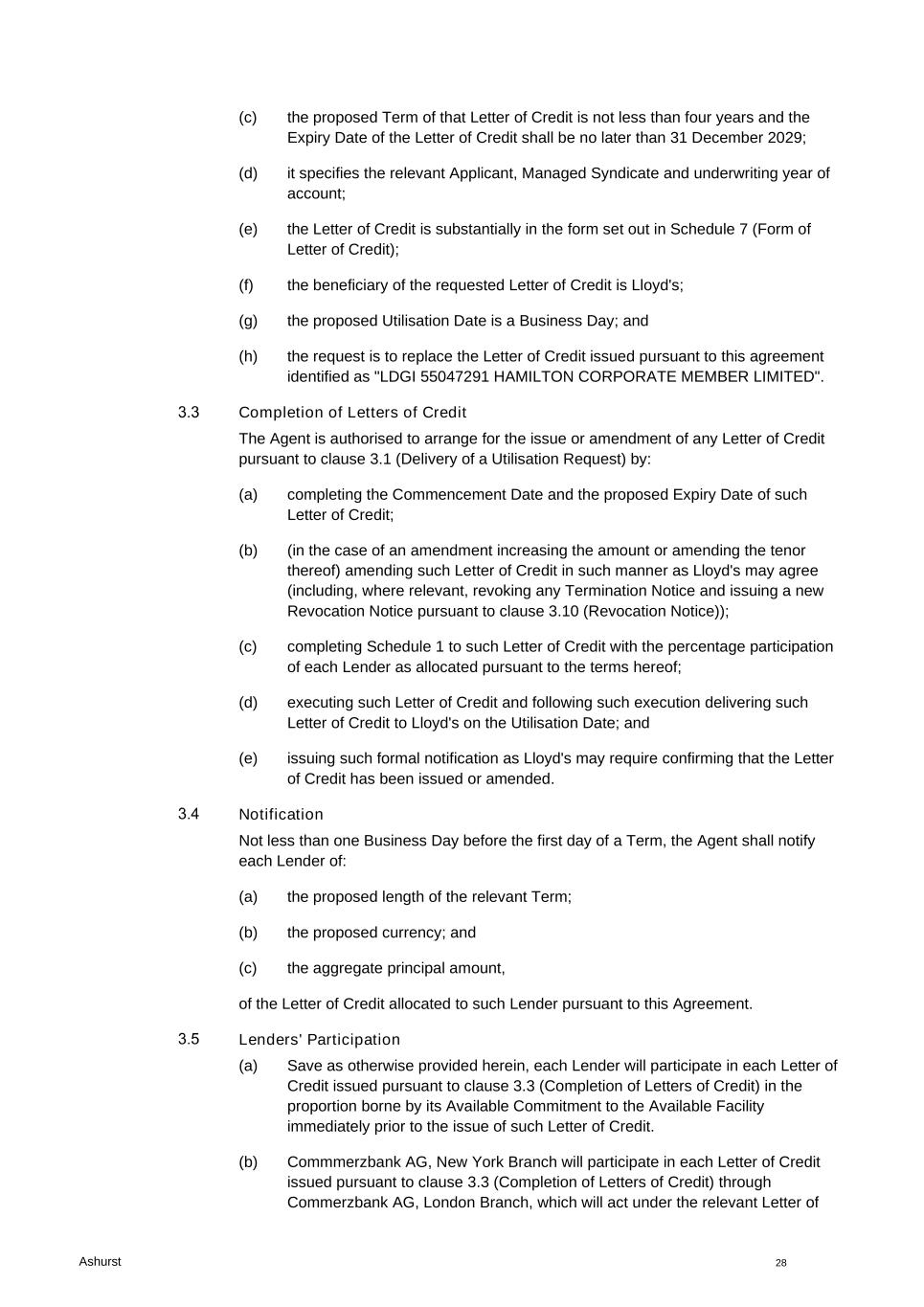 Ashurst 28 (c) the proposed Term of that Letter of Credit is not less than four years and the Expiry Date of the Letter of Credit shall be no later than 31 December 2029; (d) it specifies the relevant Applicant, Managed Syndicate and underwriting year of account; (e) the Letter of Credit is substantially in the form set out in Schedule 7 (Form of Letter of Credit); (f) the beneficiary of the requested Letter of Credit is Lloyd's; (g) the proposed Utilisation Date is a Business Day; and (h) the request is to replace the Letter of Credit issued pursuant to this agreement identified as "LDGI 55047291 HAMILTON CORPORATE MEMBER LIMITED". Completion of Letters of Credit The Agent is authorised to arrange for the issue or amendment of any Letter of Credit pursuant to clause 3.1 (Delivery of a Utilisation Request) by: (a) completing the Commencement Date and the proposed Expiry Date of such Letter of Credit; (b) (in the case of an amendment increasing the amount or amending the tenor thereof) amending such Letter of Credit in such manner as Lloyd's may agree (including, where relevant, revoking any Termination Notice and issuing a new Revocation Notice pursuant to clause 3.10 (Revocation Notice)); (c) completing Schedule 1 to such Letter of Credit with the percentage participation of each Lender as allocated pursuant to the terms hereof; (d) executing such Letter of Credit and following such execution delivering such Letter of Credit to Lloyd's on the Utilisation Date; and (e) issuing such formal notification as Lloyd's may require confirming that the Letter of Credit has been issued or amended. Notification Not less than one Business Day before the first day of a Term, the Agent shall notify each Lender of: (a) the proposed length of the relevant Term; (b) the proposed currency; and (c) the aggregate principal amount, of the Letter of Credit allocated to such Lender pursuant to this Agreement. Lenders' Participation (a) Save as otherwise provided herein, each Lender will participate in each Letter of Credit issued pursuant to clause 3.3 (Completion of Letters of Credit) in the proportion borne by its Available Commitment to the Available Facility immediately prior to the issue of such Letter of Credit. (b) Commmerzbank AG, New York Branch will participate in each Letter of Credit issued pursuant to clause 3.3 (Completion of Letters of Credit) through Commerzbank AG, London Branch, which will act under the relevant Letter of