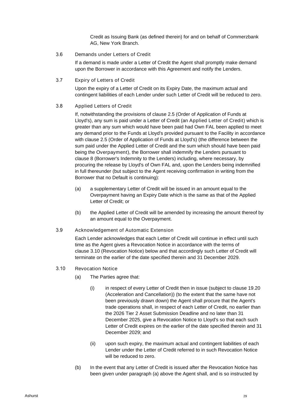 Ashurst 29 Credit as Issuing Bank (as defined therein) for and on behalf of Commerzbank AG, New York Branch. Demands under Letters of Credit If a demand is made under a Letter of Credit the Agent shall promptly make demand upon the Borrower in accordance with this Agreement and notify the Lenders. Expiry of Letters of Credit Upon the expiry of a Letter of Credit on its Expiry Date, the maximum actual and contingent liabilities of each Lender under such Letter of Credit will be reduced to zero. Applied Letters of Credit If, notwithstanding the provisions of clause 2.5 (Order of Application of Funds at Lloyd's), any sum is paid under a Letter of Credit (an Applied Letter of Credit) which is greater than any sum which would have been paid had Own FAL been applied to meet any demand prior to the Funds at Lloyd's provided pursuant to the Facility in accordance with clause 2.5 (Order of Application of Funds at Lloyd's) (the difference between the sum paid under the Applied Letter of Credit and the sum which should have been paid being the Overpayment), the Borrower shall indemnify the Lenders pursuant to clause 8 (Borrower's Indemnity to the Lenders) including, where necessary, by procuring the release by Lloyd's of Own FAL and, upon the Lenders being indemnified in full thereunder (but subject to the Agent receiving confirmation in writing from the Borrower that no Default is continuing): (a) a supplementary Letter of Credit will be issued in an amount equal to the Overpayment having an Expiry Date which is the same as that of the Applied Letter of Credit; or (b) the Applied Letter of Credit will be amended by increasing the amount thereof by an amount equal to the Overpayment. Acknowledgement of Automatic Extension Each Lender acknowledges that each Letter of Credit will continue in effect until such time as the Agent gives a Revocation Notice in accordance with the terms of clause 3.10 (Revocation Notice) below and that accordingly such Letter of Credit will terminate on the earlier of the date specified therein and 31 December 2029. Revocation Notice (a) The Parties agree that: (i) in respect of every Letter of Credit then in issue (subject to clause 19.20 (Acceleration and Cancellation)) (to the extent that the same have not been previously drawn down) the Agent shall procure that the Agent's trade operations shall, in respect of each Letter of Credit, no earlier than the 2026 Tier 2 Asset Submission Deadline and no later than 31 December 2025, give a Revocation Notice to Lloyd's so that each such Letter of Credit expires on the earlier of the date specified therein and 31 December 2029; and (ii) upon such expiry, the maximum actual and contingent liabilities of each Lender under the Letter of Credit referred to in such Revocation Notice will be reduced to zero. (b) In the event that any Letter of Credit is issued after the Revocation Notice has been given under paragraph (a) above the Agent shall, and is so instructed by