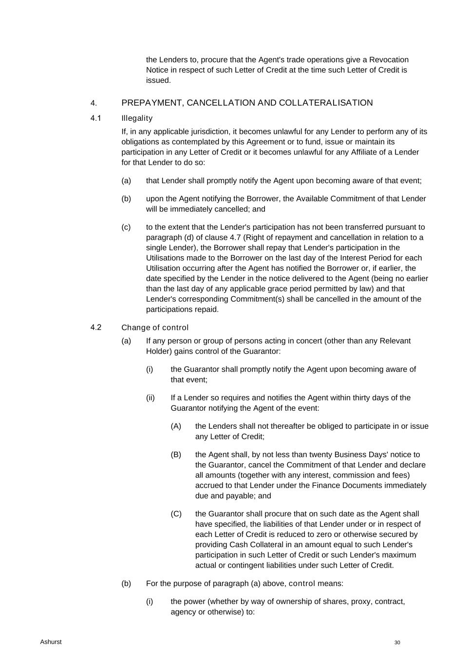 Ashurst 30 the Lenders to, procure that the Agent's trade operations give a Revocation Notice in respect of such Letter of Credit at the time such Letter of Credit is issued. 4. PREPAYMENT, CANCELLATION AND COLLATERALISATION Illegality If, in any applicable jurisdiction, it becomes unlawful for any Lender to perform any of its obligations as contemplated by this Agreement or to fund, issue or maintain its participation in any Letter of Credit or it becomes unlawful for any Affiliate of a Lender for that Lender to do so: (a) that Lender shall promptly notify the Agent upon becoming aware of that event; (b) upon the Agent notifying the Borrower, the Available Commitment of that Lender will be immediately cancelled; and (c) to the extent that the Lender's participation has not been transferred pursuant to paragraph (d) of clause 4.7 (Right of repayment and cancellation in relation to a single Lender), the Borrower shall repay that Lender's participation in the Utilisations made to the Borrower on the last day of the Interest Period for each Utilisation occurring after the Agent has notified the Borrower or, if earlier, the date specified by the Lender in the notice delivered to the Agent (being no earlier than the last day of any applicable grace period permitted by law) and that Lender's corresponding Commitment(s) shall be cancelled in the amount of the participations repaid. Change of control (a) If any person or group of persons acting in concert (other than any Relevant Holder) gains control of the Guarantor: (i) the Guarantor shall promptly notify the Agent upon becoming aware of that event; (ii) If a Lender so requires and notifies the Agent within thirty days of the Guarantor notifying the Agent of the event: (A) the Lenders shall not thereafter be obliged to participate in or issue any Letter of Credit; (B) the Agent shall, by not less than twenty Business Days' notice to the Guarantor, cancel the Commitment of that Lender and declare all amounts (together with any interest, commission and fees) accrued to that Lender under the Finance Documents immediately due and payable; and (C) the Guarantor shall procure that on such date as the Agent shall have specified, the liabilities of that Lender under or in respect of each Letter of Credit is reduced to zero or otherwise secured by providing Cash Collateral in an amount equal to such Lender's participation in such Letter of Credit or such Lender's maximum actual or contingent liabilities under such Letter of Credit. (b) For the purpose of paragraph (a) above, control means: (i) the power (whether by way of ownership of shares, proxy, contract, agency or otherwise) to:
