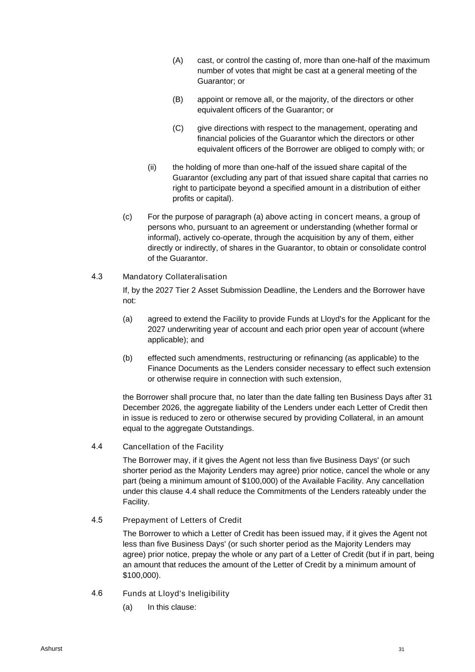 Ashurst 31 (A) cast, or control the casting of, more than one-half of the maximum number of votes that might be cast at a general meeting of the Guarantor; or (B) appoint or remove all, or the majority, of the directors or other equivalent officers of the Guarantor; or (C) give directions with respect to the management, operating and financial policies of the Guarantor which the directors or other equivalent officers of the Borrower are obliged to comply with; or (ii) the holding of more than one-half of the issued share capital of the Guarantor (excluding any part of that issued share capital that carries no right to participate beyond a specified amount in a distribution of either profits or capital). (c) For the purpose of paragraph (a) above acting in concert means, a group of persons who, pursuant to an agreement or understanding (whether formal or informal), actively co-operate, through the acquisition by any of them, either directly or indirectly, of shares in the Guarantor, to obtain or consolidate control of the Guarantor. Mandatory Collateralisation If, by the 2027 Tier 2 Asset Submission Deadline, the Lenders and the Borrower have not: (a) agreed to extend the Facility to provide Funds at Lloyd's for the Applicant for the 2027 underwriting year of account and each prior open year of account (where applicable); and (b) effected such amendments, restructuring or refinancing (as applicable) to the Finance Documents as the Lenders consider necessary to effect such extension or otherwise require in connection with such extension, the Borrower shall procure that, no later than the date falling ten Business Days after 31 December 2026, the aggregate liability of the Lenders under each Letter of Credit then in issue is reduced to zero or otherwise secured by providing Collateral, in an amount equal to the aggregate Outstandings. Cancellation of the Facility The Borrower may, if it gives the Agent not less than five Business Days' (or such shorter period as the Majority Lenders may agree) prior notice, cancel the whole or any part (being a minimum amount of $100,000) of the Available Facility. Any cancellation under this clause 4.4 shall reduce the Commitments of the Lenders rateably under the Facility. Prepayment of Letters of Credit The Borrower to which a Letter of Credit has been issued may, if it gives the Agent not less than five Business Days' (or such shorter period as the Majority Lenders may agree) prior notice, prepay the whole or any part of a Letter of Credit (but if in part, being an amount that reduces the amount of the Letter of Credit by a minimum amount of $100,000). Funds at Lloyd's Ineligibility (a) In this clause:
