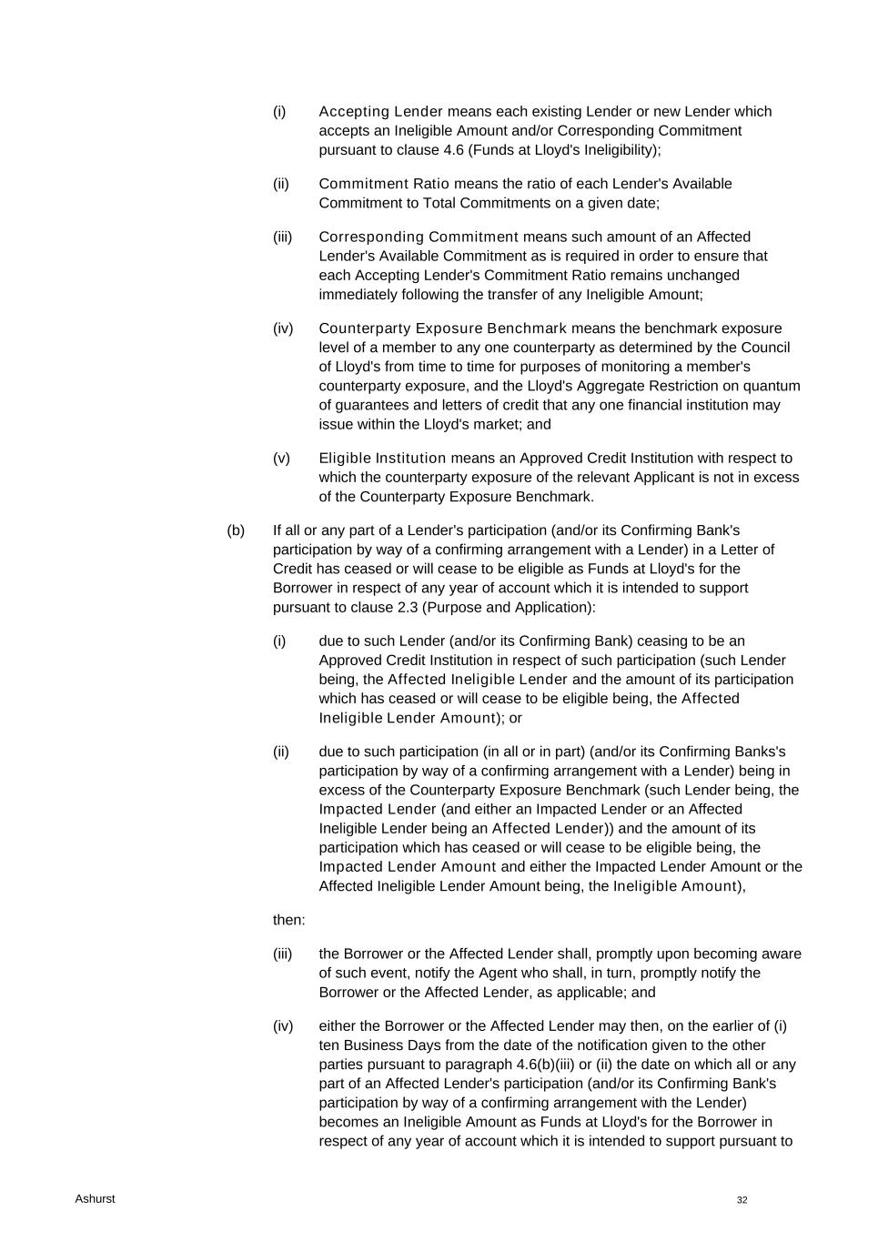 Ashurst 32 (i) Accepting Lender means each existing Lender or new Lender which accepts an Ineligible Amount and/or Corresponding Commitment pursuant to clause 4.6 (Funds at Lloyd's Ineligibility); (ii) Commitment Ratio means the ratio of each Lender's Available Commitment to Total Commitments on a given date; (iii) Corresponding Commitment means such amount of an Affected Lender's Available Commitment as is required in order to ensure that each Accepting Lender's Commitment Ratio remains unchanged immediately following the transfer of any Ineligible Amount; (iv) Counterparty Exposure Benchmark means the benchmark exposure level of a member to any one counterparty as determined by the Council of Lloyd's from time to time for purposes of monitoring a member's counterparty exposure, and the Lloyd's Aggregate Restriction on quantum of guarantees and letters of credit that any one financial institution may issue within the Lloyd's market; and (v) Eligible Institution means an Approved Credit Institution with respect to which the counterparty exposure of the relevant Applicant is not in excess of the Counterparty Exposure Benchmark. (b) If all or any part of a Lender's participation (and/or its Confirming Bank's participation by way of a confirming arrangement with a Lender) in a Letter of Credit has ceased or will cease to be eligible as Funds at Lloyd's for the Borrower in respect of any year of account which it is intended to support pursuant to clause 2.3 (Purpose and Application): (i) due to such Lender (and/or its Confirming Bank) ceasing to be an Approved Credit Institution in respect of such participation (such Lender being, the Affected Ineligible Lender and the amount of its participation which has ceased or will cease to be eligible being, the Affected Ineligible Lender Amount); or (ii) due to such participation (in all or in part) (and/or its Confirming Banks's participation by way of a confirming arrangement with a Lender) being in excess of the Counterparty Exposure Benchmark (such Lender being, the Impacted Lender (and either an Impacted Lender or an Affected Ineligible Lender being an Affected Lender)) and the amount of its participation which has ceased or will cease to be eligible being, the Impacted Lender Amount and either the Impacted Lender Amount or the Affected Ineligible Lender Amount being, the Ineligible Amount), then: (iii) the Borrower or the Affected Lender shall, promptly upon becoming aware of such event, notify the Agent who shall, in turn, promptly notify the Borrower or the Affected Lender, as applicable; and (iv) either the Borrower or the Affected Lender may then, on the earlier of (i) ten Business Days from the date of the notification given to the other parties pursuant to paragraph 4.6(b)(iii) or (ii) the date on which all or any part of an Affected Lender's participation (and/or its Confirming Bank's participation by way of a confirming arrangement with the Lender) becomes an Ineligible Amount as Funds at Lloyd's for the Borrower in respect of any year of account which it is intended to support pursuant to