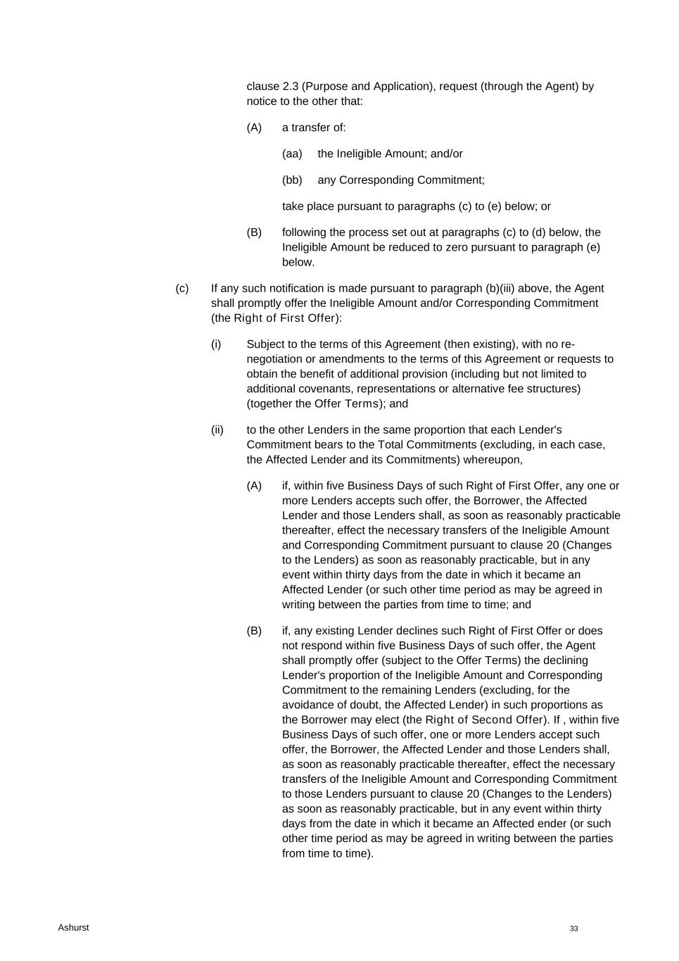 Ashurst 33 clause 2.3 (Purpose and Application), request (through the Agent) by notice to the other that: (A) a transfer of: (aa) the Ineligible Amount; and/or (bb) any Corresponding Commitment; take place pursuant to paragraphs (c) to (e) below; or (B) following the process set out at paragraphs (c) to (d) below, the Ineligible Amount be reduced to zero pursuant to paragraph (e) below. (c) If any such notification is made pursuant to paragraph (b)(iii) above, the Agent shall promptly offer the Ineligible Amount and/or Corresponding Commitment (the Right of First Offer): (i) Subject to the terms of this Agreement (then existing), with no re- negotiation or amendments to the terms of this Agreement or requests to obtain the benefit of additional provision (including but not limited to additional covenants, representations or alternative fee structures) (together the Offer Terms); and (ii) to the other Lenders in the same proportion that each Lender's Commitment bears to the Total Commitments (excluding, in each case, the Affected Lender and its Commitments) whereupon, (A) if, within five Business Days of such Right of First Offer, any one or more Lenders accepts such offer, the Borrower, the Affected Lender and those Lenders shall, as soon as reasonably practicable thereafter, effect the necessary transfers of the Ineligible Amount and Corresponding Commitment pursuant to clause 20 (Changes to the Lenders) as soon as reasonably practicable, but in any event within thirty days from the date in which it became an Affected Lender (or such other time period as may be agreed in writing between the parties from time to time; and (B) if, any existing Lender declines such Right of First Offer or does not respond within five Business Days of such offer, the Agent shall promptly offer (subject to the Offer Terms) the declining Lender's proportion of the Ineligible Amount and Corresponding Commitment to the remaining Lenders (excluding, for the avoidance of doubt, the Affected Lender) in such proportions as the Borrower may elect (the Right of Second Offer). If , within five Business Days of such offer, one or more Lenders accept such offer, the Borrower, the Affected Lender and those Lenders shall, as soon as reasonably practicable thereafter, effect the necessary transfers of the Ineligible Amount and Corresponding Commitment to those Lenders pursuant to clause 20 (Changes to the Lenders) as soon as reasonably practicable, but in any event within thirty days from the date in which it became an Affected ender (or such other time period as may be agreed in writing between the parties from time to time).