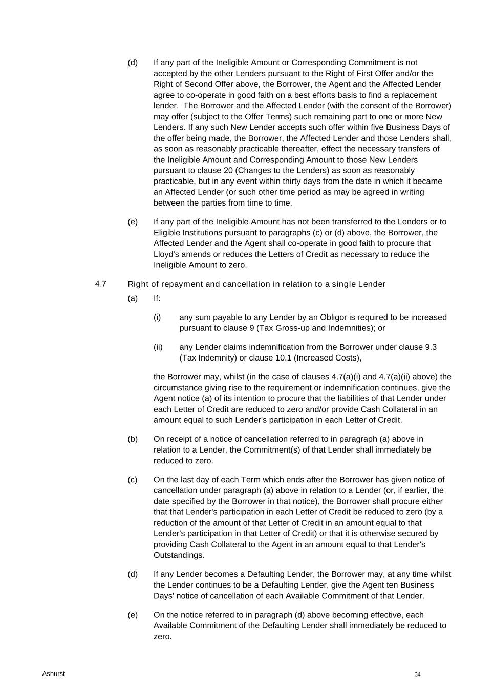 Ashurst 34 (d) If any part of the Ineligible Amount or Corresponding Commitment is not accepted by the other Lenders pursuant to the Right of First Offer and/or the Right of Second Offer above, the Borrower, the Agent and the Affected Lender agree to co-operate in good faith on a best efforts basis to find a replacement lender. The Borrower and the Affected Lender (with the consent of the Borrower) may offer (subject to the Offer Terms) such remaining part to one or more New Lenders. If any such New Lender accepts such offer within five Business Days of the offer being made, the Borrower, the Affected Lender and those Lenders shall, as soon as reasonably practicable thereafter, effect the necessary transfers of the Ineligible Amount and Corresponding Amount to those New Lenders pursuant to clause 20 (Changes to the Lenders) as soon as reasonably practicable, but in any event within thirty days from the date in which it became an Affected Lender (or such other time period as may be agreed in writing between the parties from time to time. (e) If any part of the Ineligible Amount has not been transferred to the Lenders or to Eligible Institutions pursuant to paragraphs (c) or (d) above, the Borrower, the Affected Lender and the Agent shall co-operate in good faith to procure that Lloyd's amends or reduces the Letters of Credit as necessary to reduce the Ineligible Amount to zero. Right of repayment and cancellation in relation to a single Lender (a) If: (i) any sum payable to any Lender by an Obligor is required to be increased pursuant to clause 9 (Tax Gross-up and Indemnities); or (ii) any Lender claims indemnification from the Borrower under clause 9.3 (Tax Indemnity) or clause 10.1 (Increased Costs), the Borrower may, whilst (in the case of clauses 4.7(a)(i) and 4.7(a)(ii) above) the circumstance giving rise to the requirement or indemnification continues, give the Agent notice (a) of its intention to procure that the liabilities of that Lender under each Letter of Credit are reduced to zero and/or provide Cash Collateral in an amount equal to such Lender's participation in each Letter of Credit. (b) On receipt of a notice of cancellation referred to in paragraph (a) above in relation to a Lender, the Commitment(s) of that Lender shall immediately be reduced to zero. (c) On the last day of each Term which ends after the Borrower has given notice of cancellation under paragraph (a) above in relation to a Lender (or, if earlier, the date specified by the Borrower in that notice), the Borrower shall procure either that that Lender's participation in each Letter of Credit be reduced to zero (by a reduction of the amount of that Letter of Credit in an amount equal to that Lender's participation in that Letter of Credit) or that it is otherwise secured by providing Cash Collateral to the Agent in an amount equal to that Lender's Outstandings. (d) If any Lender becomes a Defaulting Lender, the Borrower may, at any time whilst the Lender continues to be a Defaulting Lender, give the Agent ten Business Days' notice of cancellation of each Available Commitment of that Lender. (e) On the notice referred to in paragraph (d) above becoming effective, each Available Commitment of the Defaulting Lender shall immediately be reduced to zero.