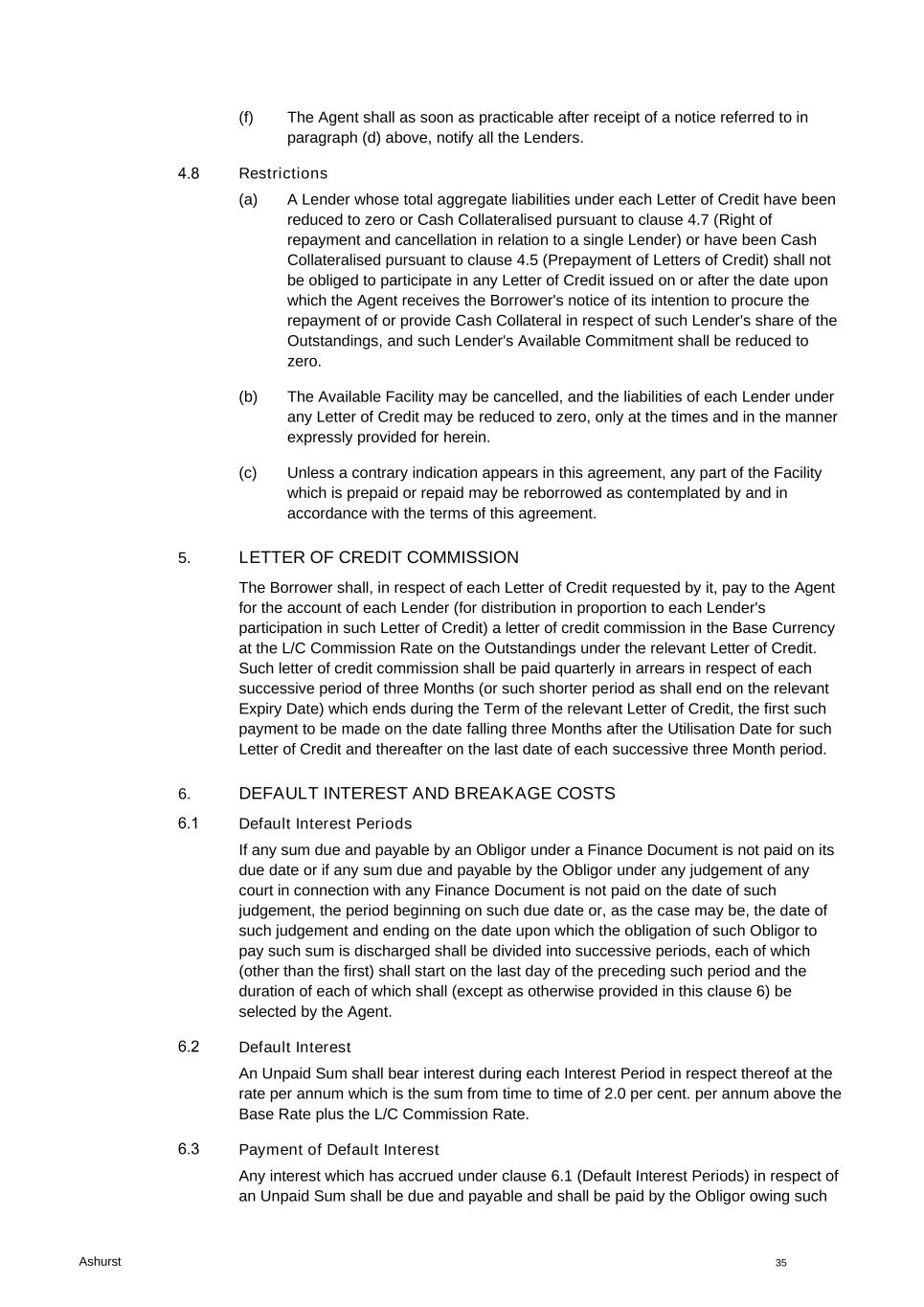 Ashurst 35 (f) The Agent shall as soon as practicable after receipt of a notice referred to in paragraph (d) above, notify all the Lenders. Restrictions (a) A Lender whose total aggregate liabilities under each Letter of Credit have been reduced to zero or Cash Collateralised pursuant to clause 4.7 (Right of repayment and cancellation in relation to a single Lender) or have been Cash Collateralised pursuant to clause 4.5 (Prepayment of Letters of Credit) shall not be obliged to participate in any Letter of Credit issued on or after the date upon which the Agent receives the Borrower's notice of its intention to procure the repayment of or provide Cash Collateral in respect of such Lender's share of the Outstandings, and such Lender's Available Commitment shall be reduced to zero. (b) The Available Facility may be cancelled, and the liabilities of each Lender under any Letter of Credit may be reduced to zero, only at the times and in the manner expressly provided for herein. (c) Unless a contrary indication appears in this agreement, any part of the Facility which is prepaid or repaid may be reborrowed as contemplated by and in accordance with the terms of this agreement. 5. LETTER OF CREDIT COMMISSION The Borrower shall, in respect of each Letter of Credit requested by it, pay to the Agent for the account of each Lender (for distribution in proportion to each Lender's participation in such Letter of Credit) a letter of credit commission in the Base Currency at the L/C Commission Rate on the Outstandings under the relevant Letter of Credit. Such letter of credit commission shall be paid quarterly in arrears in respect of each successive period of three Months (or such shorter period as shall end on the relevant Expiry Date) which ends during the Term of the relevant Letter of Credit, the first such payment to be made on the date falling three Months after the Utilisation Date for such Letter of Credit and thereafter on the last date of each successive three Month period. 6. DEFAULT INTEREST AND BREAKAGE COSTS Default Interest Periods If any sum due and payable by an Obligor under a Finance Document is not paid on its due date or if any sum due and payable by the Obligor under any judgement of any court in connection with any Finance Document is not paid on the date of such judgement, the period beginning on such due date or, as the case may be, the date of such judgement and ending on the date upon which the obligation of such Obligor to pay such sum is discharged shall be divided into successive periods, each of which (other than the first) shall start on the last day of the preceding such period and the duration of each of which shall (except as otherwise provided in this clause 6) be selected by the Agent. Default Interest An Unpaid Sum shall bear interest during each Interest Period in respect thereof at the rate per annum which is the sum from time to time of 2.0 per cent. per annum above the Base Rate plus the L/C Commission Rate. Payment of Default Interest Any interest which has accrued under clause 6.1 (Default Interest Periods) in respect of an Unpaid Sum shall be due and payable and shall be paid by the Obligor owing such
