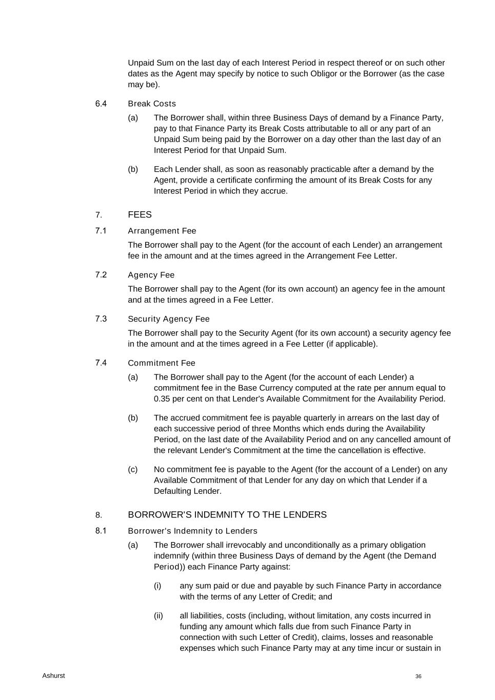 Ashurst 36 Unpaid Sum on the last day of each Interest Period in respect thereof or on such other dates as the Agent may specify by notice to such Obligor or the Borrower (as the case may be). Break Costs (a) The Borrower shall, within three Business Days of demand by a Finance Party, pay to that Finance Party its Break Costs attributable to all or any part of an Unpaid Sum being paid by the Borrower on a day other than the last day of an Interest Period for that Unpaid Sum. (b) Each Lender shall, as soon as reasonably practicable after a demand by the Agent, provide a certificate confirming the amount of its Break Costs for any Interest Period in which they accrue. 7. FEES Arrangement Fee The Borrower shall pay to the Agent (for the account of each Lender) an arrangement fee in the amount and at the times agreed in the Arrangement Fee Letter. Agency Fee The Borrower shall pay to the Agent (for its own account) an agency fee in the amount and at the times agreed in a Fee Letter. Security Agency Fee The Borrower shall pay to the Security Agent (for its own account) a security agency fee in the amount and at the times agreed in a Fee Letter (if applicable). Commitment Fee (a) The Borrower shall pay to the Agent (for the account of each Lender) a commitment fee in the Base Currency computed at the rate per annum equal to 0.35 per cent on that Lender's Available Commitment for the Availability Period. (b) The accrued commitment fee is payable quarterly in arrears on the last day of each successive period of three Months which ends during the Availability Period, on the last date of the Availability Period and on any cancelled amount of the relevant Lender's Commitment at the time the cancellation is effective. (c) No commitment fee is payable to the Agent (for the account of a Lender) on any Available Commitment of that Lender for any day on which that Lender if a Defaulting Lender. 8. BORROWER'S INDEMNITY TO THE LENDERS Borrower's Indemnity to Lenders (a) The Borrower shall irrevocably and unconditionally as a primary obligation indemnify (within three Business Days of demand by the Agent (the Demand Period)) each Finance Party against: (i) any sum paid or due and payable by such Finance Party in accordance with the terms of any Letter of Credit; and (ii) all liabilities, costs (including, without limitation, any costs incurred in funding any amount which falls due from such Finance Party in connection with such Letter of Credit), claims, losses and reasonable expenses which such Finance Party may at any time incur or sustain in