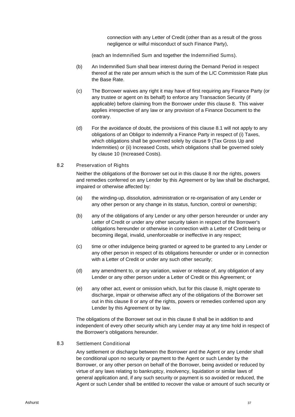 Ashurst 37 connection with any Letter of Credit (other than as a result of the gross negligence or wilful misconduct of such Finance Party), (each an Indemnified Sum and together the Indemnified Sums). (b) An Indemnified Sum shall bear interest during the Demand Period in respect thereof at the rate per annum which is the sum of the L/C Commission Rate plus the Base Rate. (c) The Borrower waives any right it may have of first requiring any Finance Party (or any trustee or agent on its behalf) to enforce any Transaction Security (if applicable) before claiming from the Borrower under this clause 8. This waiver applies irrespective of any law or any provision of a Finance Document to the contrary. (d) For the avoidance of doubt, the provisions of this clause 8.1 will not apply to any obligations of an Obligor to indemnify a Finance Party in respect of (i) Taxes, which obligations shall be governed solely by clause 9 (Tax Gross Up and Indemnities) or (ii) Increased Costs, which obligations shall be governed solely by clause 10 (Increased Costs). Preservation of Rights Neither the obligations of the Borrower set out in this clause 8 nor the rights, powers and remedies conferred on any Lender by this Agreement or by law shall be discharged, impaired or otherwise affected by: (a) the winding-up, dissolution, administration or re-organisation of any Lender or any other person or any change in its status, function, control or ownership; (b) any of the obligations of any Lender or any other person hereunder or under any Letter of Credit or under any other security taken in respect of the Borrower's obligations hereunder or otherwise in connection with a Letter of Credit being or becoming illegal, invalid, unenforceable or ineffective in any respect; (c) time or other indulgence being granted or agreed to be granted to any Lender or any other person in respect of its obligations hereunder or under or in connection with a Letter of Credit or under any such other security; (d) any amendment to, or any variation, waiver or release of, any obligation of any Lender or any other person under a Letter of Credit or this Agreement; or (e) any other act, event or omission which, but for this clause 8, might operate to discharge, impair or otherwise affect any of the obligations of the Borrower set out in this clause 8 or any of the rights, powers or remedies conferred upon any Lender by this Agreement or by law. The obligations of the Borrower set out in this clause 8 shall be in addition to and independent of every other security which any Lender may at any time hold in respect of the Borrower's obligations hereunder. Settlement Conditional Any settlement or discharge between the Borrower and the Agent or any Lender shall be conditional upon no security or payment to the Agent or such Lender by the Borrower, or any other person on behalf of the Borrower, being avoided or reduced by virtue of any laws relating to bankruptcy, insolvency, liquidation or similar laws of general application and, if any such security or payment is so avoided or reduced, the Agent or such Lender shall be entitled to recover the value or amount of such security or