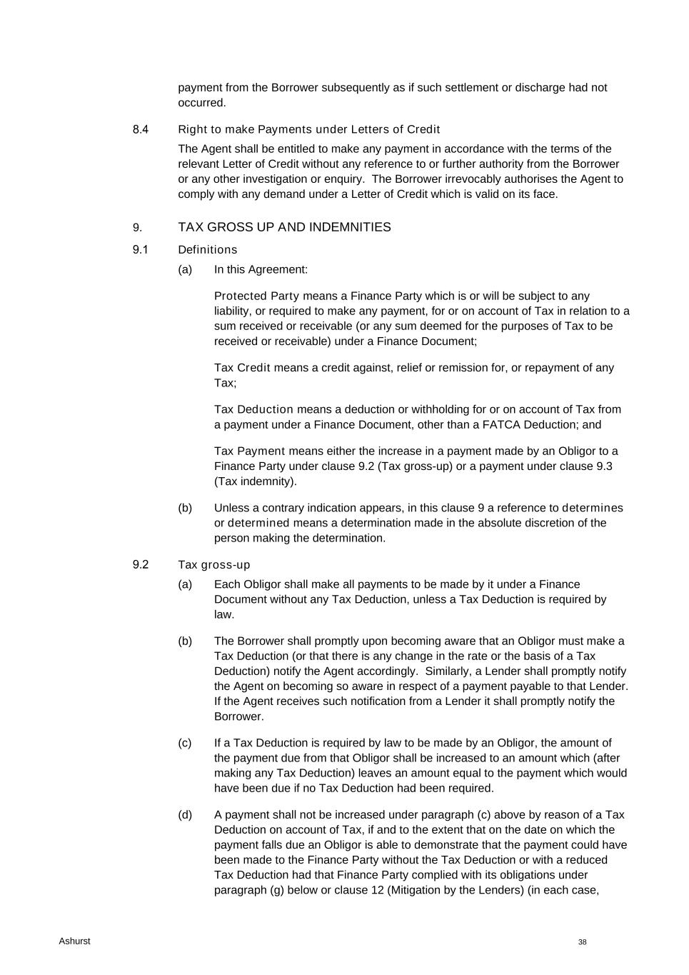 Ashurst 38 payment from the Borrower subsequently as if such settlement or discharge had not occurred. Right to make Payments under Letters of Credit The Agent shall be entitled to make any payment in accordance with the terms of the relevant Letter of Credit without any reference to or further authority from the Borrower or any other investigation or enquiry. The Borrower irrevocably authorises the Agent to comply with any demand under a Letter of Credit which is valid on its face. 9. TAX GROSS UP AND INDEMNITIES Definitions (a) In this Agreement: Protected Party means a Finance Party which is or will be subject to any liability, or required to make any payment, for or on account of Tax in relation to a sum received or receivable (or any sum deemed for the purposes of Tax to be received or receivable) under a Finance Document; Tax Credit means a credit against, relief or remission for, or repayment of any Tax; Tax Deduction means a deduction or withholding for or on account of Tax from a payment under a Finance Document, other than a FATCA Deduction; and Tax Payment means either the increase in a payment made by an Obligor to a Finance Party under clause 9.2 (Tax gross-up) or a payment under clause 9.3 (Tax indemnity). (b) Unless a contrary indication appears, in this clause 9 a reference to determines or determined means a determination made in the absolute discretion of the person making the determination. Tax gross-up (a) Each Obligor shall make all payments to be made by it under a Finance Document without any Tax Deduction, unless a Tax Deduction is required by law. (b) The Borrower shall promptly upon becoming aware that an Obligor must make a Tax Deduction (or that there is any change in the rate or the basis of a Tax Deduction) notify the Agent accordingly. Similarly, a Lender shall promptly notify the Agent on becoming so aware in respect of a payment payable to that Lender. If the Agent receives such notification from a Lender it shall promptly notify the Borrower. (c) If a Tax Deduction is required by law to be made by an Obligor, the amount of the payment due from that Obligor shall be increased to an amount which (after making any Tax Deduction) leaves an amount equal to the payment which would have been due if no Tax Deduction had been required. (d) A payment shall not be increased under paragraph (c) above by reason of a Tax Deduction on account of Tax, if and to the extent that on the date on which the payment falls due an Obligor is able to demonstrate that the payment could have been made to the Finance Party without the Tax Deduction or with a reduced Tax Deduction had that Finance Party complied with its obligations under paragraph (g) below or clause 12 (Mitigation by the Lenders) (in each case,