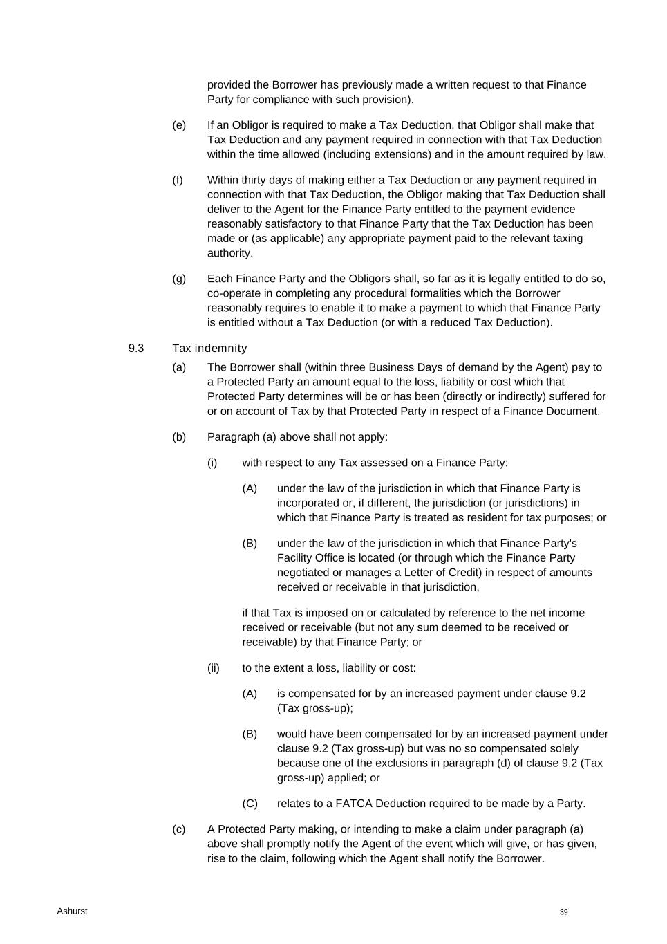 Ashurst 39 provided the Borrower has previously made a written request to that Finance Party for compliance with such provision). (e) If an Obligor is required to make a Tax Deduction, that Obligor shall make that Tax Deduction and any payment required in connection with that Tax Deduction within the time allowed (including extensions) and in the amount required by law. (f) Within thirty days of making either a Tax Deduction or any payment required in connection with that Tax Deduction, the Obligor making that Tax Deduction shall deliver to the Agent for the Finance Party entitled to the payment evidence reasonably satisfactory to that Finance Party that the Tax Deduction has been made or (as applicable) any appropriate payment paid to the relevant taxing authority. (g) Each Finance Party and the Obligors shall, so far as it is legally entitled to do so, co-operate in completing any procedural formalities which the Borrower reasonably requires to enable it to make a payment to which that Finance Party is entitled without a Tax Deduction (or with a reduced Tax Deduction). Tax indemnity (a) The Borrower shall (within three Business Days of demand by the Agent) pay to a Protected Party an amount equal to the loss, liability or cost which that Protected Party determines will be or has been (directly or indirectly) suffered for or on account of Tax by that Protected Party in respect of a Finance Document. (b) Paragraph (a) above shall not apply: (i) with respect to any Tax assessed on a Finance Party: (A) under the law of the jurisdiction in which that Finance Party is incorporated or, if different, the jurisdiction (or jurisdictions) in which that Finance Party is treated as resident for tax purposes; or (B) under the law of the jurisdiction in which that Finance Party's Facility Office is located (or through which the Finance Party negotiated or manages a Letter of Credit) in respect of amounts received or receivable in that jurisdiction, if that Tax is imposed on or calculated by reference to the net income received or receivable (but not any sum deemed to be received or receivable) by that Finance Party; or (ii) to the extent a loss, liability or cost: (A) is compensated for by an increased payment under clause 9.2 (Tax gross-up); (B) would have been compensated for by an increased payment under clause 9.2 (Tax gross-up) but was no so compensated solely because one of the exclusions in paragraph (d) of clause 9.2 (Tax gross-up) applied; or (C) relates to a FATCA Deduction required to be made by a Party. (c) A Protected Party making, or intending to make a claim under paragraph (a) above shall promptly notify the Agent of the event which will give, or has given, rise to the claim, following which the Agent shall notify the Borrower.