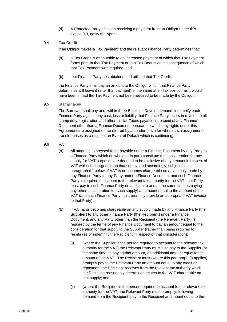 Ashurst 40 (d) A Protected Party shall, on receiving a payment from an Obligor under this clause 9.3, notify the Agent. Tax Credit If an Obligor makes a Tax Payment and the relevant Finance Party determines that: (a) a Tax Credit is attributable to an increased payment of which that Tax Payment forms part, to that Tax Payment or to a Tax Deduction in consequence of which that Tax Payment was required; and (b) that Finance Party has obtained and utilised that Tax Credit, the Finance Party shall pay an amount to the Obligor which that Finance Party determines will leave it (after that payment) in the same after-Tax position as it would have been in had the Tax Payment not been required to be made by the Obligor. Stamp taxes The Borrower shall pay and, within three Business Days of demand, indemnify each Finance Party against any cost, loss or liability that Finance Party incurs in relation to all stamp duty, registration and other similar Taxes payable in respect of any Finance Document other than a Finance Document pursuant to which any rights under this Agreement are assigned or transferred by a Lender (save for where such assignment or transfer arises as a result of an Event of Default which is continuing). VAT (a) All amounts expressed to be payable under a Finance Document by any Party to a Finance Party which (in whole or in part) constitute the consideration for any supply for VAT purposes are deemed to be exclusive of any amount in respect of VAT which is chargeable on that supply, and accordingly, subject to paragraph (b) below, if VAT is or becomes chargeable on any supply made by any Finance Party to any Party under a Finance Document and such Finance Party is required to account to the relevant tax authority for the VAT, that Party must pay to such Finance Party (in addition to and at the same time as paying any other consideration for such supply) an amount equal to the amount of the VAT (and such Finance Party must promptly provide an appropriate VAT invoice to that Party). (b) If VAT is or becomes chargeable on any supply made by any Finance Party (the Supplier) to any other Finance Party (the Recipient) under a Finance Document, and any Party other than the Recipient (the Relevant Party) is required by the terms of any Finance Document to pay an amount equal to the consideration for that supply to the Supplier (rather than being required to reimburse or indemnify the Recipient in respect of that consideration): (i) (where the Supplier is the person required to account to the relevant tax authority for the VAT) the Relevant Party must also pay to the Supplier (at the same time as paying that amount) an additional amount equal to the amount of the VAT. The Recipient must (where this paragraph (i) applies) promptly pay to the Relevant Party an amount equal to any credit or repayment the Recipient receives from the relevant tax authority which the Recipient reasonably determines relates to the VAT chargeable on that supply; and (ii) (where the Recipient is the person required to account to the relevant tax authority for the VAT) the Relevant Party must promptly, following demand from the Recipient, pay to the Recipient an amount equal to the