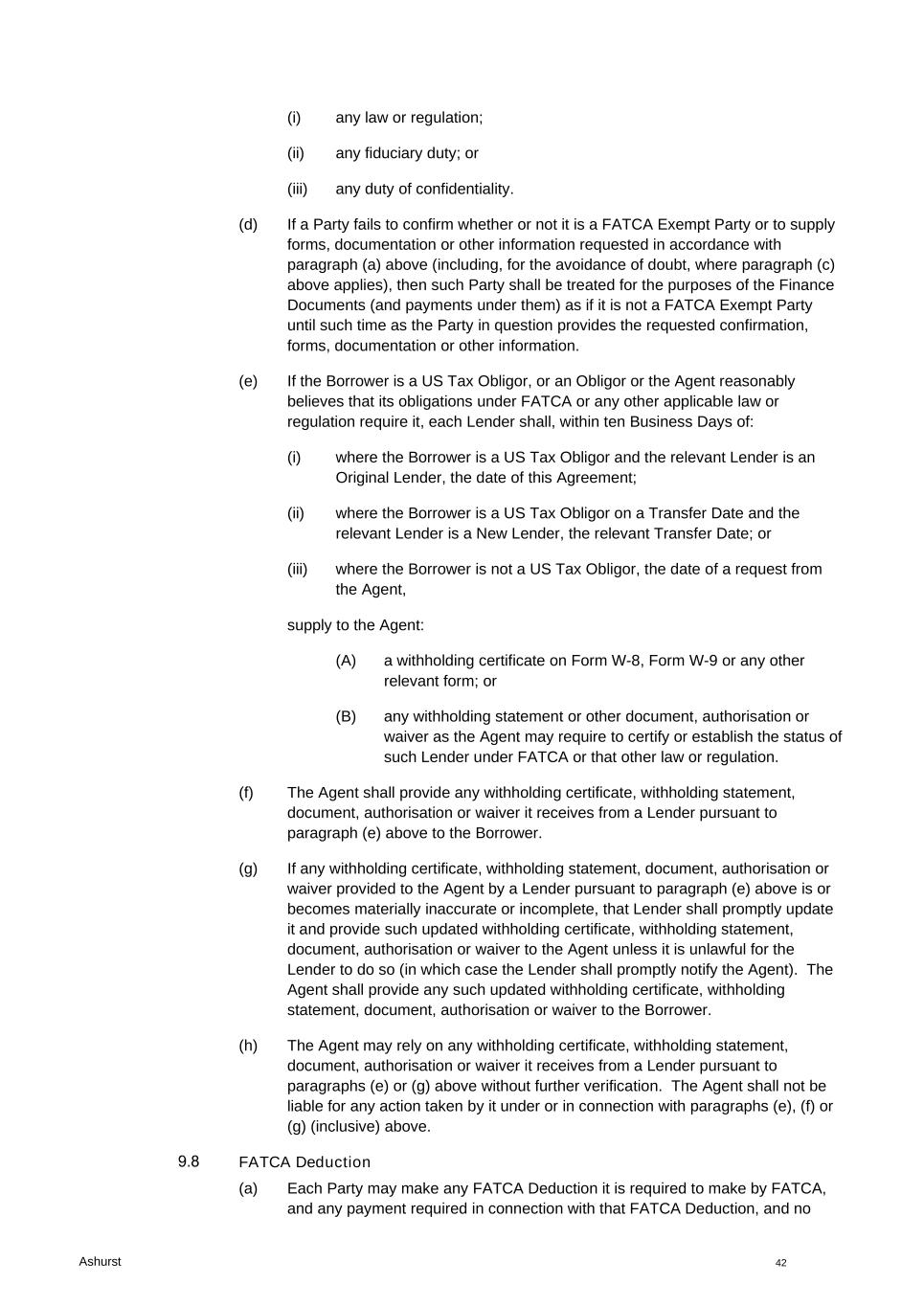 Ashurst 42 (i) any law or regulation; (ii) any fiduciary duty; or (iii) any duty of confidentiality. (d) If a Party fails to confirm whether or not it is a FATCA Exempt Party or to supply forms, documentation or other information requested in accordance with paragraph (a) above (including, for the avoidance of doubt, where paragraph (c) above applies), then such Party shall be treated for the purposes of the Finance Documents (and payments under them) as if it is not a FATCA Exempt Party until such time as the Party in question provides the requested confirmation, forms, documentation or other information. (e) If the Borrower is a US Tax Obligor, or an Obligor or the Agent reasonably believes that its obligations under FATCA or any other applicable law or regulation require it, each Lender shall, within ten Business Days of: (i) where the Borrower is a US Tax Obligor and the relevant Lender is an Original Lender, the date of this Agreement; (ii) where the Borrower is a US Tax Obligor on a Transfer Date and the relevant Lender is a New Lender, the relevant Transfer Date; or (iii) where the Borrower is not a US Tax Obligor, the date of a request from the Agent, supply to the Agent: (A) a withholding certificate on Form W-8, Form W-9 or any other relevant form; or (B) any withholding statement or other document, authorisation or waiver as the Agent may require to certify or establish the status of such Lender under FATCA or that other law or regulation. (f) The Agent shall provide any withholding certificate, withholding statement, document, authorisation or waiver it receives from a Lender pursuant to paragraph (e) above to the Borrower. (g) If any withholding certificate, withholding statement, document, authorisation or waiver provided to the Agent by a Lender pursuant to paragraph (e) above is or becomes materially inaccurate or incomplete, that Lender shall promptly update it and provide such updated withholding certificate, withholding statement, document, authorisation or waiver to the Agent unless it is unlawful for the Lender to do so (in which case the Lender shall promptly notify the Agent). The Agent shall provide any such updated withholding certificate, withholding statement, document, authorisation or waiver to the Borrower. (h) The Agent may rely on any withholding certificate, withholding statement, document, authorisation or waiver it receives from a Lender pursuant to paragraphs (e) or (g) above without further verification. The Agent shall not be liable for any action taken by it under or in connection with paragraphs (e), (f) or (g) (inclusive) above. FATCA Deduction (a) Each Party may make any FATCA Deduction it is required to make by FATCA, and any payment required in connection with that FATCA Deduction, and no