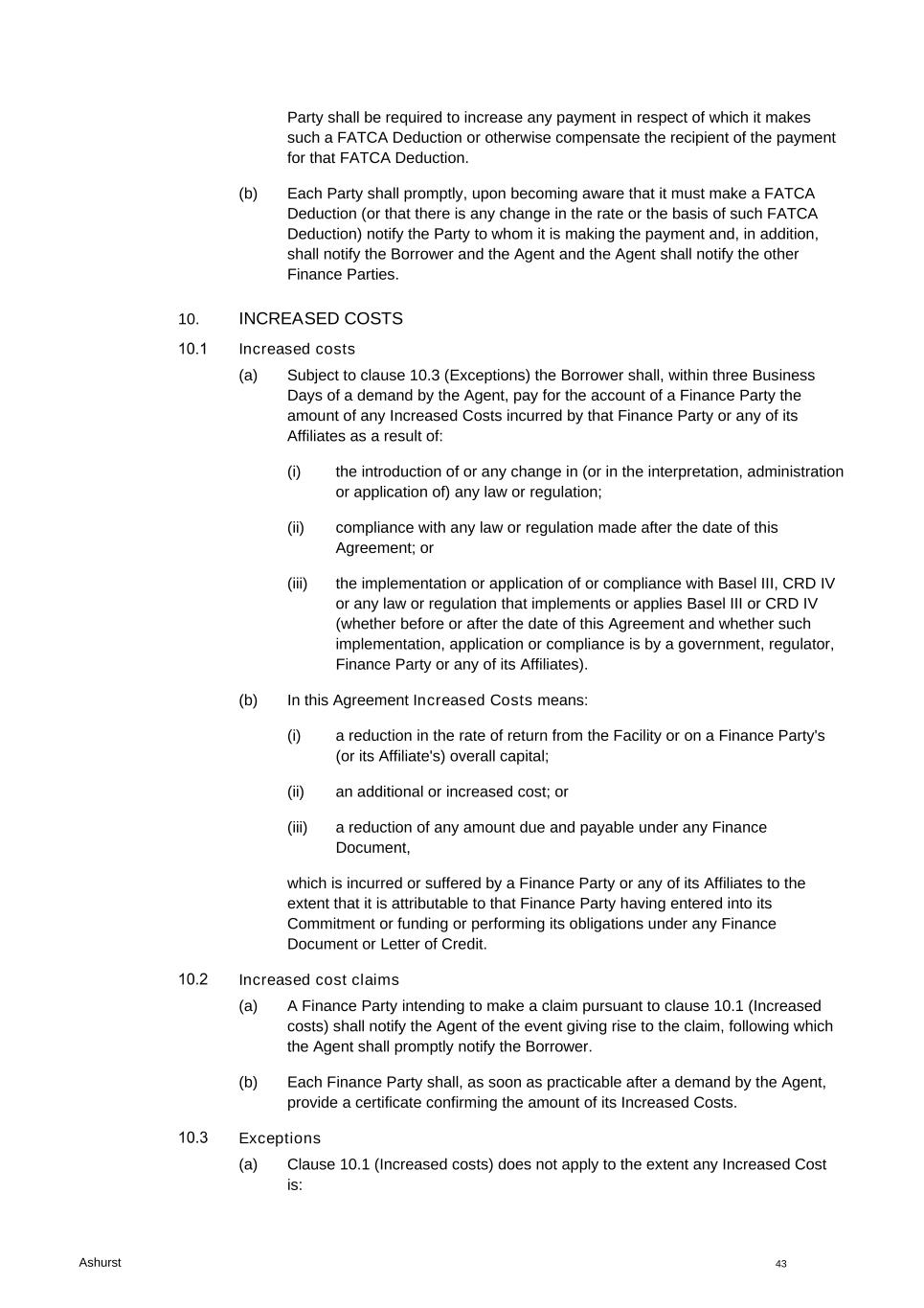 Ashurst 43 Party shall be required to increase any payment in respect of which it makes such a FATCA Deduction or otherwise compensate the recipient of the payment for that FATCA Deduction. (b) Each Party shall promptly, upon becoming aware that it must make a FATCA Deduction (or that there is any change in the rate or the basis of such FATCA Deduction) notify the Party to whom it is making the payment and, in addition, shall notify the Borrower and the Agent and the Agent shall notify the other Finance Parties. 10. INCREASED COSTS Increased costs (a) Subject to clause 10.3 (Exceptions) the Borrower shall, within three Business Days of a demand by the Agent, pay for the account of a Finance Party the amount of any Increased Costs incurred by that Finance Party or any of its Affiliates as a result of: (i) the introduction of or any change in (or in the interpretation, administration or application of) any law or regulation; (ii) compliance with any law or regulation made after the date of this Agreement; or (iii) the implementation or application of or compliance with Basel III, CRD IV or any law or regulation that implements or applies Basel III or CRD IV (whether before or after the date of this Agreement and whether such implementation, application or compliance is by a government, regulator, Finance Party or any of its Affiliates). (b) In this Agreement Increased Costs means: (i) a reduction in the rate of return from the Facility or on a Finance Party's (or its Affiliate's) overall capital; (ii) an additional or increased cost; or (iii) a reduction of any amount due and payable under any Finance Document, which is incurred or suffered by a Finance Party or any of its Affiliates to the extent that it is attributable to that Finance Party having entered into its Commitment or funding or performing its obligations under any Finance Document or Letter of Credit. Increased cost claims (a) A Finance Party intending to make a claim pursuant to clause 10.1 (Increased costs) shall notify the Agent of the event giving rise to the claim, following which the Agent shall promptly notify the Borrower. (b) Each Finance Party shall, as soon as practicable after a demand by the Agent, provide a certificate confirming the amount of its Increased Costs. Exceptions (a) Clause 10.1 (Increased costs) does not apply to the extent any Increased Cost is:
