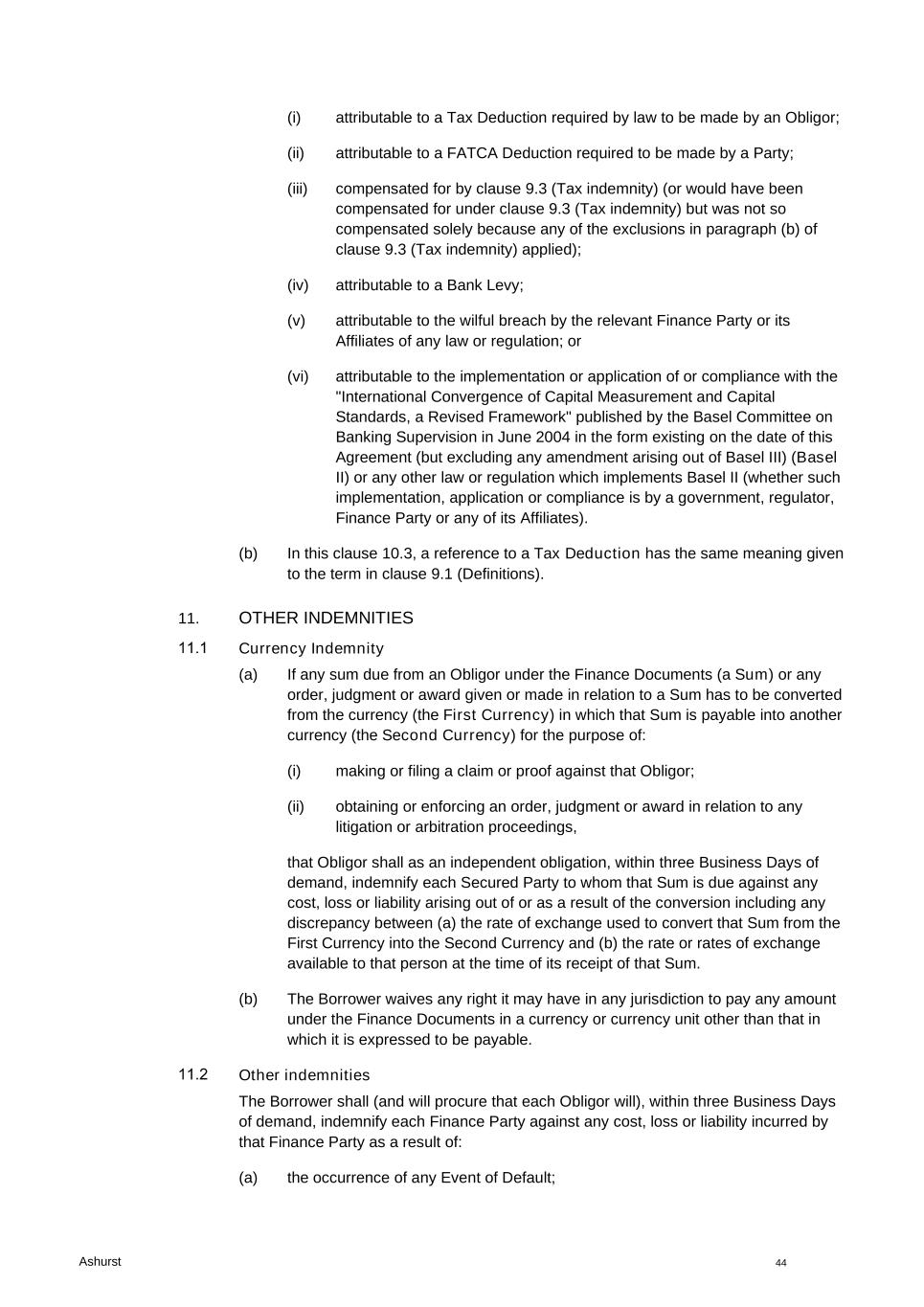 Ashurst 44 (i) attributable to a Tax Deduction required by law to be made by an Obligor; (ii) attributable to a FATCA Deduction required to be made by a Party; (iii) compensated for by clause 9.3 (Tax indemnity) (or would have been compensated for under clause 9.3 (Tax indemnity) but was not so compensated solely because any of the exclusions in paragraph (b) of clause 9.3 (Tax indemnity) applied); (iv) attributable to a Bank Levy; (v) attributable to the wilful breach by the relevant Finance Party or its Affiliates of any law or regulation; or (vi) attributable to the implementation or application of or compliance with the "International Convergence of Capital Measurement and Capital Standards, a Revised Framework" published by the Basel Committee on Banking Supervision in June 2004 in the form existing on the date of this Agreement (but excluding any amendment arising out of Basel III) (Basel II) or any other law or regulation which implements Basel II (whether such implementation, application or compliance is by a government, regulator, Finance Party or any of its Affiliates). (b) In this clause 10.3, a reference to a Tax Deduction has the same meaning given to the term in clause 9.1 (Definitions). 11. OTHER INDEMNITIES Currency Indemnity (a) If any sum due from an Obligor under the Finance Documents (a Sum) or any order, judgment or award given or made in relation to a Sum has to be converted from the currency (the First Currency) in which that Sum is payable into another currency (the Second Currency) for the purpose of: (i) making or filing a claim or proof against that Obligor; (ii) obtaining or enforcing an order, judgment or award in relation to any litigation or arbitration proceedings, that Obligor shall as an independent obligation, within three Business Days of demand, indemnify each Secured Party to whom that Sum is due against any cost, loss or liability arising out of or as a result of the conversion including any discrepancy between (a) the rate of exchange used to convert that Sum from the First Currency into the Second Currency and (b) the rate or rates of exchange available to that person at the time of its receipt of that Sum. (b) The Borrower waives any right it may have in any jurisdiction to pay any amount under the Finance Documents in a currency or currency unit other than that in which it is expressed to be payable. Other indemnities The Borrower shall (and will procure that each Obligor will), within three Business Days of demand, indemnify each Finance Party against any cost, loss or liability incurred by that Finance Party as a result of: (a) the occurrence of any Event of Default;