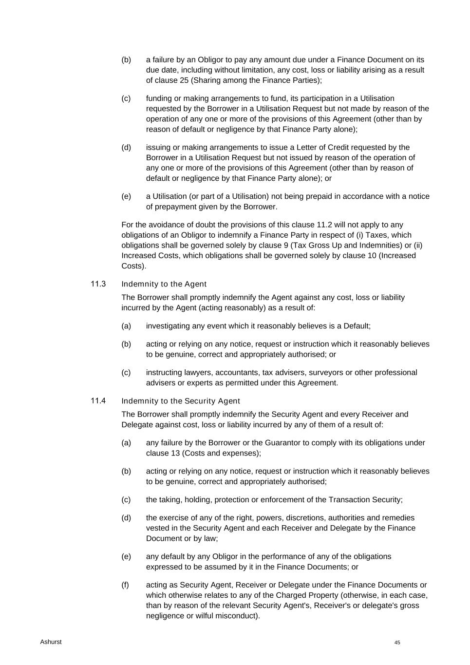 Ashurst 45 (b) a failure by an Obligor to pay any amount due under a Finance Document on its due date, including without limitation, any cost, loss or liability arising as a result of clause 25 (Sharing among the Finance Parties); (c) funding or making arrangements to fund, its participation in a Utilisation requested by the Borrower in a Utilisation Request but not made by reason of the operation of any one or more of the provisions of this Agreement (other than by reason of default or negligence by that Finance Party alone); (d) issuing or making arrangements to issue a Letter of Credit requested by the Borrower in a Utilisation Request but not issued by reason of the operation of any one or more of the provisions of this Agreement (other than by reason of default or negligence by that Finance Party alone); or (e) a Utilisation (or part of a Utilisation) not being prepaid in accordance with a notice of prepayment given by the Borrower. For the avoidance of doubt the provisions of this clause 11.2 will not apply to any obligations of an Obligor to indemnify a Finance Party in respect of (i) Taxes, which obligations shall be governed solely by clause 9 (Tax Gross Up and Indemnities) or (ii) Increased Costs, which obligations shall be governed solely by clause 10 (Increased Costs). Indemnity to the Agent The Borrower shall promptly indemnify the Agent against any cost, loss or liability incurred by the Agent (acting reasonably) as a result of: (a) investigating any event which it reasonably believes is a Default; (b) acting or relying on any notice, request or instruction which it reasonably believes to be genuine, correct and appropriately authorised; or (c) instructing lawyers, accountants, tax advisers, surveyors or other professional advisers or experts as permitted under this Agreement. Indemnity to the Security Agent The Borrower shall promptly indemnify the Security Agent and every Receiver and Delegate against cost, loss or liability incurred by any of them of a result of: (a) any failure by the Borrower or the Guarantor to comply with its obligations under clause 13 (Costs and expenses); (b) acting or relying on any notice, request or instruction which it reasonably believes to be genuine, correct and appropriately authorised; (c) the taking, holding, protection or enforcement of the Transaction Security; (d) the exercise of any of the right, powers, discretions, authorities and remedies vested in the Security Agent and each Receiver and Delegate by the Finance Document or by law; (e) any default by any Obligor in the performance of any of the obligations expressed to be assumed by it in the Finance Documents; or (f) acting as Security Agent, Receiver or Delegate under the Finance Documents or which otherwise relates to any of the Charged Property (otherwise, in each case, than by reason of the relevant Security Agent's, Receiver's or delegate's gross negligence or wilful misconduct).