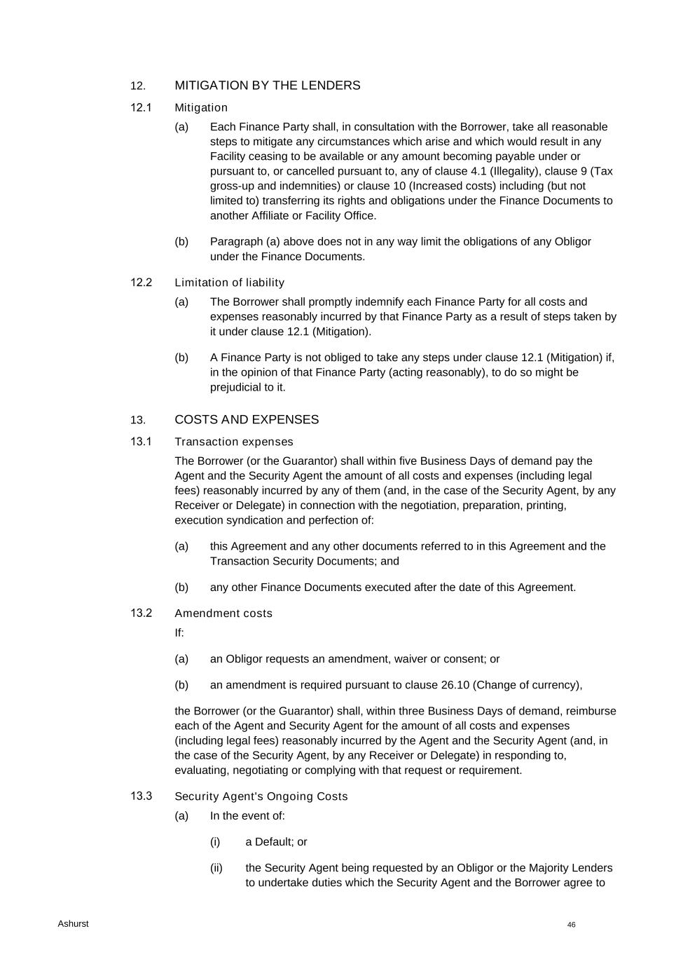 Ashurst 46 12. MITIGATION BY THE LENDERS Mitigation (a) Each Finance Party shall, in consultation with the Borrower, take all reasonable steps to mitigate any circumstances which arise and which would result in any Facility ceasing to be available or any amount becoming payable under or pursuant to, or cancelled pursuant to, any of clause 4.1 (Illegality), clause 9 (Tax gross-up and indemnities) or clause 10 (Increased costs) including (but not limited to) transferring its rights and obligations under the Finance Documents to another Affiliate or Facility Office. (b) Paragraph (a) above does not in any way limit the obligations of any Obligor under the Finance Documents. Limitation of liability (a) The Borrower shall promptly indemnify each Finance Party for all costs and expenses reasonably incurred by that Finance Party as a result of steps taken by it under clause 12.1 (Mitigation). (b) A Finance Party is not obliged to take any steps under clause 12.1 (Mitigation) if, in the opinion of that Finance Party (acting reasonably), to do so might be prejudicial to it. 13. COSTS AND EXPENSES Transaction expenses The Borrower (or the Guarantor) shall within five Business Days of demand pay the Agent and the Security Agent the amount of all costs and expenses (including legal fees) reasonably incurred by any of them (and, in the case of the Security Agent, by any Receiver or Delegate) in connection with the negotiation, preparation, printing, execution syndication and perfection of: (a) this Agreement and any other documents referred to in this Agreement and the Transaction Security Documents; and (b) any other Finance Documents executed after the date of this Agreement. Amendment costs If: (a) an Obligor requests an amendment, waiver or consent; or (b) an amendment is required pursuant to clause 26.10 (Change of currency), the Borrower (or the Guarantor) shall, within three Business Days of demand, reimburse each of the Agent and Security Agent for the amount of all costs and expenses (including legal fees) reasonably incurred by the Agent and the Security Agent (and, in the case of the Security Agent, by any Receiver or Delegate) in responding to, evaluating, negotiating or complying with that request or requirement. Security Agent's Ongoing Costs (a) In the event of: (i) a Default; or (ii) the Security Agent being requested by an Obligor or the Majority Lenders to undertake duties which the Security Agent and the Borrower agree to