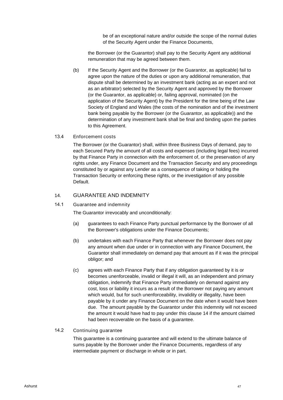 Ashurst 47 be of an exceptional nature and/or outside the scope of the normal duties of the Security Agent under the Finance Documents, the Borrower (or the Guarantor) shall pay to the Security Agent any additional remuneration that may be agreed between them. (b) If the Security Agent and the Borrower (or the Guarantor, as applicable) fail to agree upon the nature of the duties or upon any additional remuneration, that dispute shall be determined by an investment bank (acting as an expert and not as an arbitrator) selected by the Security Agent and approved by the Borrower (or the Guarantor, as applicable) or, failing approval, nominated (on the application of the Security Agent) by the President for the time being of the Law Society of England and Wales (the costs of the nomination and of the investment bank being payable by the Borrower (or the Guarantor, as applicable)) and the determination of any investment bank shall be final and binding upon the parties to this Agreement. Enforcement costs The Borrower (or the Guarantor) shall, within three Business Days of demand, pay to each Secured Party the amount of all costs and expenses (including legal fees) incurred by that Finance Party in connection with the enforcement of, or the preservation of any rights under, any Finance Document and the Transaction Security and any proceedings constituted by or against any Lender as a consequence of taking or holding the Transaction Security or enforcing these rights, or the investigation of any possible Default. 14. GUARANTEE AND INDEMNITY Guarantee and indemnity The Guarantor irrevocably and unconditionally: (a) guarantees to each Finance Party punctual performance by the Borrower of all the Borrower's obligations under the Finance Documents; (b) undertakes with each Finance Party that whenever the Borrower does not pay any amount when due under or in connection with any Finance Document, the Guarantor shall immediately on demand pay that amount as if it was the principal obligor; and (c) agrees with each Finance Party that if any obligation guaranteed by it is or becomes unenforceable, invalid or illegal it will, as an independent and primary obligation, indemnify that Finance Party immediately on demand against any cost, loss or liability it incurs as a result of the Borrower not paying any amount which would, but for such unenforceability, invalidity or illegality, have been payable by it under any Finance Document on the date when it would have been due. The amount payable by the Guarantor under this indemnity will not exceed the amount it would have had to pay under this clause 14 if the amount claimed had been recoverable on the basis of a guarantee. Continuing guarantee This guarantee is a continuing guarantee and will extend to the ultimate balance of sums payable by the Borrower under the Finance Documents, regardless of any intermediate payment or discharge in whole or in part.