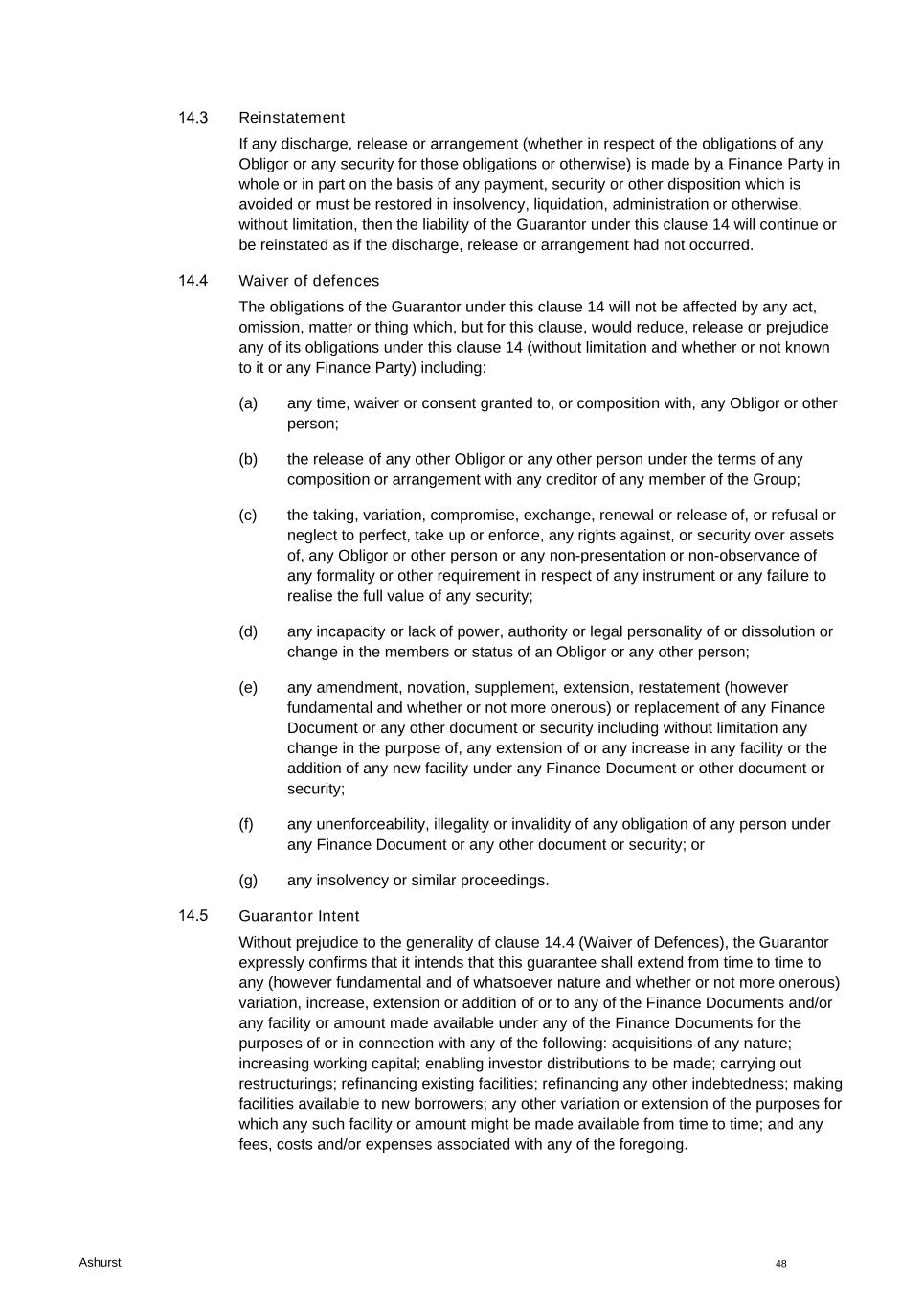 Ashurst 48 Reinstatement If any discharge, release or arrangement (whether in respect of the obligations of any Obligor or any security for those obligations or otherwise) is made by a Finance Party in whole or in part on the basis of any payment, security or other disposition which is avoided or must be restored in insolvency, liquidation, administration or otherwise, without limitation, then the liability of the Guarantor under this clause 14 will continue or be reinstated as if the discharge, release or arrangement had not occurred. Waiver of defences The obligations of the Guarantor under this clause 14 will not be affected by any act, omission, matter or thing which, but for this clause, would reduce, release or prejudice any of its obligations under this clause 14 (without limitation and whether or not known to it or any Finance Party) including: (a) any time, waiver or consent granted to, or composition with, any Obligor or other person; (b) the release of any other Obligor or any other person under the terms of any composition or arrangement with any creditor of any member of the Group; (c) the taking, variation, compromise, exchange, renewal or release of, or refusal or neglect to perfect, take up or enforce, any rights against, or security over assets of, any Obligor or other person or any non-presentation or non-observance of any formality or other requirement in respect of any instrument or any failure to realise the full value of any security; (d) any incapacity or lack of power, authority or legal personality of or dissolution or change in the members or status of an Obligor or any other person; (e) any amendment, novation, supplement, extension, restatement (however fundamental and whether or not more onerous) or replacement of any Finance Document or any other document or security including without limitation any change in the purpose of, any extension of or any increase in any facility or the addition of any new facility under any Finance Document or other document or security; (f) any unenforceability, illegality or invalidity of any obligation of any person under any Finance Document or any other document or security; or (g) any insolvency or similar proceedings. Guarantor Intent Without prejudice to the generality of clause 14.4 (Waiver of Defences), the Guarantor expressly confirms that it intends that this guarantee shall extend from time to time to any (however fundamental and of whatsoever nature and whether or not more onerous) variation, increase, extension or addition of or to any of the Finance Documents and/or any facility or amount made available under any of the Finance Documents for the purposes of or in connection with any of the following: acquisitions of any nature; increasing working capital; enabling investor distributions to be made; carrying out restructurings; refinancing existing facilities; refinancing any other indebtedness; making facilities available to new borrowers; any other variation or extension of the purposes for which any such facility or amount might be made available from time to time; and any fees, costs and/or expenses associated with any of the foregoing.