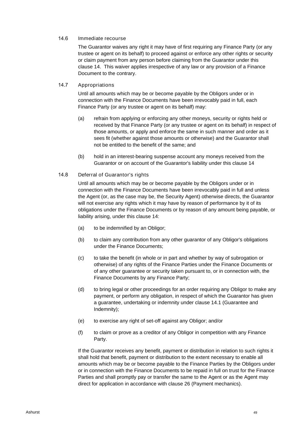 Ashurst 49 Immediate recourse The Guarantor waives any right it may have of first requiring any Finance Party (or any trustee or agent on its behalf) to proceed against or enforce any other rights or security or claim payment from any person before claiming from the Guarantor under this clause 14. This waiver applies irrespective of any law or any provision of a Finance Document to the contrary. Appropriations Until all amounts which may be or become payable by the Obligors under or in connection with the Finance Documents have been irrevocably paid in full, each Finance Party (or any trustee or agent on its behalf) may: (a) refrain from applying or enforcing any other moneys, security or rights held or received by that Finance Party (or any trustee or agent on its behalf) in respect of those amounts, or apply and enforce the same in such manner and order as it sees fit (whether against those amounts or otherwise) and the Guarantor shall not be entitled to the benefit of the same; and (b) hold in an interest-bearing suspense account any moneys received from the Guarantor or on account of the Guarantor's liability under this clause 14 Deferral of Guarantor's rights Until all amounts which may be or become payable by the Obligors under or in connection with the Finance Documents have been irrevocably paid in full and unless the Agent (or, as the case may be, the Security Agent) otherwise directs, the Guarantor will not exercise any rights which it may have by reason of performance by it of its obligations under the Finance Documents or by reason of any amount being payable, or liability arising, under this clause 14: (a) to be indemnified by an Obligor; (b) to claim any contribution from any other guarantor of any Obligor's obligations under the Finance Documents; (c) to take the benefit (in whole or in part and whether by way of subrogation or otherwise) of any rights of the Finance Parties under the Finance Documents or of any other guarantee or security taken pursuant to, or in connection with, the Finance Documents by any Finance Party; (d) to bring legal or other proceedings for an order requiring any Obligor to make any payment, or perform any obligation, in respect of which the Guarantor has given a guarantee, undertaking or indemnity under clause 14.1 (Guarantee and Indemnity); (e) to exercise any right of set-off against any Obligor; and/or (f) to claim or prove as a creditor of any Obligor in competition with any Finance Party. If the Guarantor receives any benefit, payment or distribution in relation to such rights it shall hold that benefit, payment or distribution to the extent necessary to enable all amounts which may be or become payable to the Finance Parties by the Obligors under or in connection with the Finance Documents to be repaid in full on trust for the Finance Parties and shall promptly pay or transfer the same to the Agent or as the Agent may direct for application in accordance with clause 26 (Payment mechanics).
