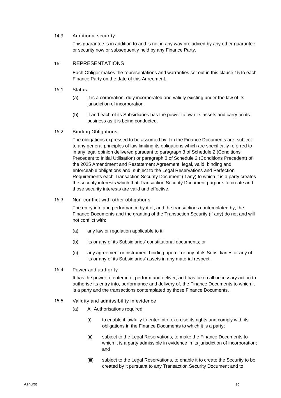 Ashurst 50 Additional security This guarantee is in addition to and is not in any way prejudiced by any other guarantee or security now or subsequently held by any Finance Party. 15. REPRESENTATIONS Each Obligor makes the representations and warranties set out in this clause 15 to each Finance Party on the date of this Agreement. Status (a) It is a corporation, duly incorporated and validly existing under the law of its jurisdiction of incorporation. (b) It and each of its Subsidiaries has the power to own its assets and carry on its business as it is being conducted. Binding Obligations The obligations expressed to be assumed by it in the Finance Documents are, subject to any general principles of law limiting its obligations which are specifically referred to in any legal opinion delivered pursuant to paragraph 3 of Schedule 2 (Conditions Precedent to Initial Utilisation) or paragraph 3 of Schedule 2 (Conditions Precedent) of the 2025 Amendment and Restatement Agreement, legal, valid, binding and enforceable obligations and, subject to the Legal Reservations and Perfection Requirements each Transaction Security Document (if any) to which it is a party creates the security interests which that Transaction Security Document purports to create and those security interests are valid and effective. Non-conflict with other obligations The entry into and performance by it of, and the transactions contemplated by, the Finance Documents and the granting of the Transaction Security (if any) do not and will not conflict with: (a) any law or regulation applicable to it; (b) its or any of its Subsidiaries' constitutional documents; or (c) any agreement or instrument binding upon it or any of its Subsidiaries or any of its or any of its Subsidiaries' assets in any material respect. Power and authority It has the power to enter into, perform and deliver, and has taken all necessary action to authorise its entry into, performance and delivery of, the Finance Documents to which it is a party and the transactions contemplated by those Finance Documents. Validity and admissibility in evidence (a) All Authorisations required: (i) to enable it lawfully to enter into, exercise its rights and comply with its obligations in the Finance Documents to which it is a party; (ii) subject to the Legal Reservations, to make the Finance Documents to which it is a party admissible in evidence in its jurisdiction of incorporation; and (iii) subject to the Legal Reservations, to enable it to create the Security to be created by it pursuant to any Transaction Security Document and to
