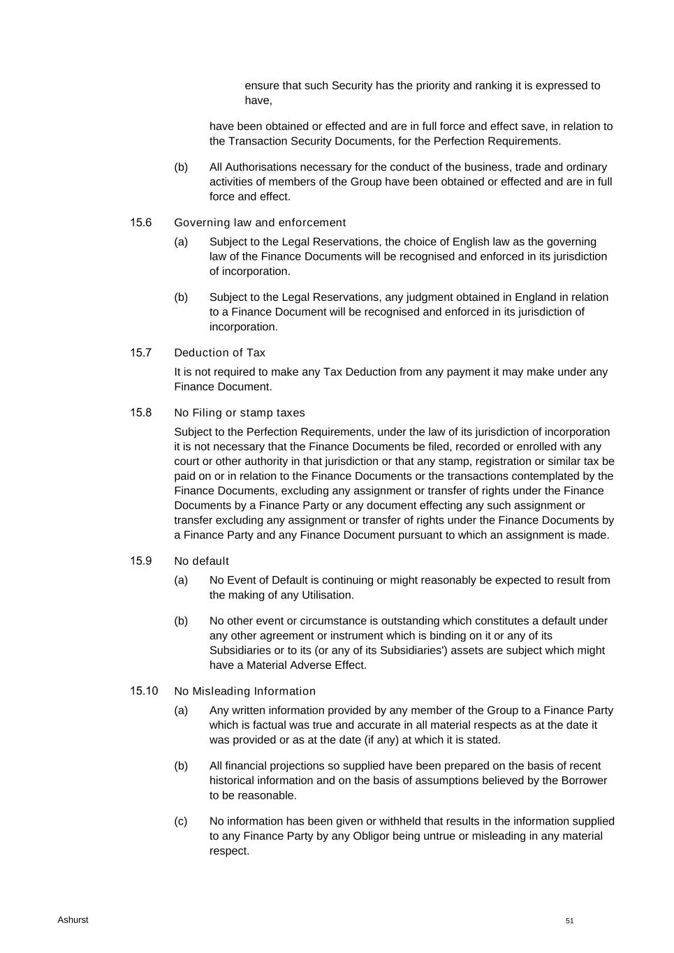 Ashurst 51 ensure that such Security has the priority and ranking it is expressed to have, have been obtained or effected and are in full force and effect save, in relation to the Transaction Security Documents, for the Perfection Requirements. (b) All Authorisations necessary for the conduct of the business, trade and ordinary activities of members of the Group have been obtained or effected and are in full force and effect. Governing law and enforcement (a) Subject to the Legal Reservations, the choice of English law as the governing law of the Finance Documents will be recognised and enforced in its jurisdiction of incorporation. (b) Subject to the Legal Reservations, any judgment obtained in England in relation to a Finance Document will be recognised and enforced in its jurisdiction of incorporation. Deduction of Tax It is not required to make any Tax Deduction from any payment it may make under any Finance Document. No Filing or stamp taxes Subject to the Perfection Requirements, under the law of its jurisdiction of incorporation it is not necessary that the Finance Documents be filed, recorded or enrolled with any court or other authority in that jurisdiction or that any stamp, registration or similar tax be paid on or in relation to the Finance Documents or the transactions contemplated by the Finance Documents, excluding any assignment or transfer of rights under the Finance Documents by a Finance Party or any document effecting any such assignment or transfer excluding any assignment or transfer of rights under the Finance Documents by a Finance Party and any Finance Document pursuant to which an assignment is made. No default (a) No Event of Default is continuing or might reasonably be expected to result from the making of any Utilisation. (b) No other event or circumstance is outstanding which constitutes a default under any other agreement or instrument which is binding on it or any of its Subsidiaries or to its (or any of its Subsidiaries') assets are subject which might have a Material Adverse Effect. No Misleading Information (a) Any written information provided by any member of the Group to a Finance Party which is factual was true and accurate in all material respects as at the date it was provided or as at the date (if any) at which it is stated. (b) All financial projections so supplied have been prepared on the basis of recent historical information and on the basis of assumptions believed by the Borrower to be reasonable. (c) No information has been given or withheld that results in the information supplied to any Finance Party by any Obligor being untrue or misleading in any material respect.