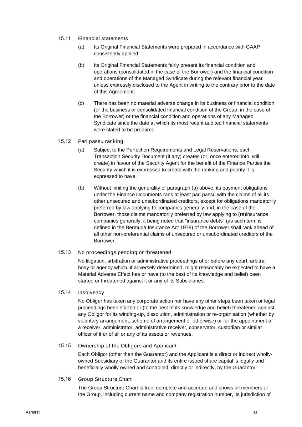 Ashurst 52 Financial statements (a) Its Original Financial Statements were prepared in accordance with GAAP consistently applied. (b) Its Original Financial Statements fairly present its financial condition and operations (consolidated in the case of the Borrower) and the financial condition and operations of the Managed Syndicate during the relevant financial year unless expressly disclosed to the Agent in writing to the contrary prior to the date of this Agreement. (c) There has been no material adverse change in its business or financial condition (or the business or consolidated financial condition of the Group, in the case of the Borrower) or the financial condition and operations of any Managed Syndicate since the date at which its most recent audited financial statements were stated to be prepared. Pari passu ranking (a) Subject to the Perfection Requirements and Legal Reservations, each Transaction Security Document (if any) creates (or, once entered into, will create) in favour of the Security Agent for the benefit of the Finance Parties the Security which it is expressed to create with the ranking and priority it is expressed to have. (b) Without limiting the generality of paragraph (a) above, its payment obligations under the Finance Documents rank at least pari passu with the claims of all its other unsecured and unsubordinated creditors, except for obligations mandatorily preferred by law applying to companies generally and, in the case of the Borrower, those claims mandatorily preferred by law applying to (re)insurance companies generally, it being noted that "insurance debts" (as such term is defined in the Bermuda Insurance Act 1978) of the Borrower shall rank ahead of all other non-preferential claims of unsecured or unsubordinated creditors of the Borrower. No proceedings pending or threatened No litigation, arbitration or administrative proceedings of or before any court, arbitral body or agency which, if adversely determined, might reasonably be expected to have a Material Adverse Effect has or have (to the best of its knowledge and belief) been started or threatened against it or any of its Subsidiaries. Insolvency No Obligor has taken any corporate action nor have any other steps been taken or legal proceedings been started or (to the best of its knowledge and belief) threatened against any Obligor for its winding-up, dissolution, administration or re-organisation (whether by voluntary arrangement, scheme of arrangement or otherwise) or for the appointment of a receiver, administrator, administrative receiver, conservator, custodian or similar officer of it or of all or any of its assets or revenues. Ownership of the Obligors and Applicant Each Obligor (other than the Guarantor) and the Applicant is a direct or indirect wholly- owned Subsidiary of the Guarantor and its entire issued share capital is legally and beneficially wholly owned and controlled, directly or indirectly, by the Guarantor. Group Structure Chart The Group Structure Chart is true, complete and accurate and shows all members of the Group, including current name and company registration number, its jurisdiction of