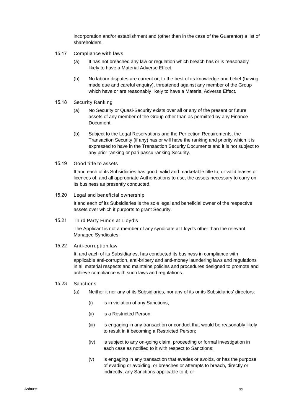 Ashurst 53 incorporation and/or establishment and (other than in the case of the Guarantor) a list of shareholders. Compliance with laws (a) It has not breached any law or regulation which breach has or is reasonably likely to have a Material Adverse Effect. (b) No labour disputes are current or, to the best of its knowledge and belief (having made due and careful enquiry), threatened against any member of the Group which have or are reasonably likely to have a Material Adverse Effect. Security Ranking (a) No Security or Quasi-Security exists over all or any of the present or future assets of any member of the Group other than as permitted by any Finance Document. (b) Subject to the Legal Reservations and the Perfection Requirements, the Transaction Security (if any) has or will have the ranking and priority which it is expressed to have in the Transaction Security Documents and it is not subject to any prior ranking or pari passu ranking Security. Good title to assets It and each of its Subsidiaries has good, valid and marketable title to, or valid leases or licences of, and all appropriate Authorisations to use, the assets necessary to carry on its business as presently conducted. Legal and beneficial ownership It and each of its Subsidiaries is the sole legal and beneficial owner of the respective assets over which it purports to grant Security. Third Party Funds at Lloyd's The Applicant is not a member of any syndicate at Lloyd's other than the relevant Managed Syndicates. Anti-corruption law It, and each of its Subsidiaries, has conducted its business in compliance with applicable anti-corruption, anti-bribery and anti-money laundering laws and regulations in all material respects and maintains policies and procedures designed to promote and achieve compliance with such laws and regulations. Sanctions (a) Neither it nor any of its Subsidiaries, nor any of its or its Subsidiaries' directors: (i) is in violation of any Sanctions; (ii) is a Restricted Person; (iii) is engaging in any transaction or conduct that would be reasonably likely to result in it becoming a Restricted Person; (iv) is subject to any on-going claim, proceeding or formal investigation in each case as notified to it with respect to Sanctions; (v) is engaging in any transaction that evades or avoids, or has the purpose of evading or avoiding, or breaches or attempts to breach, directly or indirectly, any Sanctions applicable to it; or