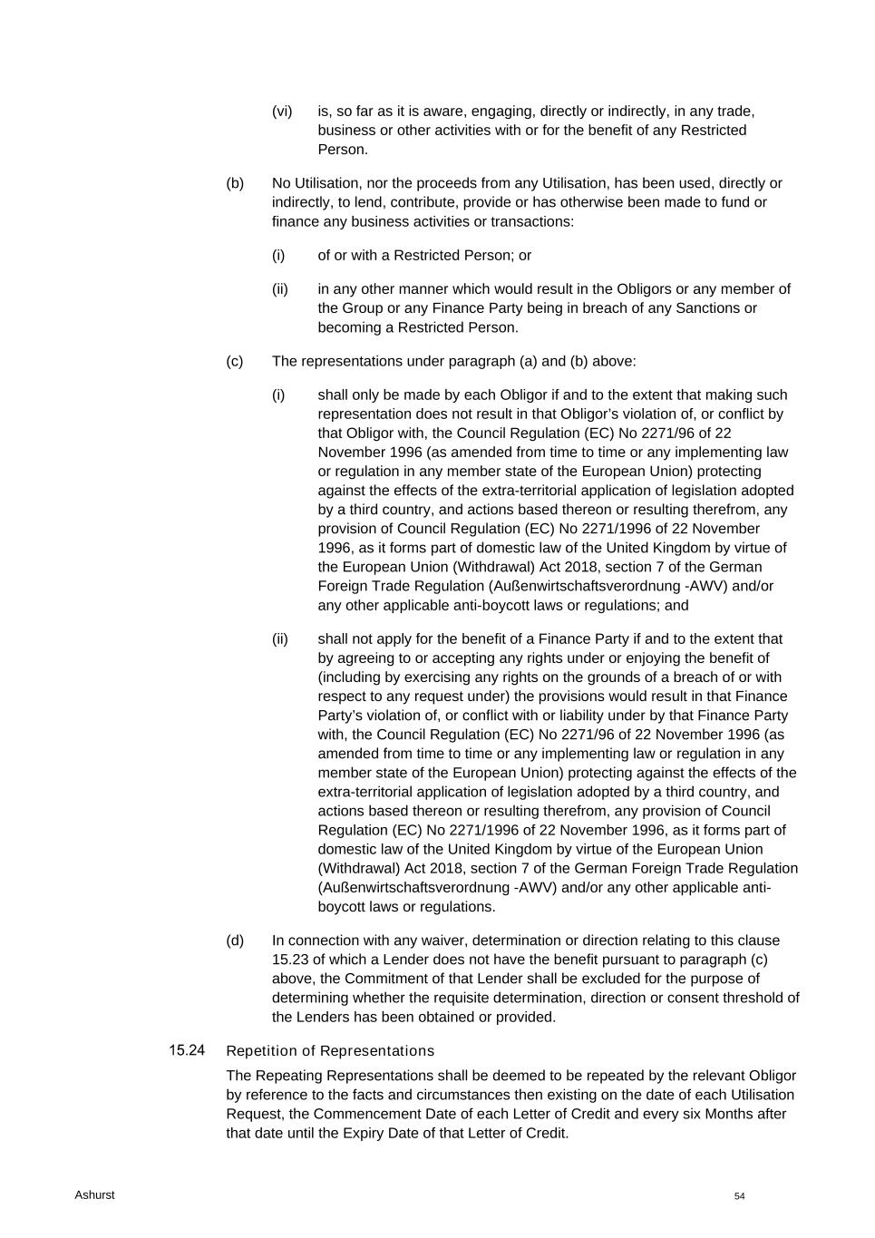 Ashurst 54 (vi) is, so far as it is aware, engaging, directly or indirectly, in any trade, business or other activities with or for the benefit of any Restricted Person. (b) No Utilisation, nor the proceeds from any Utilisation, has been used, directly or indirectly, to lend, contribute, provide or has otherwise been made to fund or finance any business activities or transactions: (i) of or with a Restricted Person; or (ii) in any other manner which would result in the Obligors or any member of the Group or any Finance Party being in breach of any Sanctions or becoming a Restricted Person. (c) The representations under paragraph (a) and (b) above: (i) shall only be made by each Obligor if and to the extent that making such representation does not result in that Obligor’s violation of, or conflict by that Obligor with, the Council Regulation (EC) No 2271/96 of 22 November 1996 (as amended from time to time or any implementing law or regulation in any member state of the European Union) protecting against the effects of the extra-territorial application of legislation adopted by a third country, and actions based thereon or resulting therefrom, any provision of Council Regulation (EC) No 2271/1996 of 22 November 1996, as it forms part of domestic law of the United Kingdom by virtue of the European Union (Withdrawal) Act 2018, section 7 of the German Foreign Trade Regulation (Außenwirtschaftsverordnung -AWV) and/or any other applicable anti-boycott laws or regulations; and (ii) shall not apply for the benefit of a Finance Party if and to the extent that by agreeing to or accepting any rights under or enjoying the benefit of (including by exercising any rights on the grounds of a breach of or with respect to any request under) the provisions would result in that Finance Party’s violation of, or conflict with or liability under by that Finance Party with, the Council Regulation (EC) No 2271/96 of 22 November 1996 (as amended from time to time or any implementing law or regulation in any member state of the European Union) protecting against the effects of the extra-territorial application of legislation adopted by a third country, and actions based thereon or resulting therefrom, any provision of Council Regulation (EC) No 2271/1996 of 22 November 1996, as it forms part of domestic law of the United Kingdom by virtue of the European Union (Withdrawal) Act 2018, section 7 of the German Foreign Trade Regulation (Außenwirtschaftsverordnung -AWV) and/or any other applicable anti- boycott laws or regulations. (d) In connection with any waiver, determination or direction relating to this clause 15.23 of which a Lender does not have the benefit pursuant to paragraph (c) above, the Commitment of that Lender shall be excluded for the purpose of determining whether the requisite determination, direction or consent threshold of the Lenders has been obtained or provided. Repetition of Representations The Repeating Representations shall be deemed to be repeated by the relevant Obligor by reference to the facts and circumstances then existing on the date of each Utilisation Request, the Commencement Date of each Letter of Credit and every six Months after that date until the Expiry Date of that Letter of Credit.